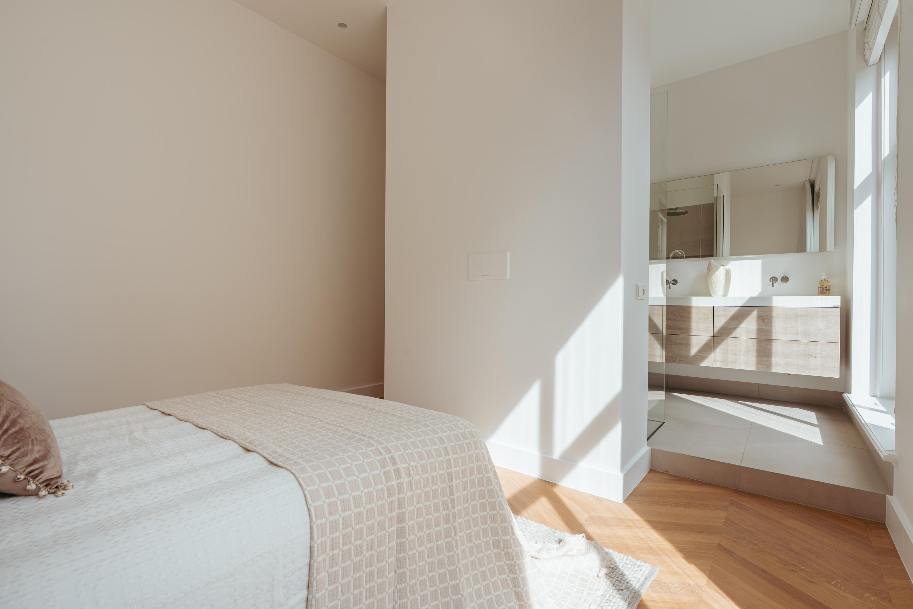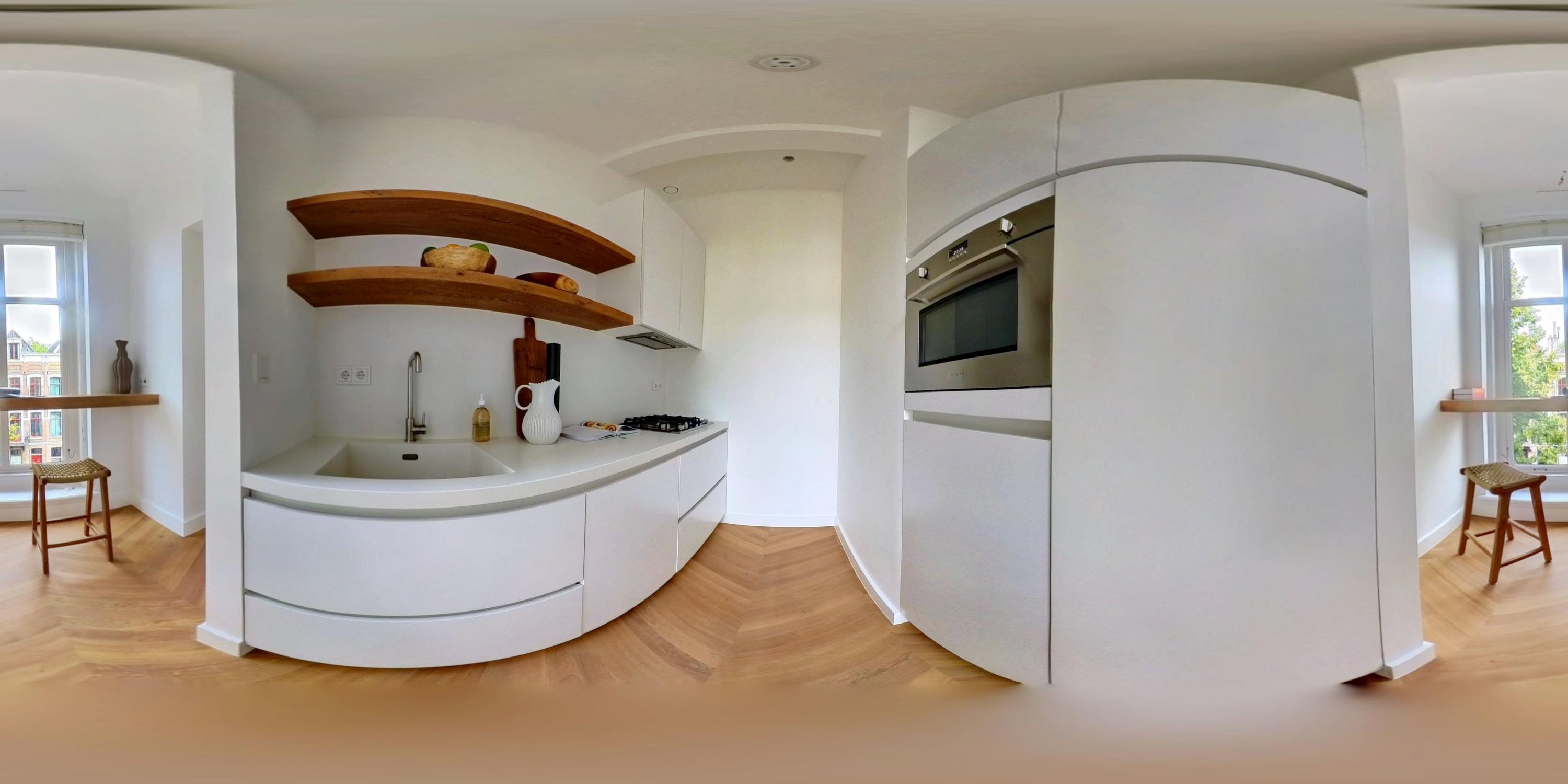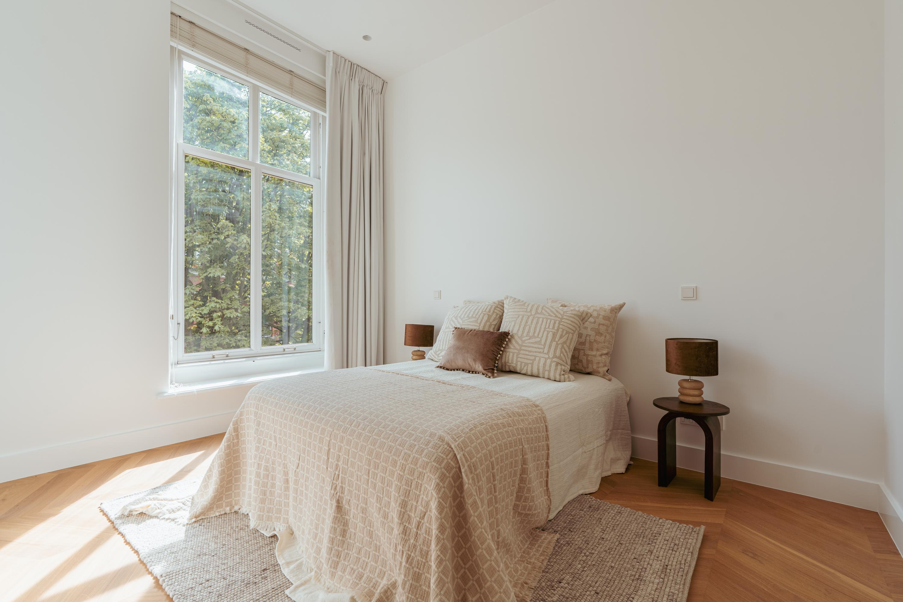 Apartment Amsterdam Vondelpark neighbourhood, measuring approximately 85 m², is set within a monumental building, offering a sense of quiet distinction in one of the city’s most beloved neighbourhoods. This second-floor residence has been fully renovated, with details such as over three-metre-high ceilings, elegant bay windows, and a wood-burning fireplace that anchor the main living space in calm, natural light. The layout is intuitive—a spacious hall connects all rooms. Two generously sized bedrooms each have private en-suite bathrooms with walk-in showers and thoughtful built-in wardrobes. The semi-open kitchen, equipped with luxury integrated appliances and a bar counter, invites both casual mornings and evenings shared with friends. Mechanical ventilation, underfloor heating, and lift access further elevate day-to-day comfort. Freehold tenure affords peace of mind.