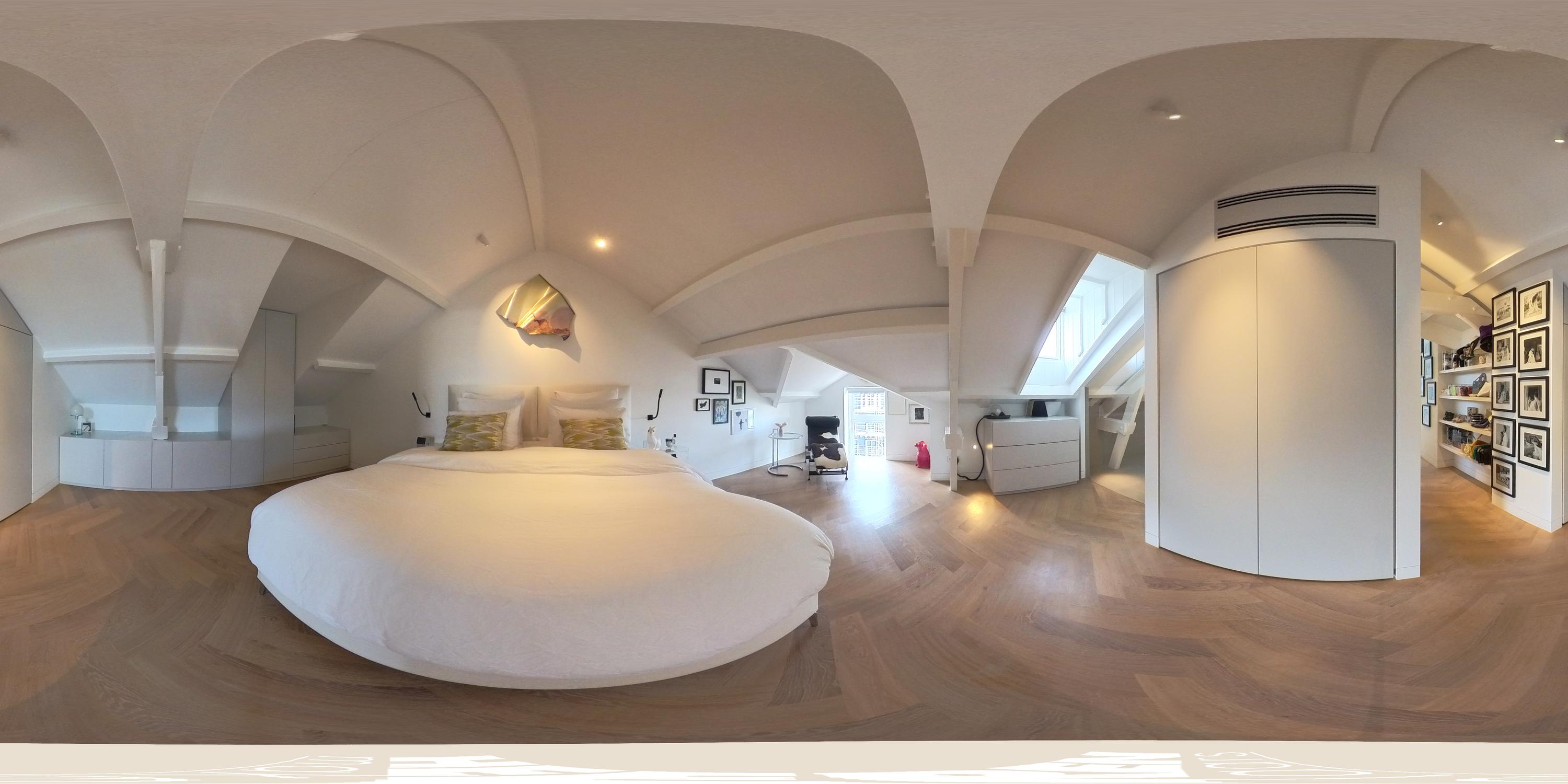 The spacious master bedroom, accessible from the living room, exudes calm and luxury. Exposed beams add character, while smart built-in storage solutions under the sloped ceilings ensure optimal use of space. Air conditioning is also installed here for maximum comfort. The adjoining en-suite bathroom is generously sized and finished to a high standard, featuring a double vanity, freestanding bathtub, walk-in rain shower, and toilet.