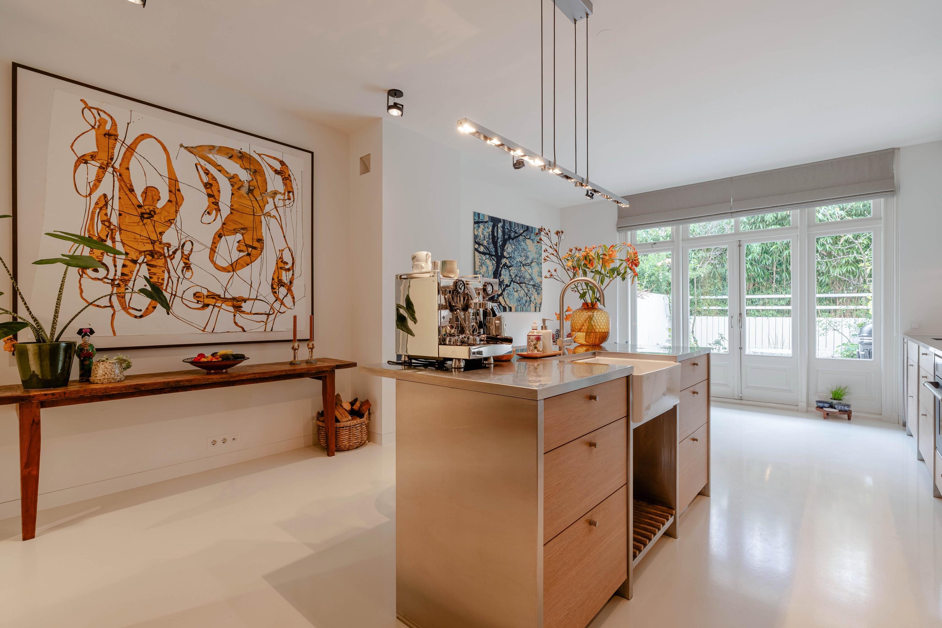 Through the entrance, you arrive in the generous hallway, where the tone of the house is set by the high ceilings and the beautiful original details preserved throughout much of the property. From here, you access the expansive kitchen-diner at the rear. This bespoke kitchen has been meticulously designed and equipped with high-end appliances, including two sinks—one fitted with a Quooker— a five-burner gas hob with extractor fan, separate oven, microwave, full-size refrigerator, freezer, dishwasher, and a warming drawer, ideal for preparing larger dinners. A fireplace adds warmth and charm to the space.
