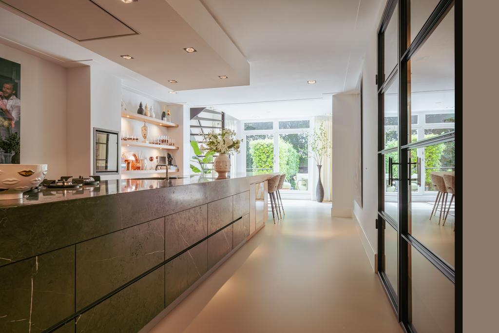 To the front is a bedroom with an en-suite bathroom featuring a washbasin and walk-in shower—currently used as a home gym, but easily repurposed. At the rear is the stunning open-plan kitchen, the centerpiece of this level. Outfitted with Gaggenau appliances, including a fridge, freezer, Quooker, five-burner gas stove integrated into the counter, oven, steam oven, dishwasher, and wine fridge, the kitchen combines luxury and functionality. A solid natural stone countertop with a wooden breakfast bar provides a warm, refined look.