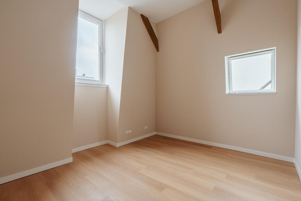 A fixed staircase leads to the top floor, where the landing again offers a separate toilet. On either side are two spacious bedrooms, both equipped with air conditioning. The exposed wooden beams add charm and character to the rooms, enhanced by the impressive ceiling height of 3.70 metres. From one of the bedrooms, there is access to the attic loft with additional storage space of approximately 12 m².