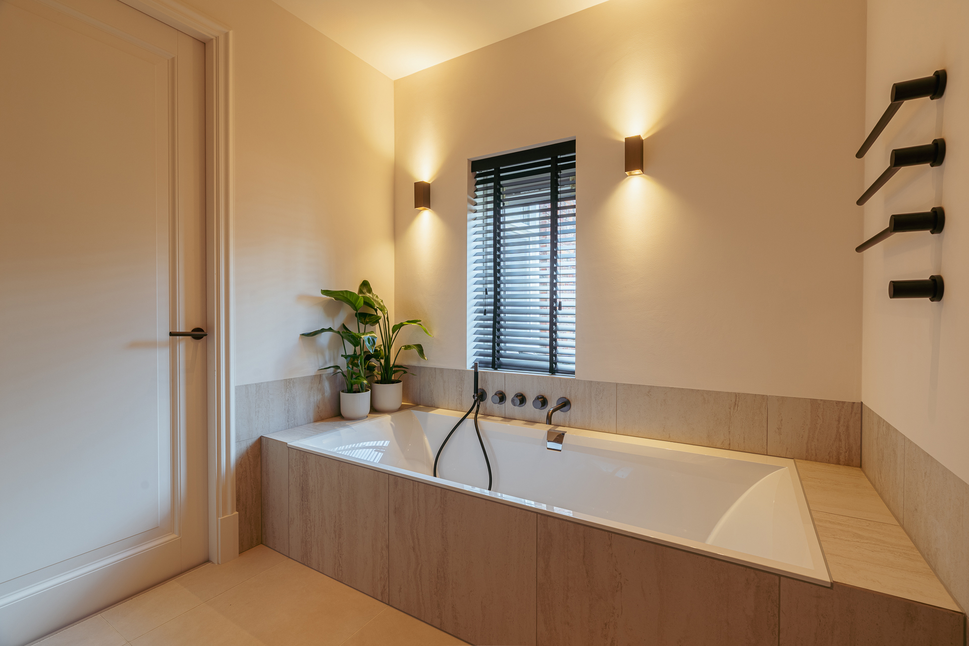 From the hallway, you have access to the bathroom and two bedrooms. The first, at the front, is multifunctional and perfectly suited as a children’s room, study, or home office. This room also houses the renewed meter cupboard with 3-phase connection. At the rear is the master bedroom, fitted with elegant built-in wardrobes and with direct access to the luxurious bathroom. The bathroom is equipped with a Villeroy & Boch bathtub, walk-in shower, and a stylish natural stone washbasin. A smart integrated sliding door allows you to separate the bathroom from the bedroom if desired.