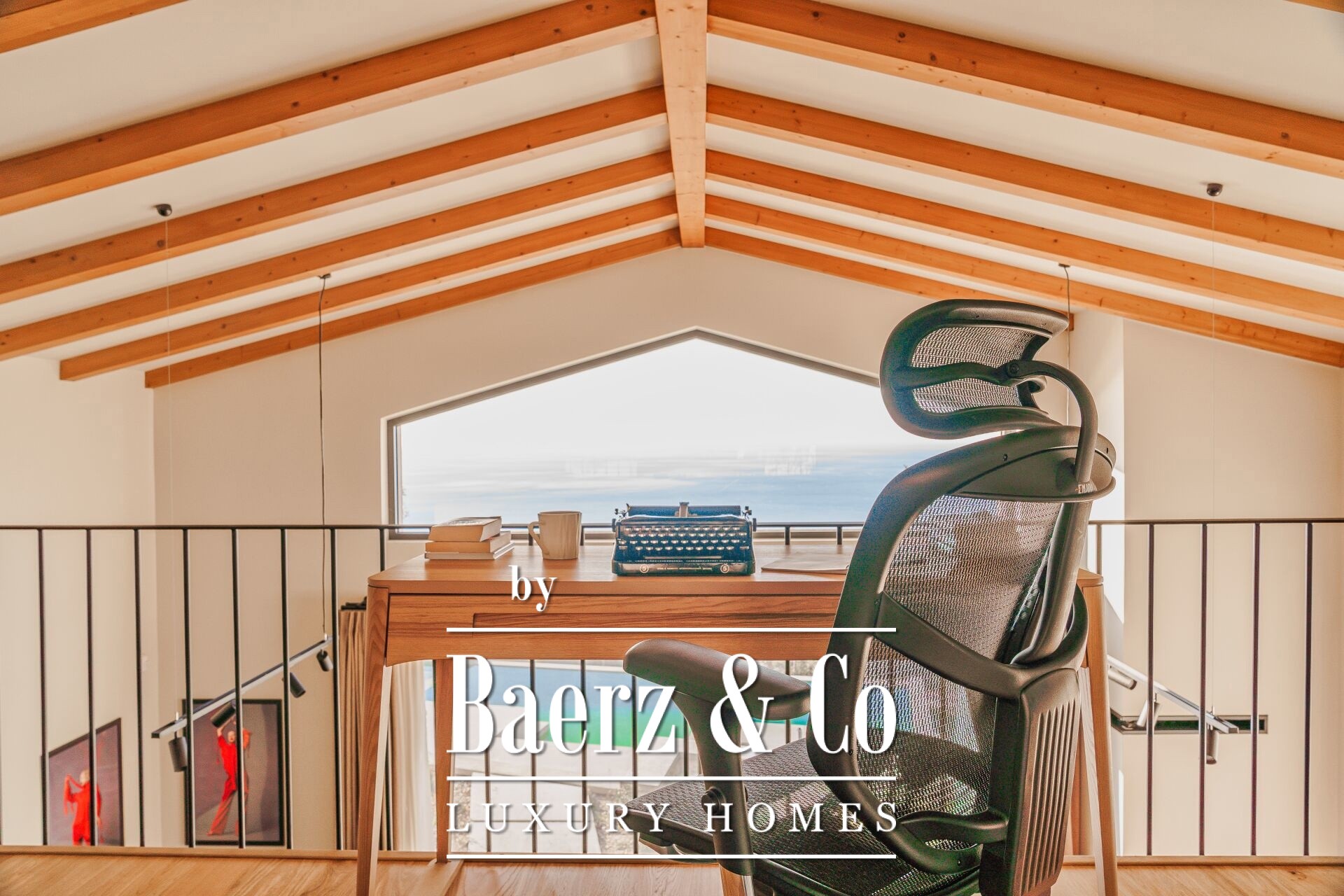 The outdoor area has been designed for relaxation and enjoyment of the stunning views. It features an outdoor dining area, a comfortable lounge area, a covered BBQ space, and a swimming pool with a separate section for small children, ideal for families and carefree moments.