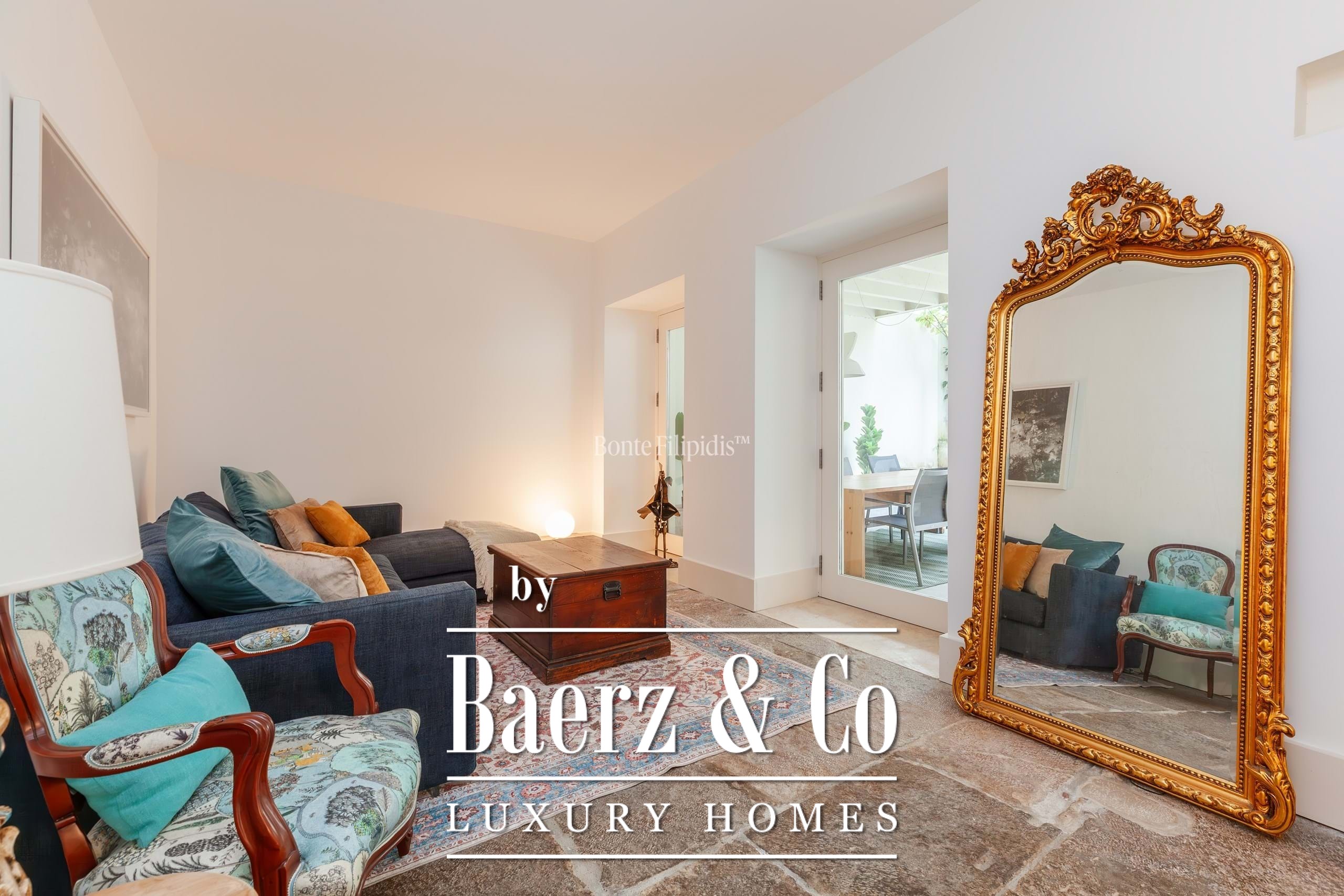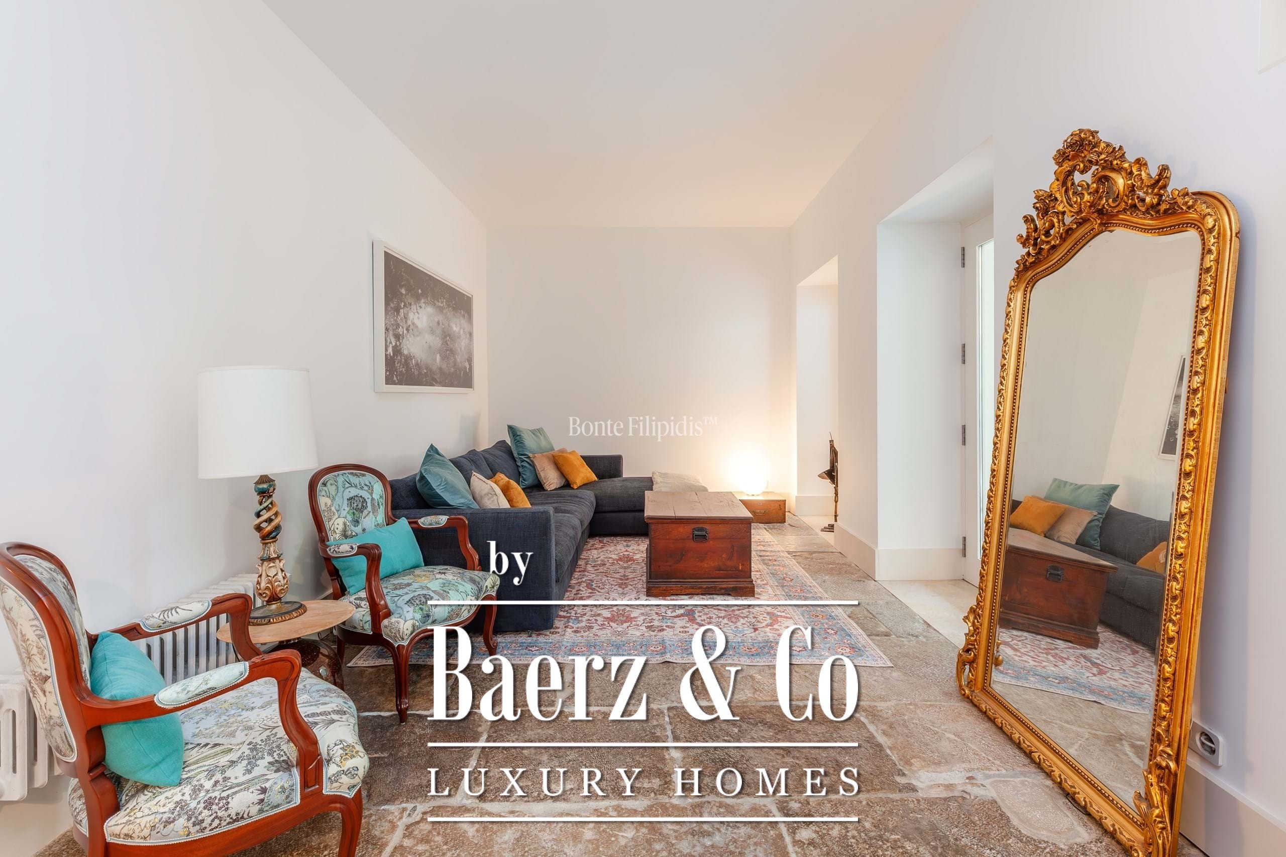 The primary living spaces are marked by original stone flooring and softly vintage accents, with large panoramic windows drawing natural light into the open-plan social area. Here, living and dining zones flow seamlessly out to an 80 m² private garden, a tranquil retreat bordered by mature greenery for quiet moments or reserved gatherings. Subtle material choices and precise detailing lend an understated sophistication to every space.