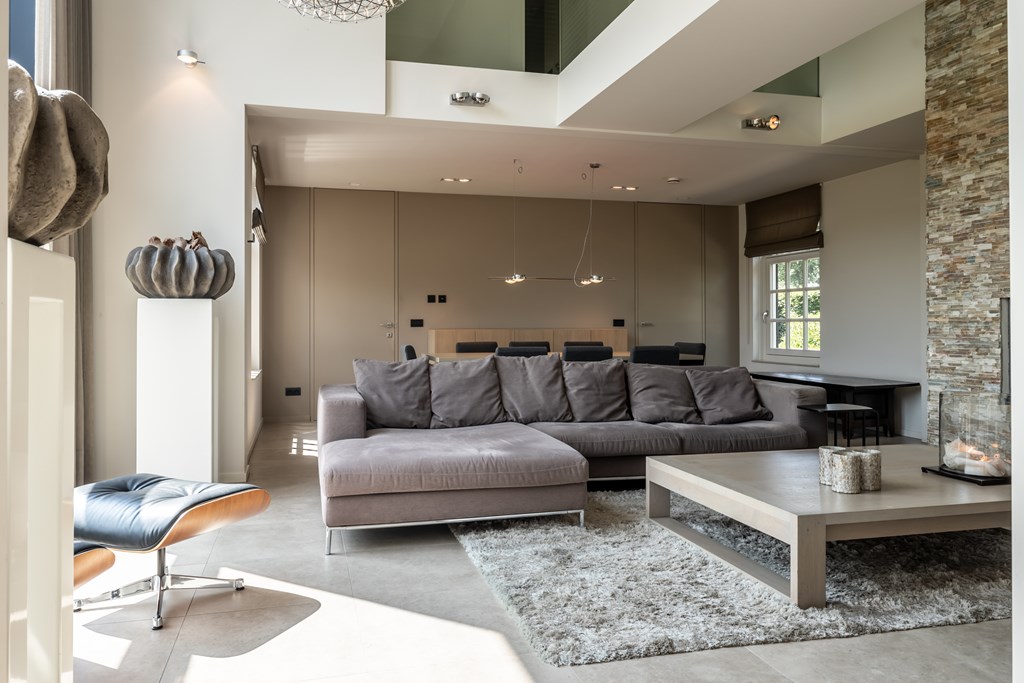 De woonkamer is voorzien van een keramische tegelvloer met vloerverwarming, inbouwverlichting, plafondverwarming en een gashaard. Door de grote glasgevel aan de achterzijde van het huis komt er veel natuurlijk lichtinval de woning binnen. Dankzij de grote glasgevel staat u vanuit de woonkamer altijd in verbinding met de tuin.