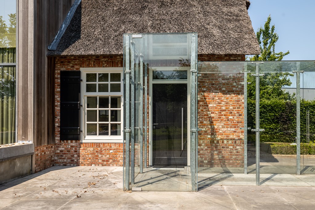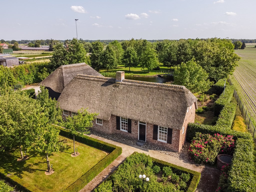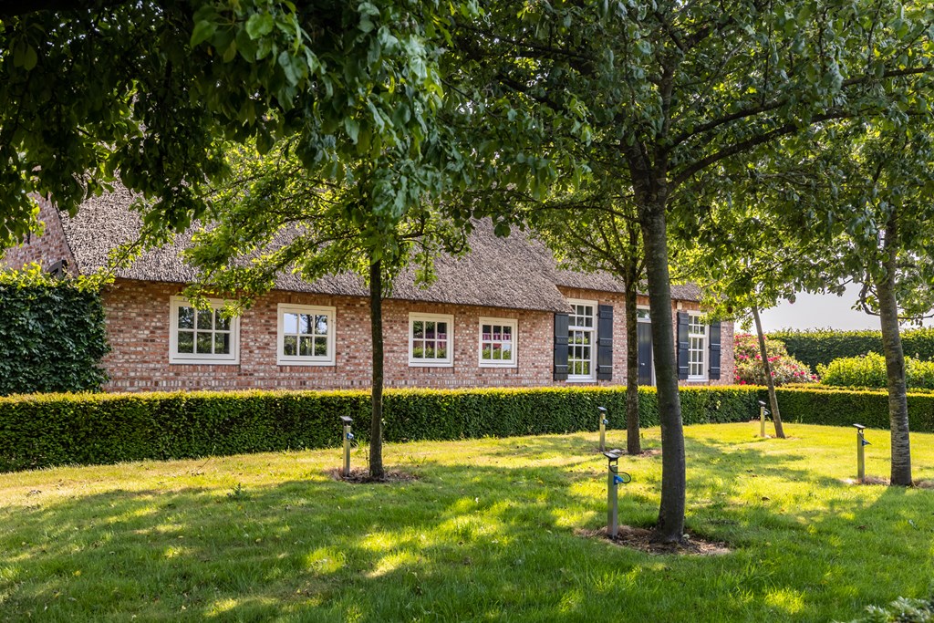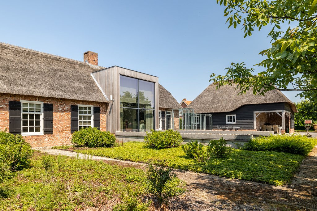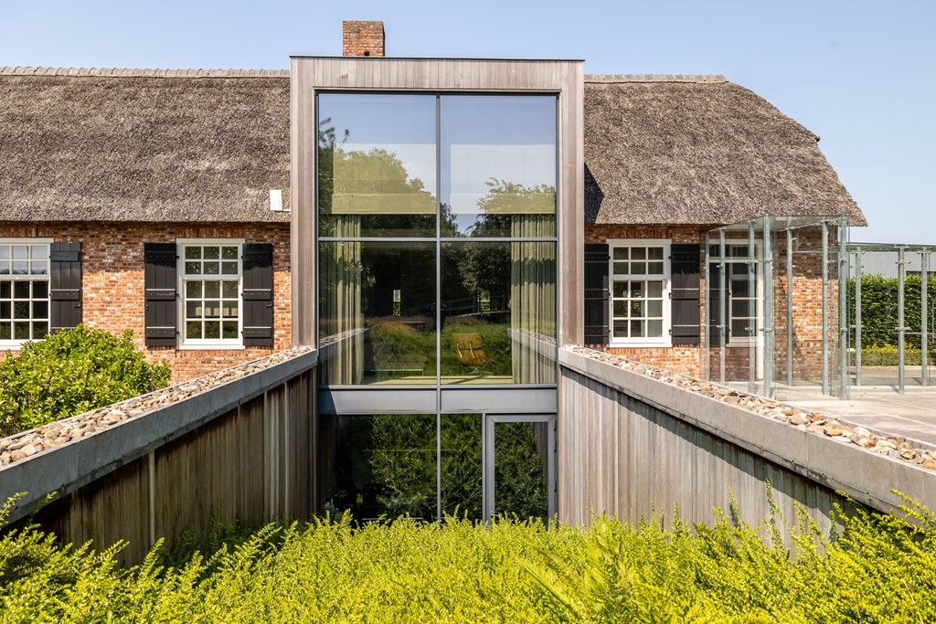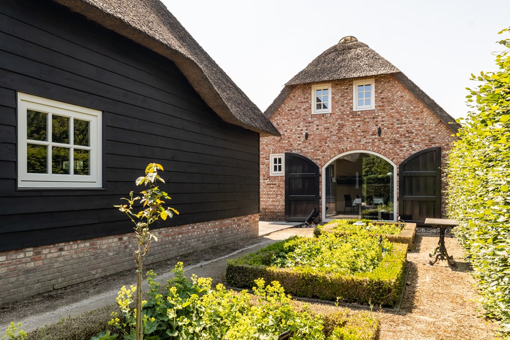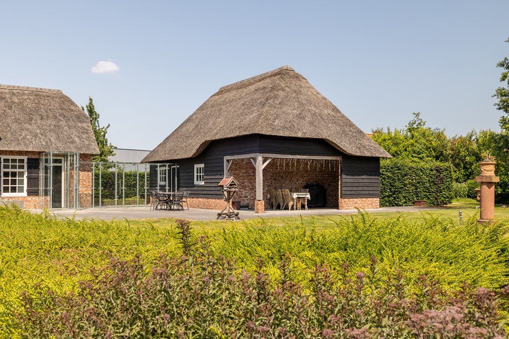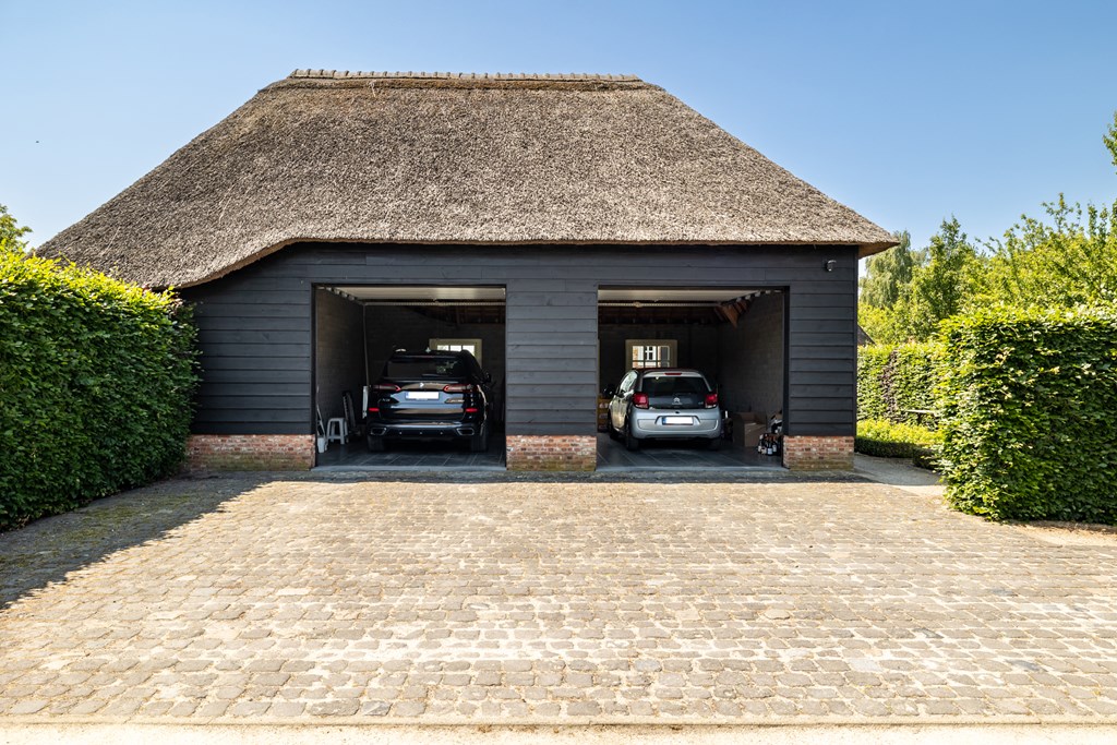 De garage die middels een glazen doorgang met het woonhuis is verbonden is net zoals het hoofdverblijf voorzien van een rieten dak. De dubbele garage heeft elektrisch bedienbare segmentdeuren en biedt plaats aan twee auto’s.