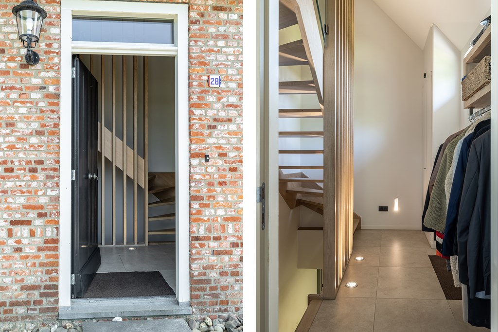 Middels de keurig aangelegde voortuin met oprit en parkeerplaatsen voor meerdere auto’s, bereikt u de entree van de woning. De hal is voorzien van een garderobe, meterkast en inbouwverlichting. Vanuit de hal heeft u toegang tot de verdieping, de souterrain en de woonkamer.
