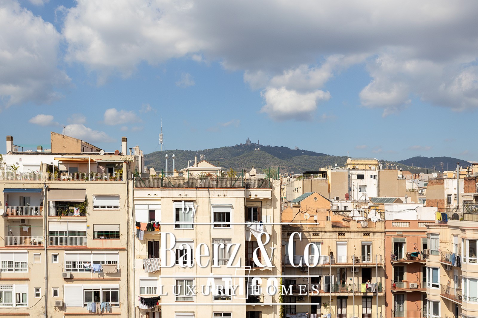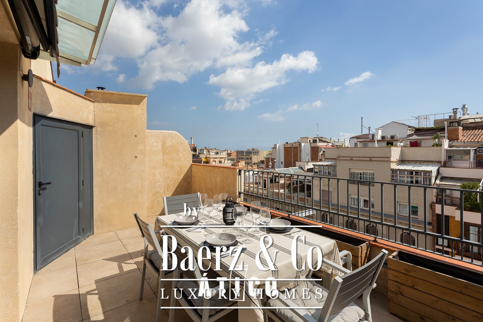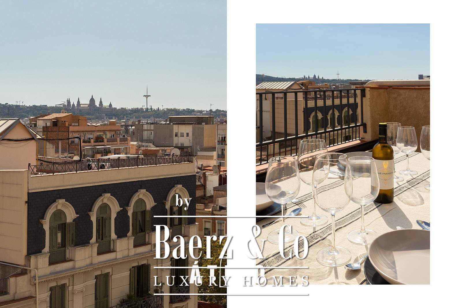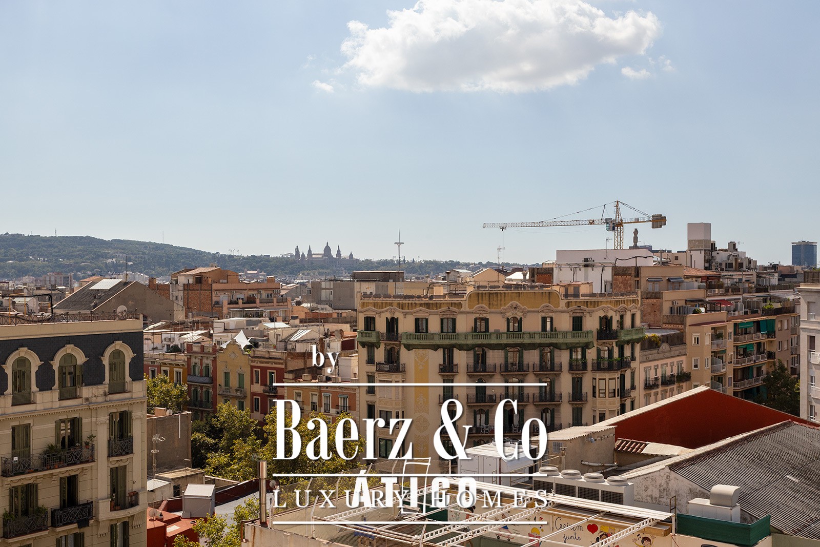 In the Eixample Izquierdo, a step away from Calle Enric Granados, known for its bars, terraces and cosmopolitan atmosphere and just six minutes' walk from the vibrant and elegant Rambla Catalunya, you will find this 104 m² penthouse plus 32 m of terraces. An authentic urban refuge that combines modern comfort with the charm of Barcelona life. Practically new and with an impeccable distribution, this home has been designed to enjoy every corner. The heart of the house is the large living-dining room with open kitchen, an open and welcoming space that extends towards a magnificent 16 m² terrace facing the sea. Enjoying a majestic view that combines the grandeur of the National Palace with the serenity of the Montjuïc mountain. An ideal place to organize dinners, have a drink in the evening or simply let yourself be lifted by the tranquility of the elevated environment. The main suite, spacious and bathed in natural light, has an elegant dressing room and an en suite bathroom. From it there is direct access to a second terrace of 14m², facing Tibidabo and the emblematic "island" of the Eixample, an icon of Barcelona urbanism. This double orientation provides sun throughout the day and unobstructed views that fill the space with calm and clarity. At night, the illuminated silhouette of Tibidabo adds a special charm, turning this stay into an authentic refuge with a serene and privileged atmosphere. The house is completed by a second double bedroom, with natural light and a second bathroom with bathtub, ideal for offering comfort and privacy to guests or to adapt to different needs. The kitchen, modern, functional and bathed in natural light, has custom-made furniture and is fully equipped with high-end appliances, as well as a wine bar, ideal for those who value details and enjoy the art of entertaining at home. The finishes reflect the quality and care