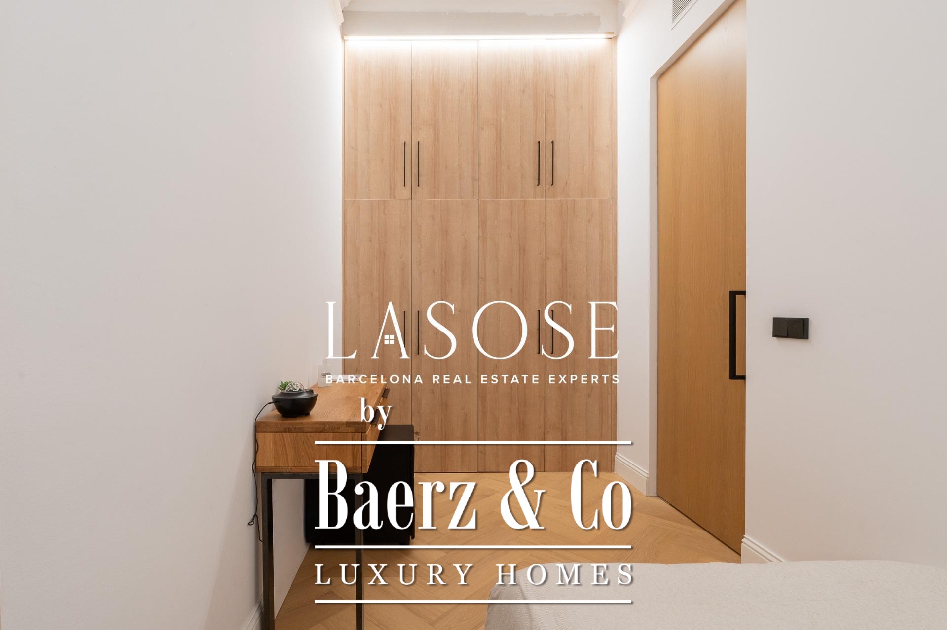 The apartment’s layout is defined by a spacious independent living and dining room with high ceilings, three bedrooms—including a refined en-suite, one double, and one single—and two full bathrooms. A fully equipped kitchen features contemporary design with premium materials, providing a seamless blend of modernity and tradition. A balcony of about 4.61 square meters offers light, city views, and a direct connection to the atmosphere of Carrer de Casp.