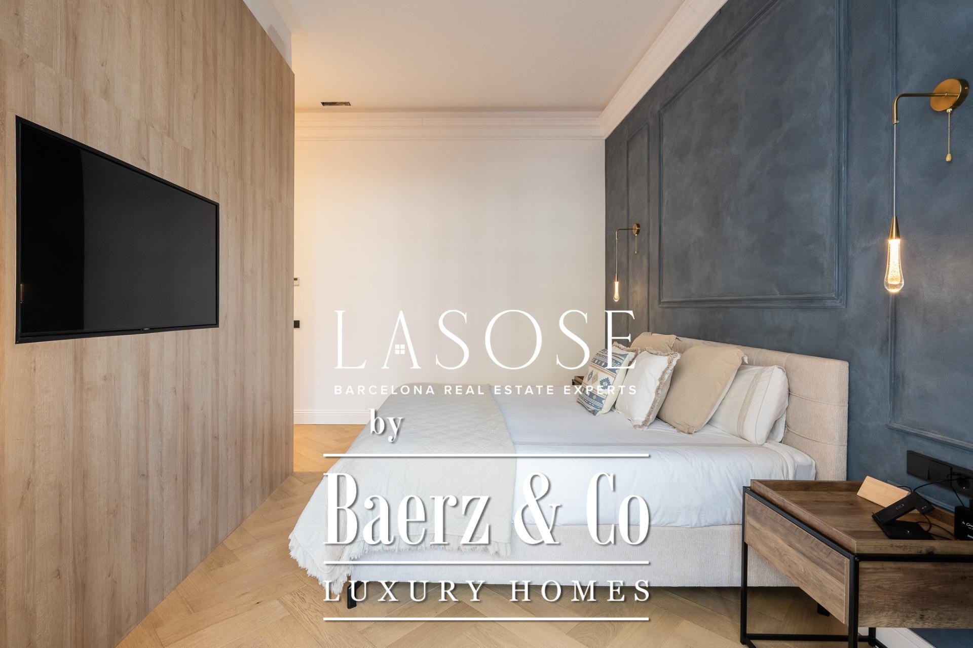 This Modernist apartment Barcelona Quadrat d'Or is a rare opportunity, offering 150 square meters of meticulously restored interior space and an extraordinary rear terrace spanning approximately 100 square meters. The residence, part of a protected building, was completely refurbished in 2024 with high-end finishes. Heritage details have been preserved, including natural oak exterior woodwork, tall interior doors, and unique fitted wardrobes, all contributing to a sense of enduring quality.