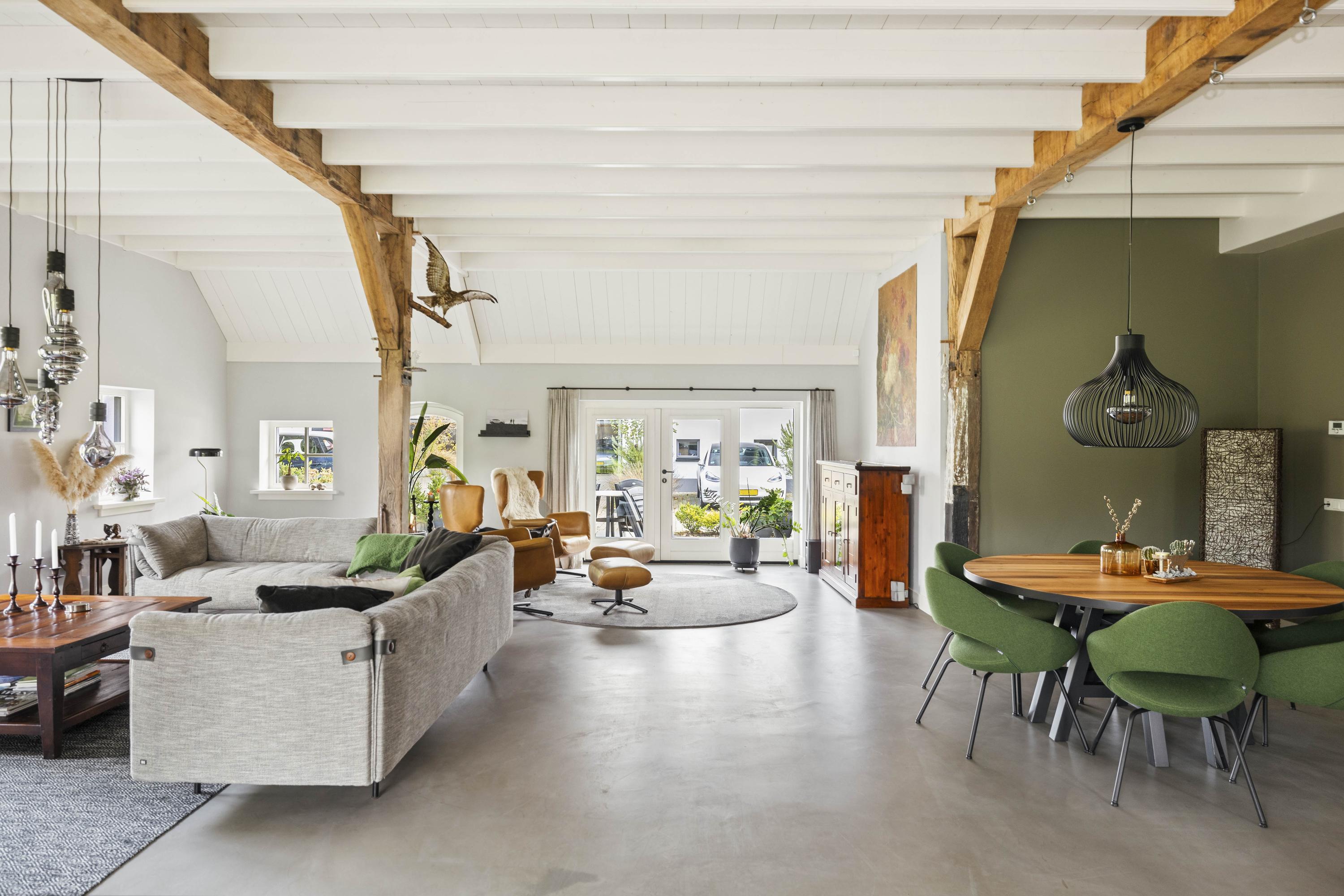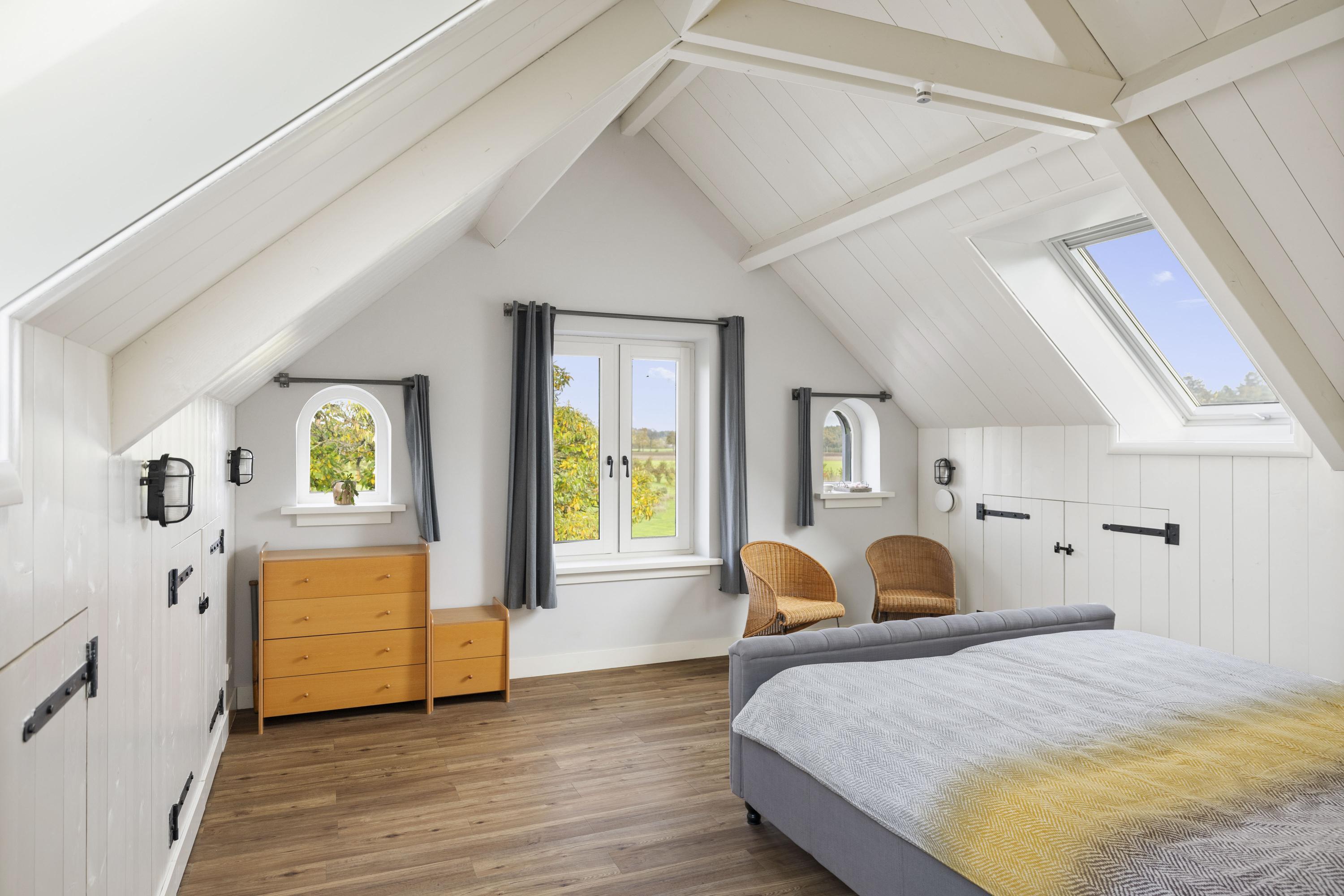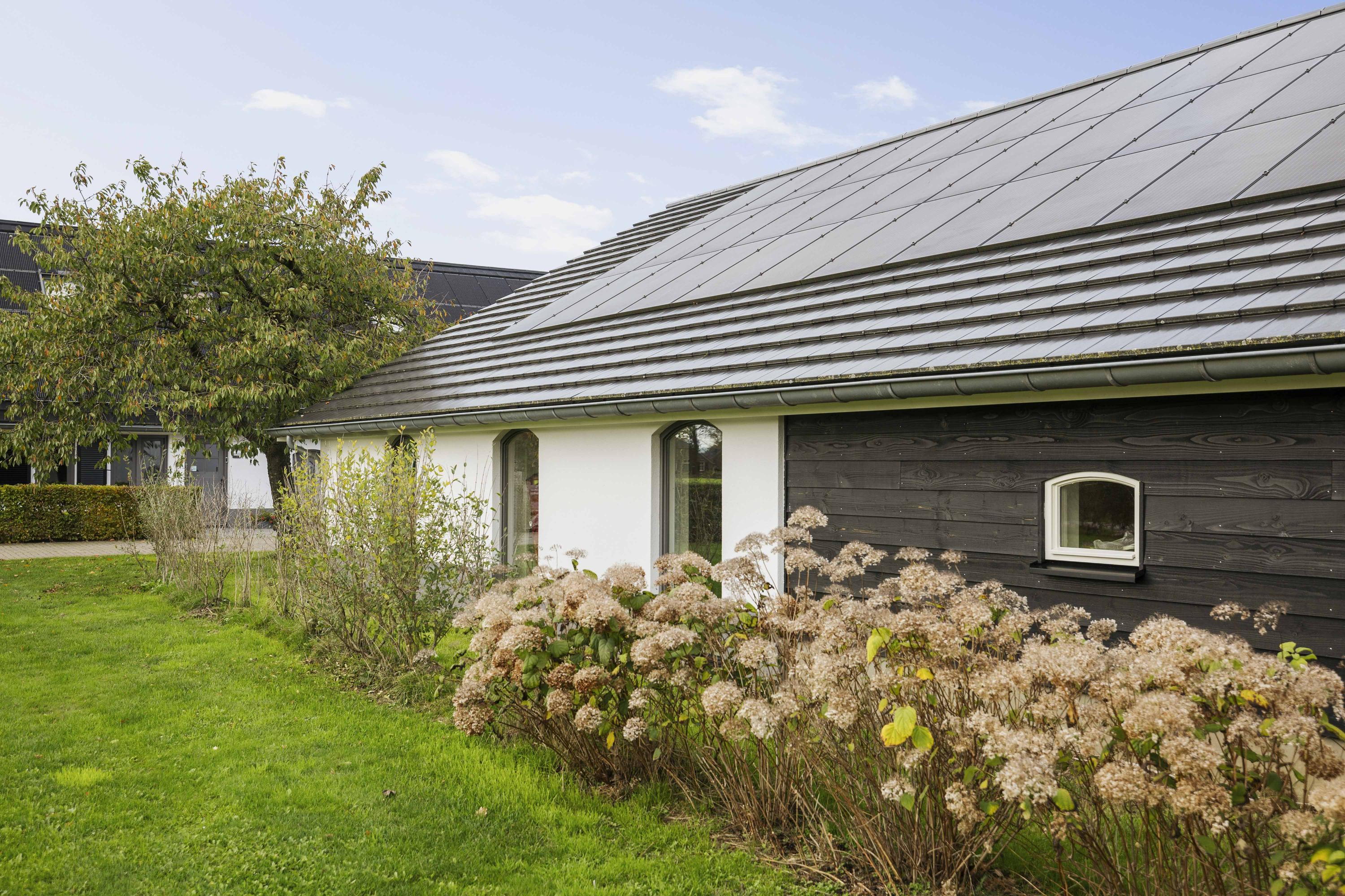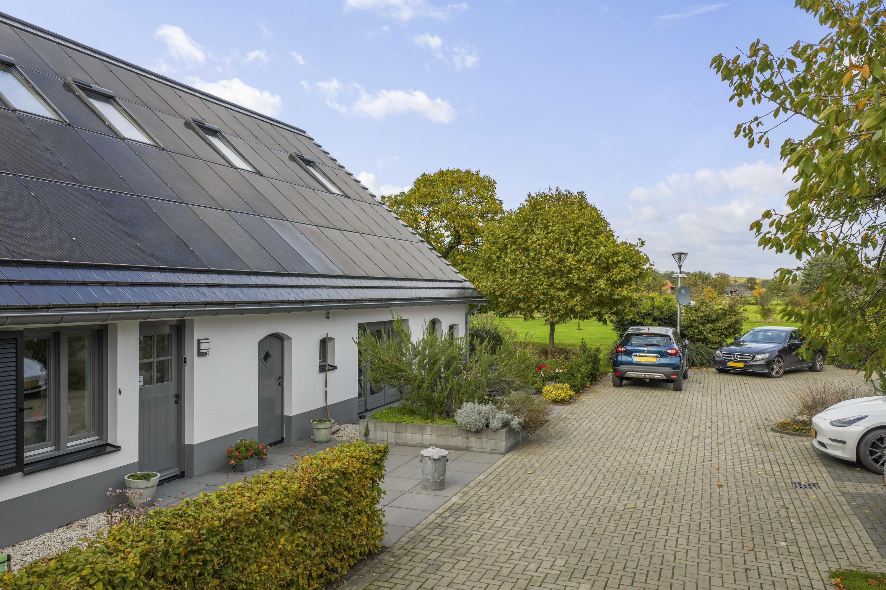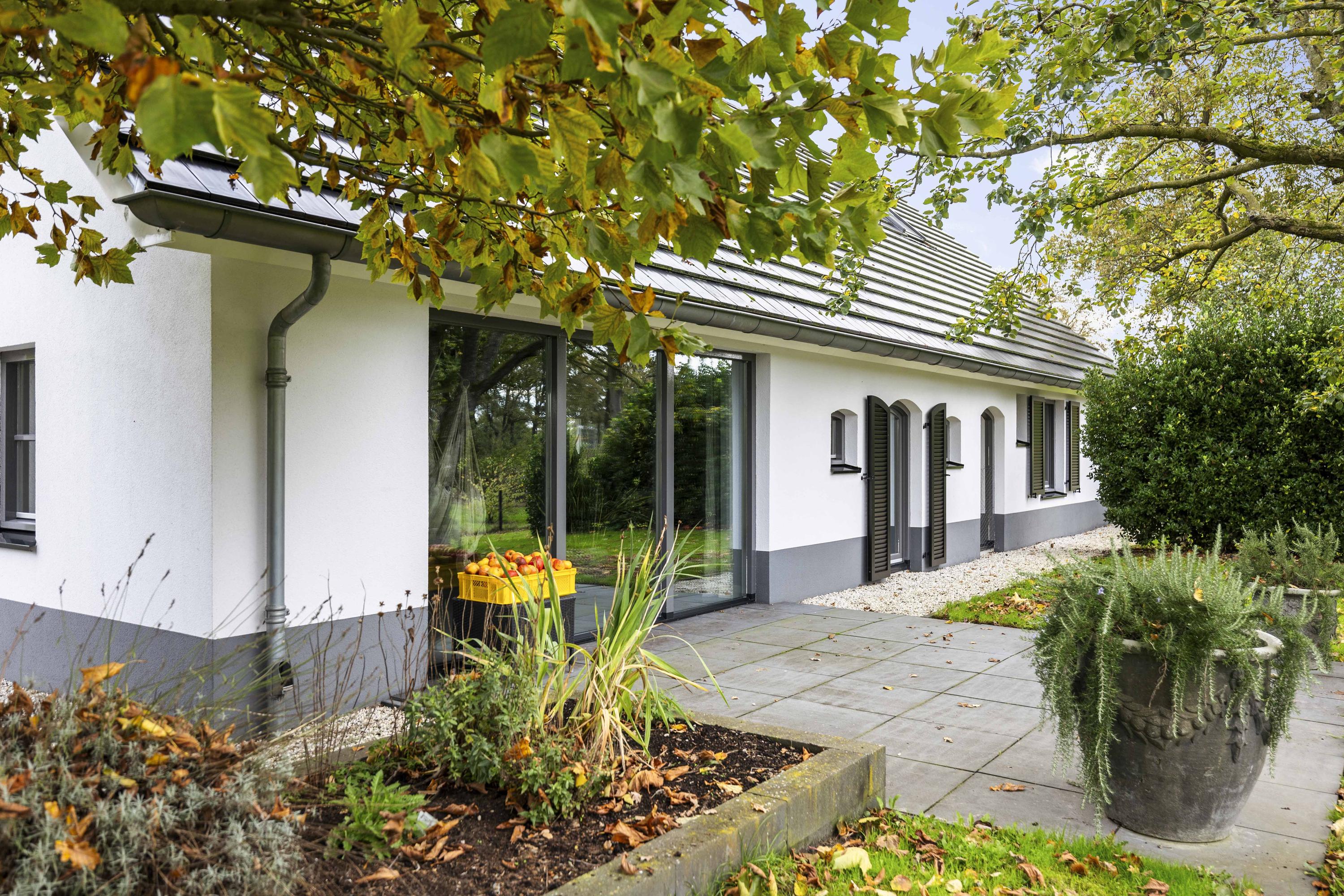 This magnificent farmhouse took on its current form in 2016, when the farm, which was built in 1924, was completely renovated. The emphasis was on sustainability: the exterior was fully insulated with polystyrene blocks, the house was fitted with new HR+++ glass all around, a water-water heat pump was installed (which exchanges and extracts heat at a depth of 75 metres), the interior floor was fitted with a robust cast floor – ideal in combination with underfloor heating – and a total of 110 (no, this is not a typo) solar panels were installed on the roofs. Under the bonnet, this house is all state-of-the-art technical ingenuity. Even the colour palette – the exterior is whitewashed with grey woodwork and beaded edging – contributes to the energy-efficient character of the house, because while the white facades reflect sunlight, the grey absorbs heat. Not only does this house have zero energy consumption, it also generates a considerable amount of energy! A home battery is therefore an excellent addition here.