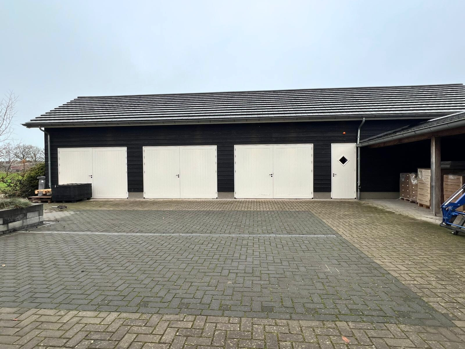 Adjacent to this is a carport/car shed (12 m by 5 m). In addition, the U-shape is filled with a double lockable garage (46 m²) and an adjoining second large storage/parking space (approx. 62 m²). The paved outdoor area provides parking space for at least six cars with a 22kW charging station (currently available to the public).