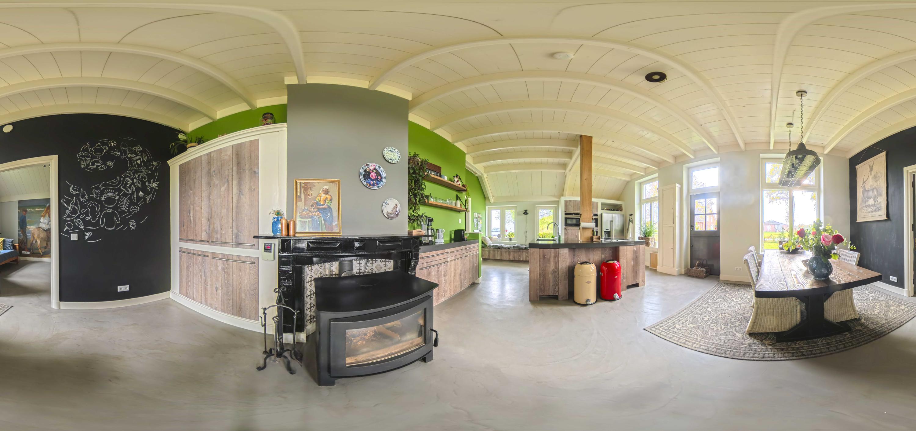 The kitchen is custom-made by Scheffer Keukens Zelhem and is nothing short of impressive; with a thick composite worktop, robust solid oak fronts and all modern built-in appliances – from induction hob to Quooker – it is a wonderful place to indulge your inner chef. The old fireplace still has a sturdy Nordic Fire wood-burning stove, which provides the kitchen with extra atmosphere and warmth.