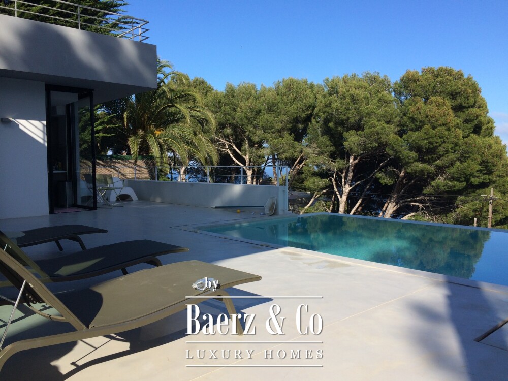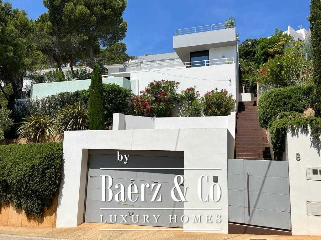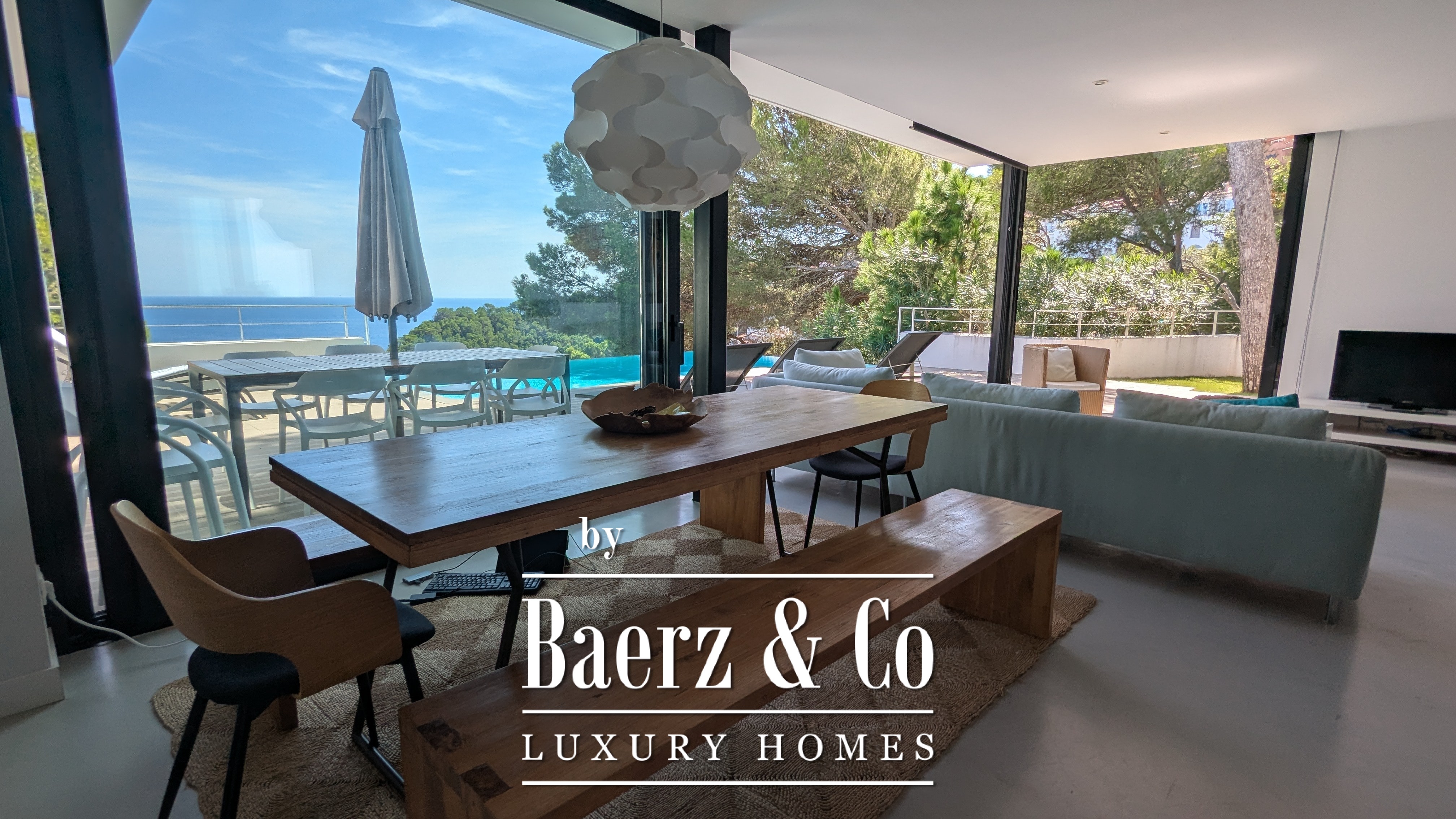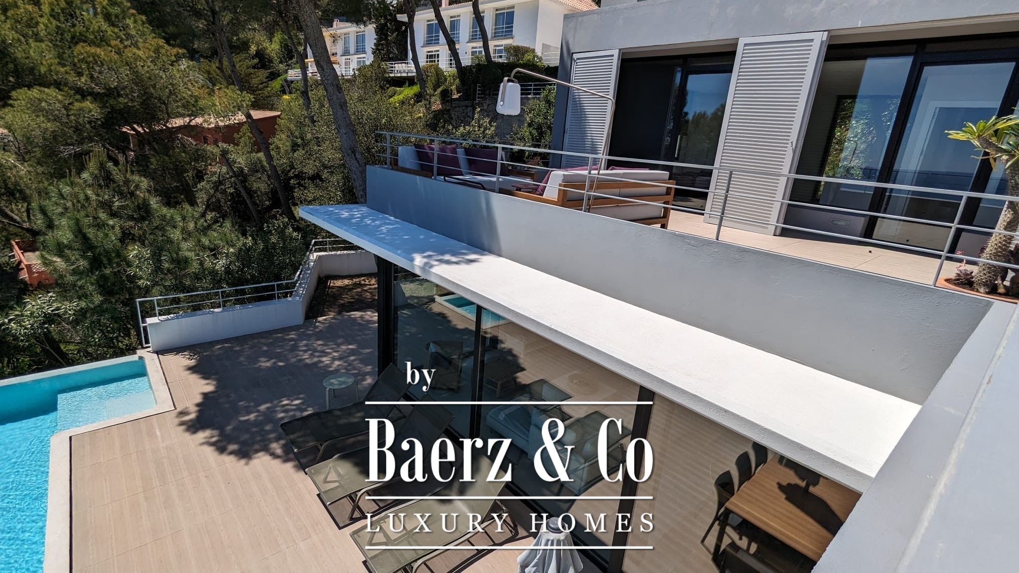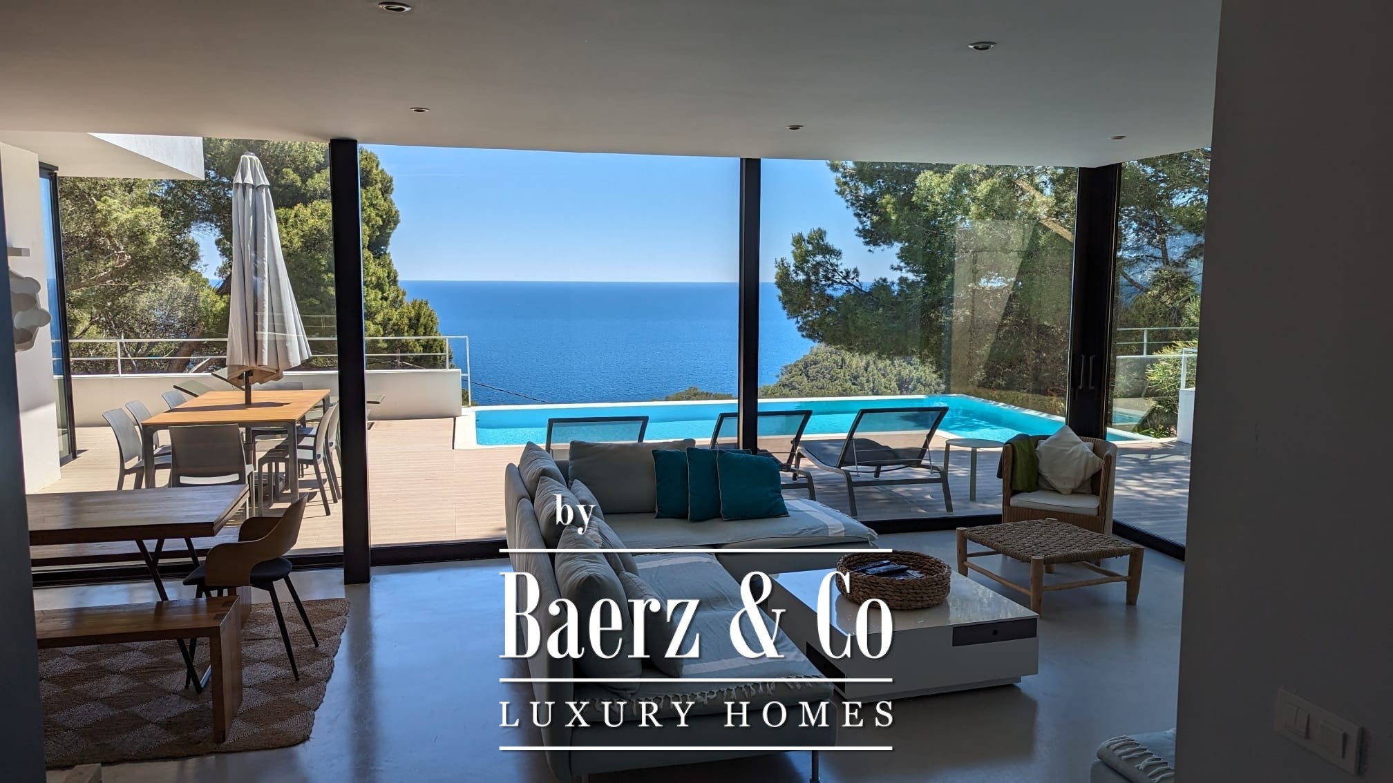 The lower level features two double bedrooms and a bathroom, each space composed for comfort and harmony. Upstairs, two further double bedrooms share a bathroom, and both open to a 50 m² terrace commanding exceptional sea views.
