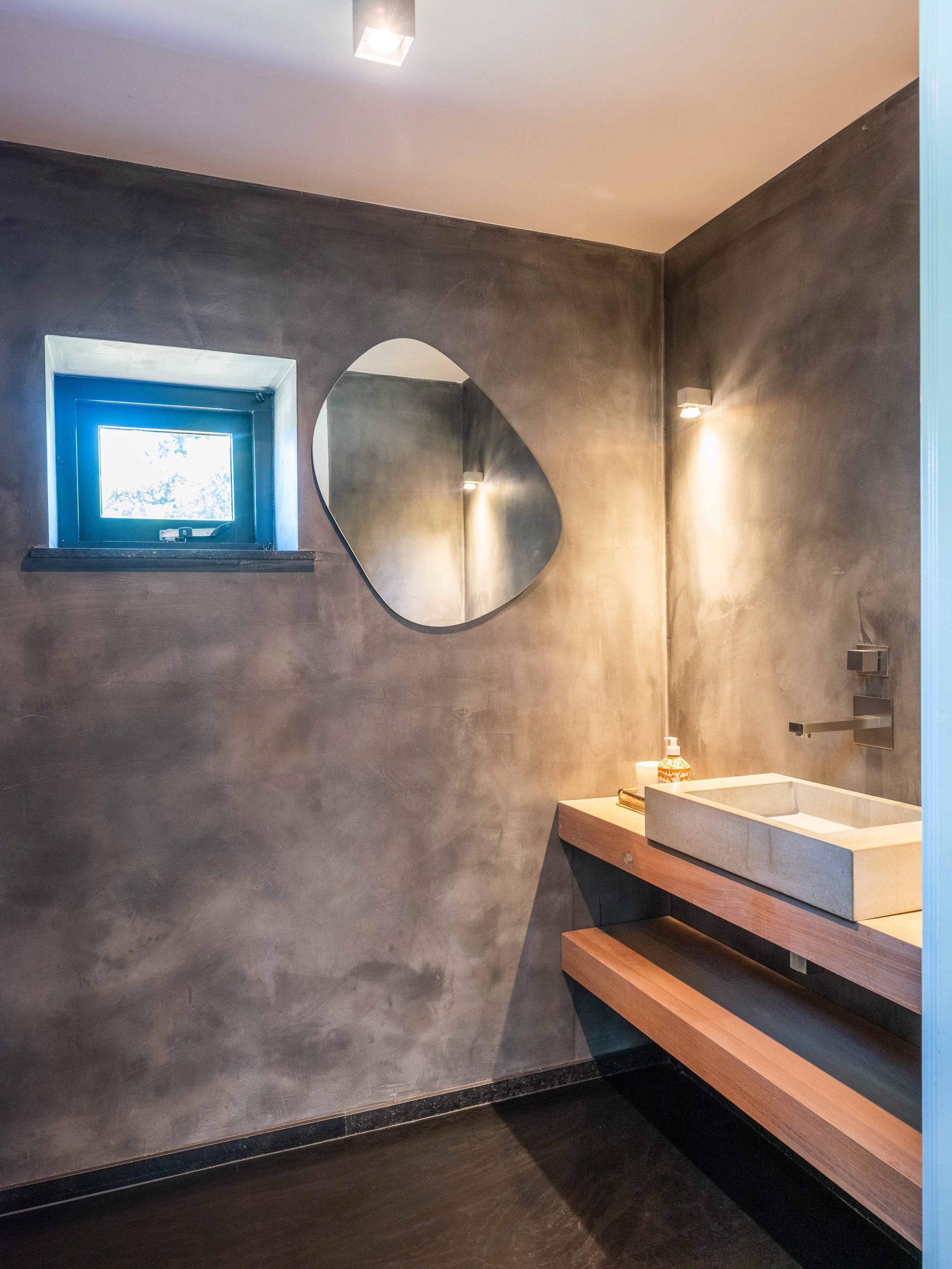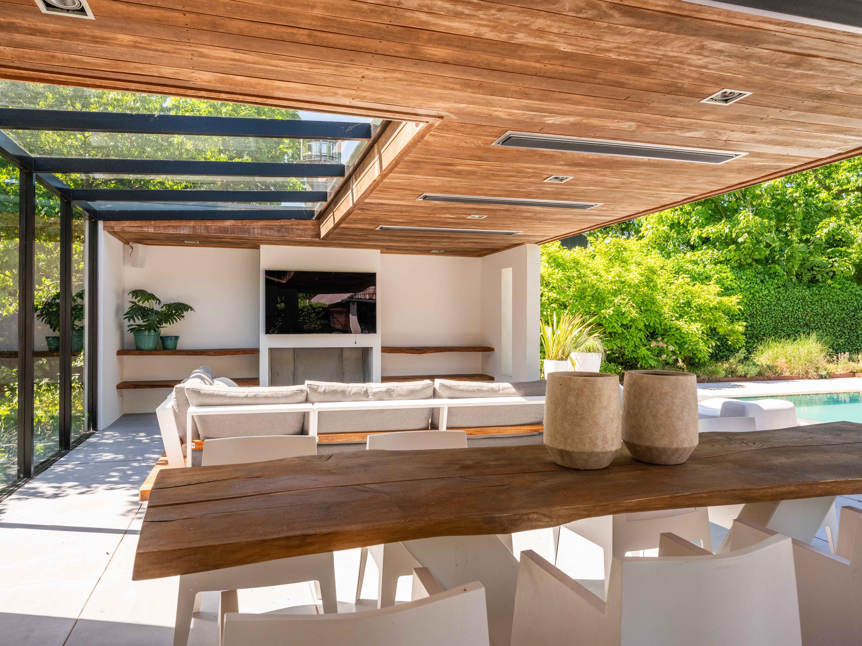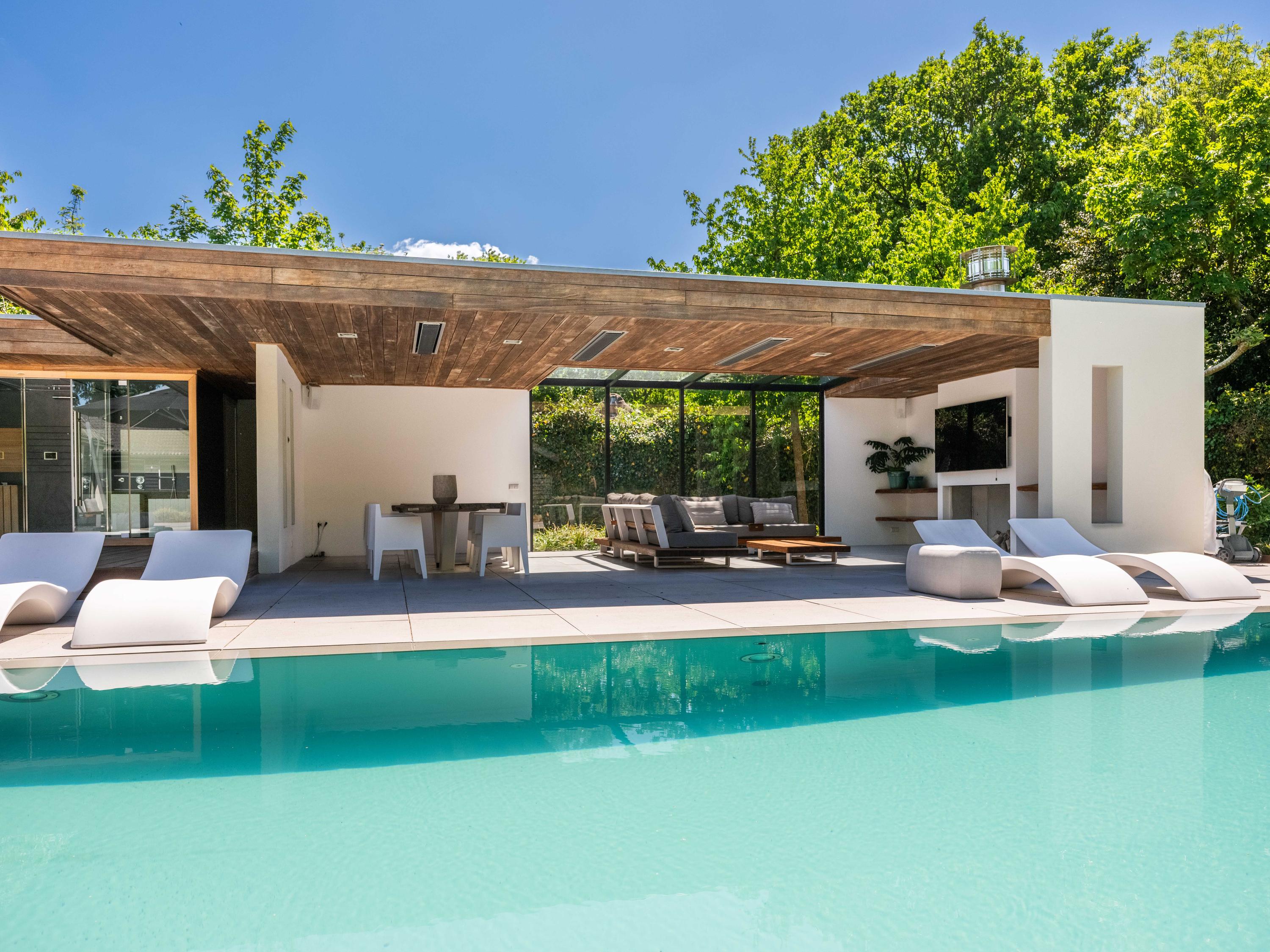 Also from the living room, there are passages to a separate toilet, several storage rooms and the master bedroom in the adjacent wing. This bedroom has a spacious walk-in wardrobe and an open bathroom with double sinks. The bathroom has a spacious shower with seat and a toilet. The view from both the bedroom and the bathroom faces the pool, further emphasising the luxury of the property and creating a wellness experience.