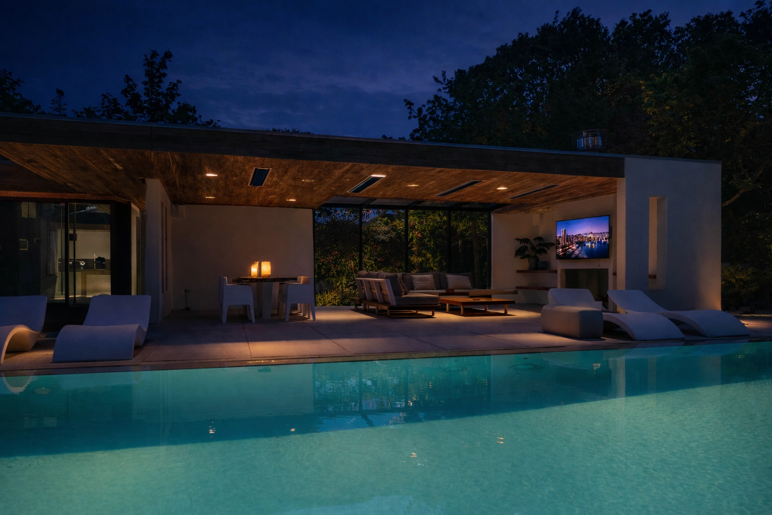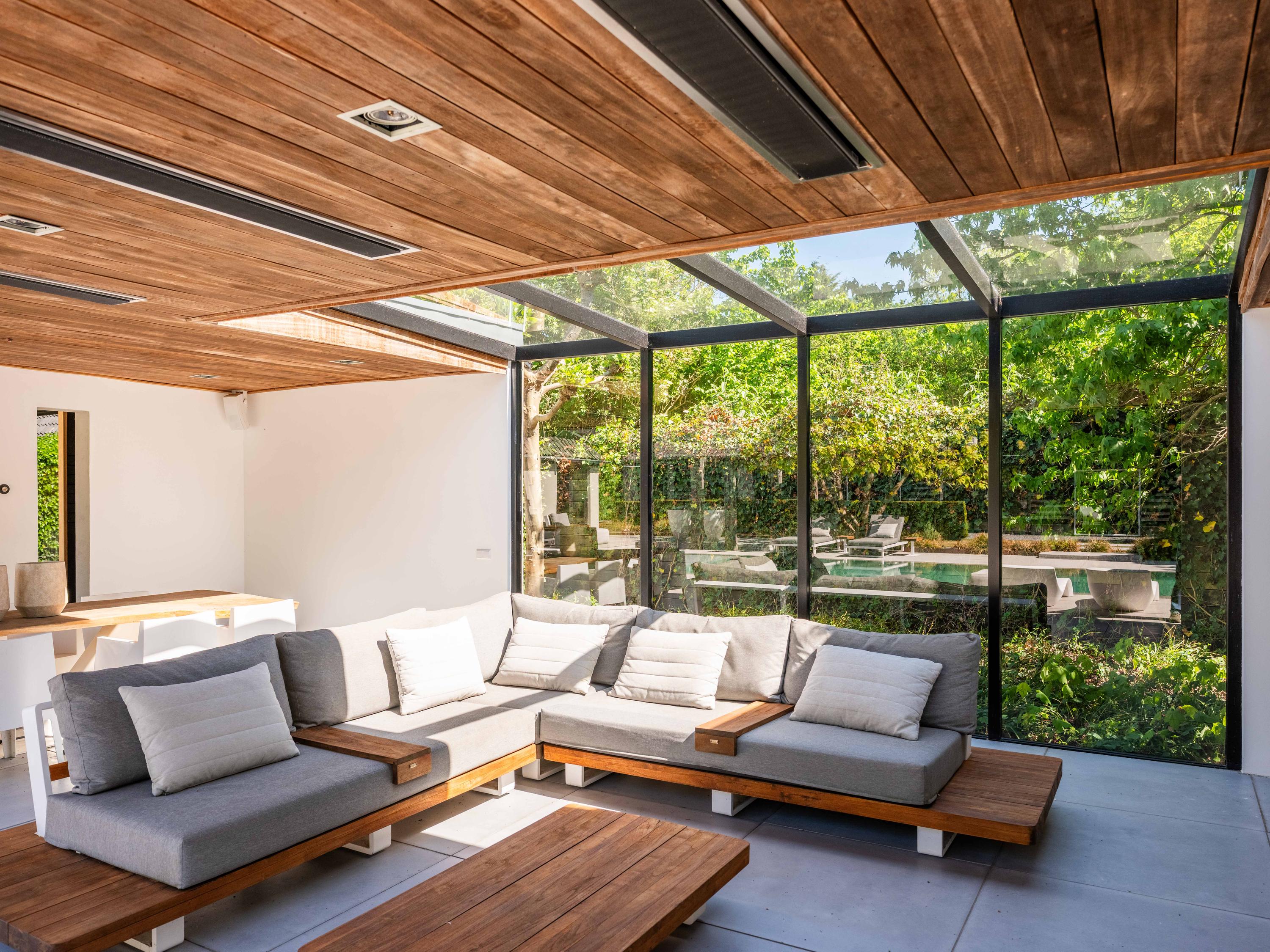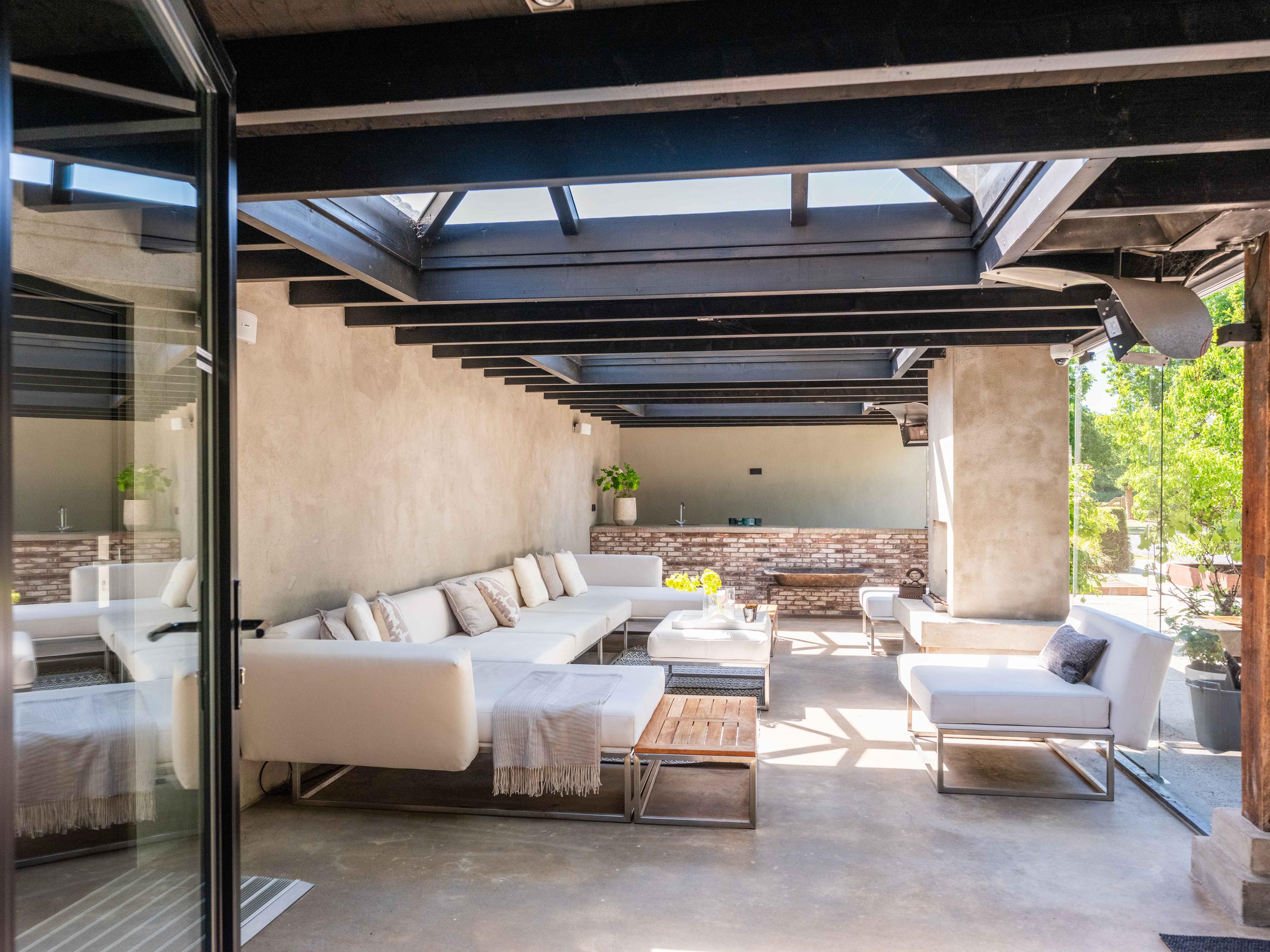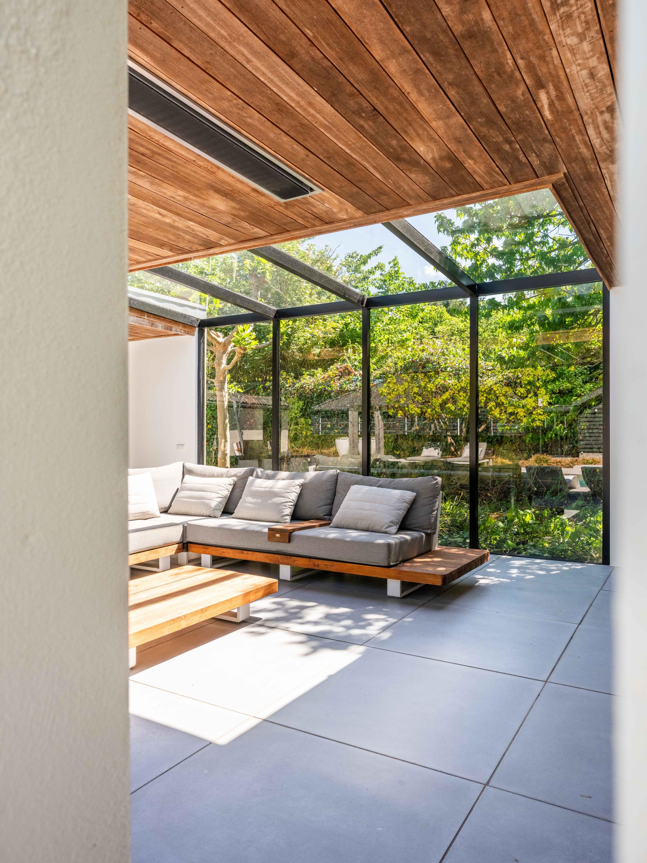 Also from the living room, there are passages to a separate toilet, several storage rooms and the master bedroom in the adjacent wing. This bedroom has a spacious walk-in wardrobe and an open bathroom with double sinks. The bathroom has a spacious shower with seat and a toilet. The view from both the bedroom and the bathroom faces the pool, further emphasising the luxury of the property and creating a wellness experience.