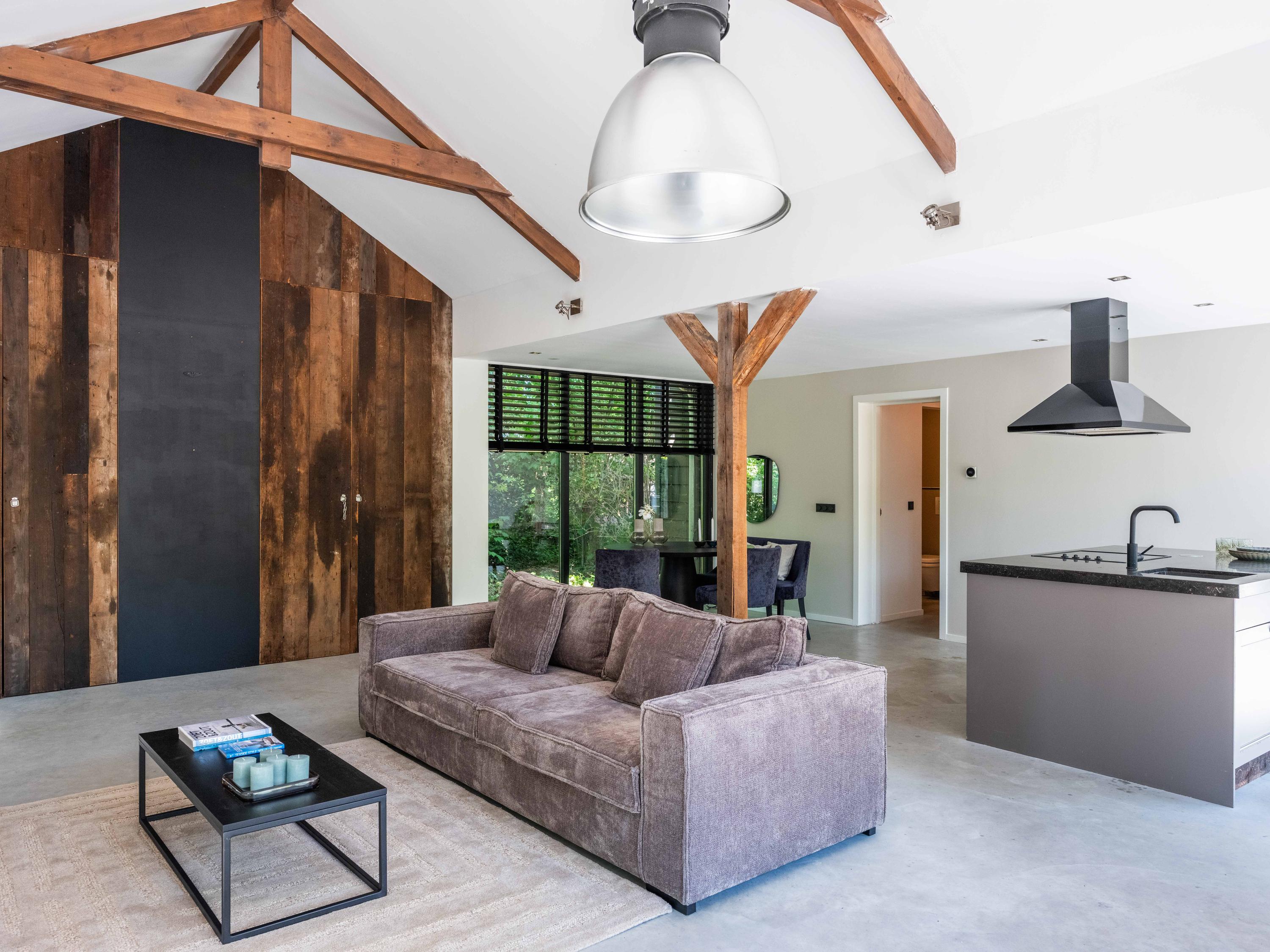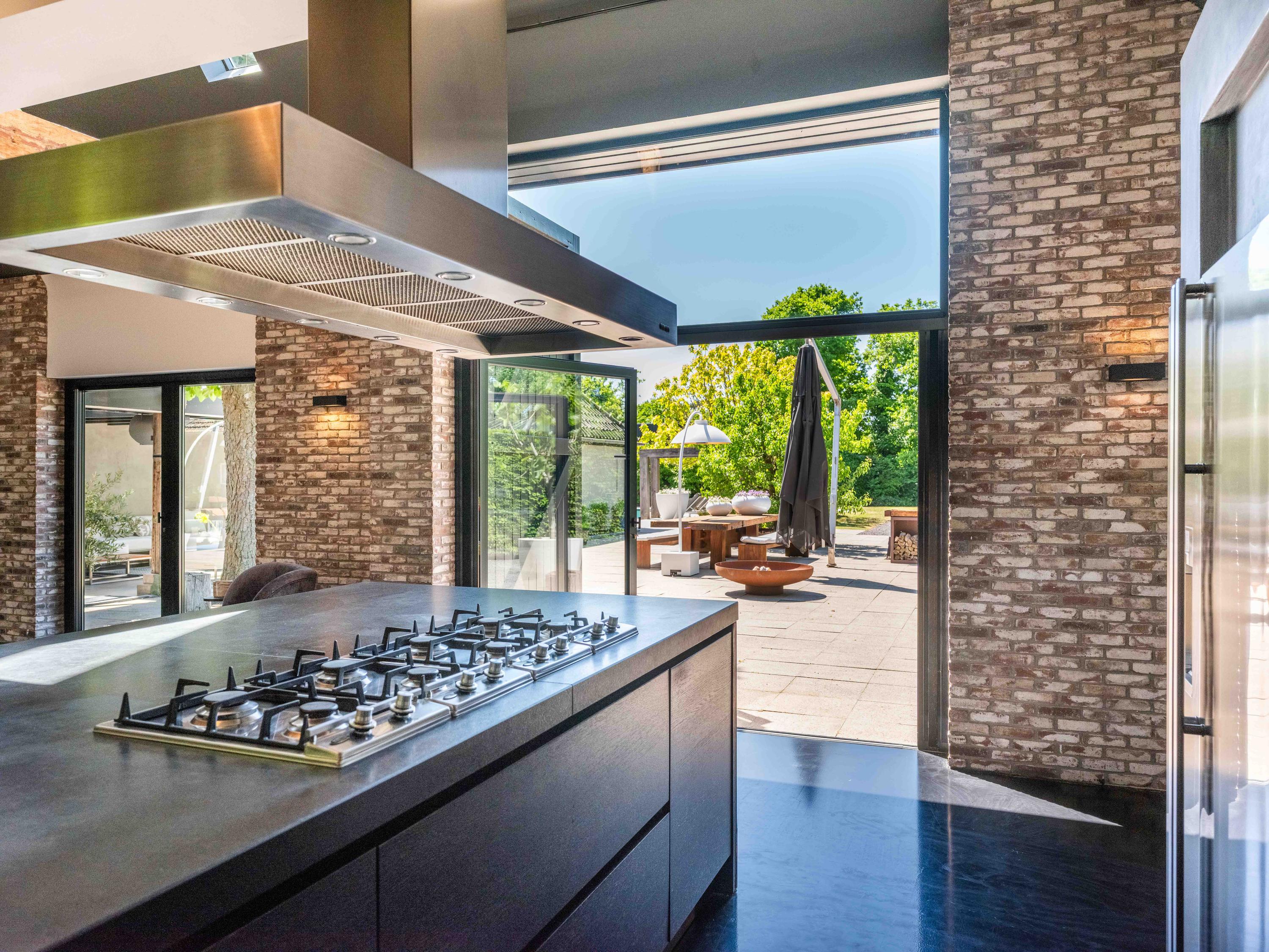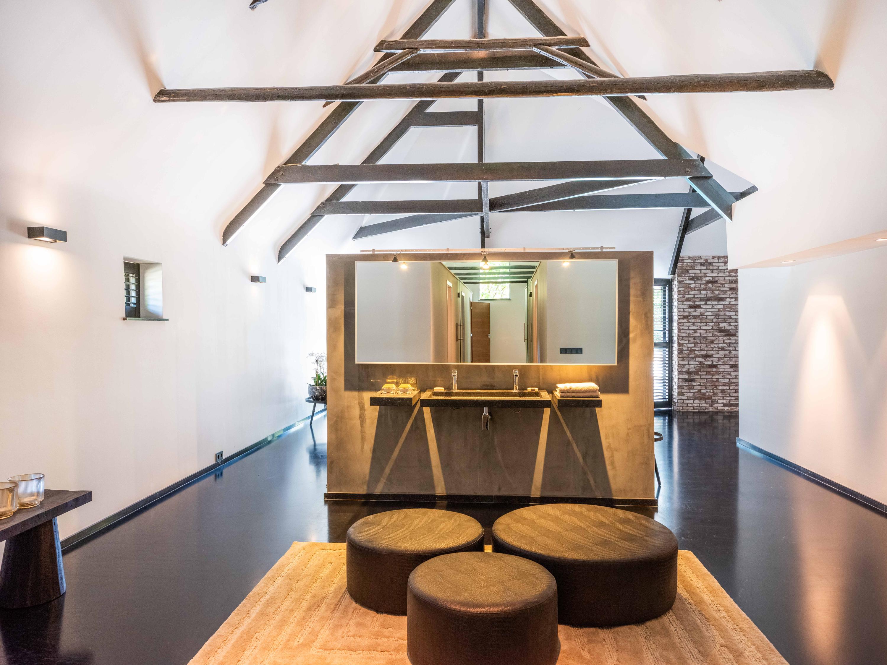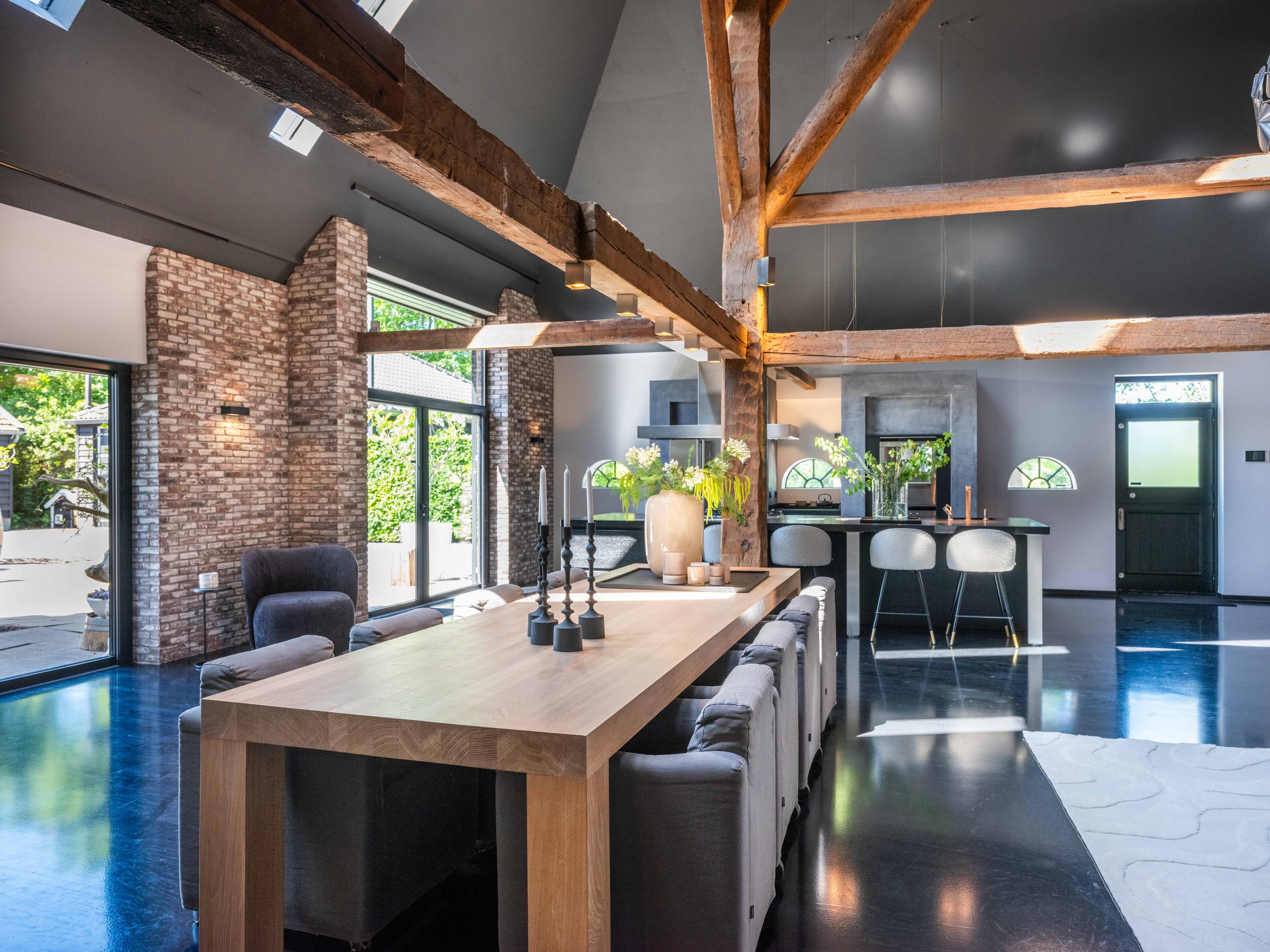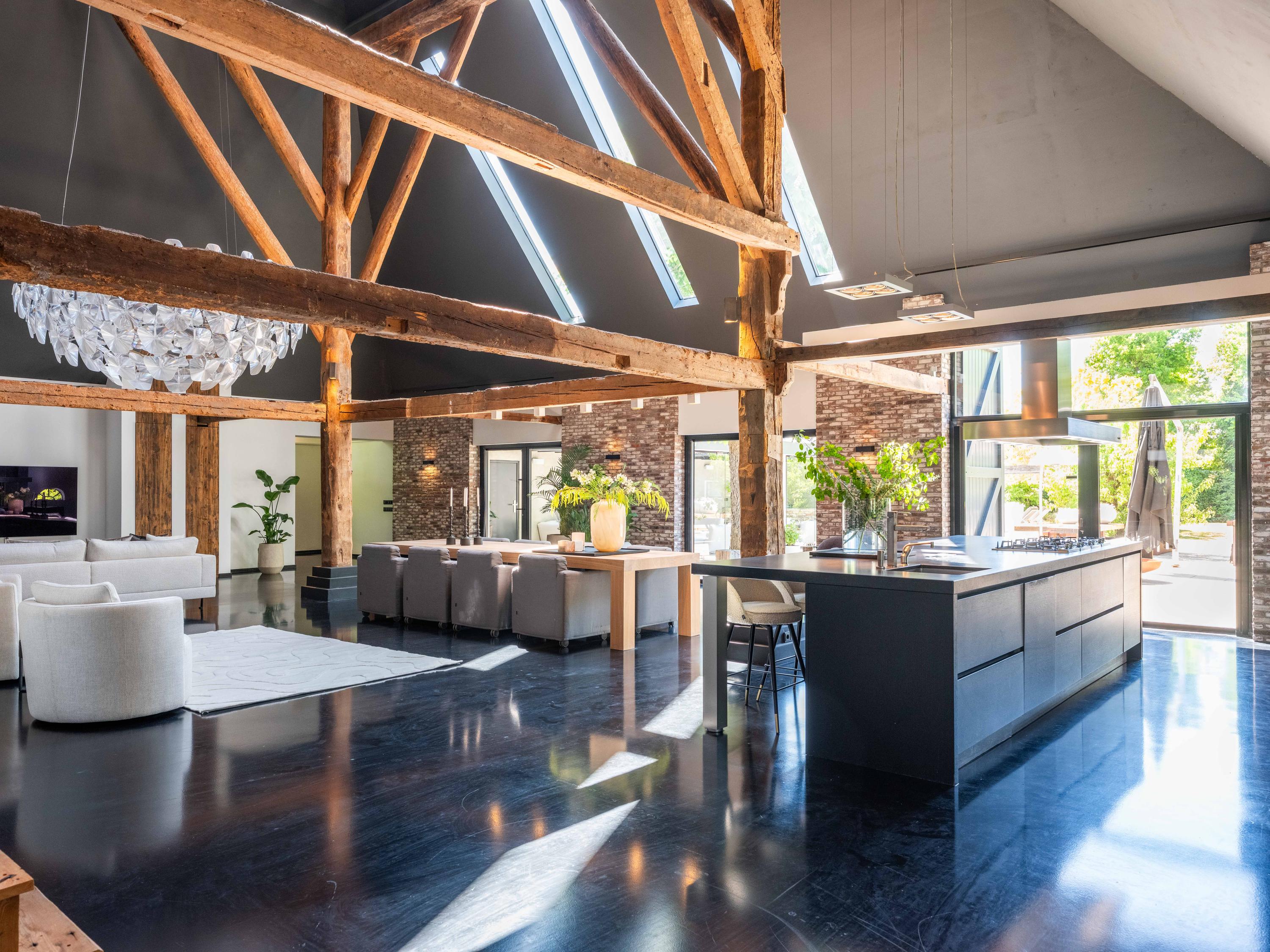 The living room where the ceiling, which reaches to the ridge, immediately catches the eye. The contrast of colours in the house enhance its sturdy character. This very spacious living room has a fireplace and French doors to the garden. The modern open kitchen is equipped with various built-in appliances, including a Boretti 8-burner cooker, an American fridge with coffee maker and plate warmer, oven, built-in fridge and dishwasher.