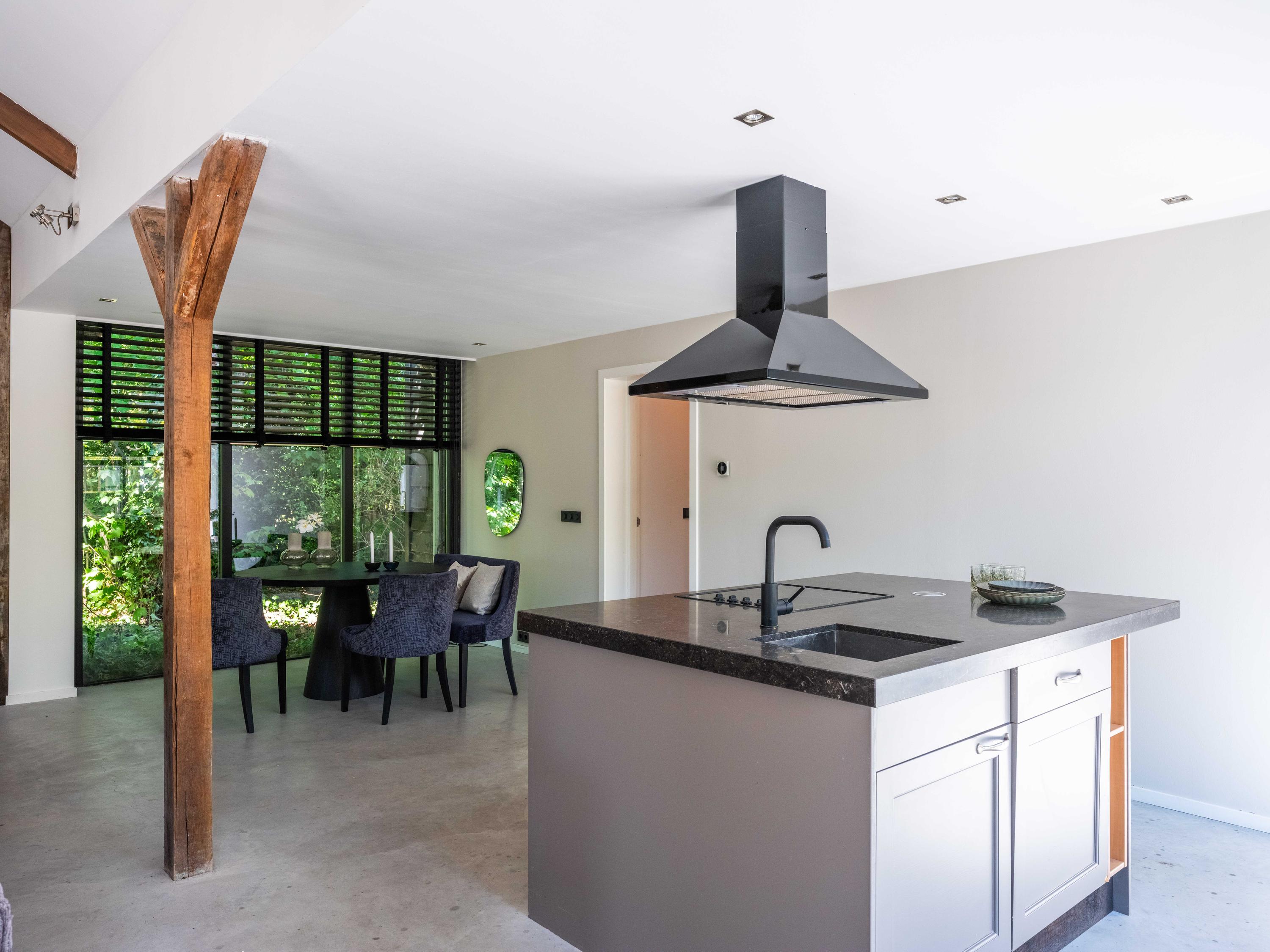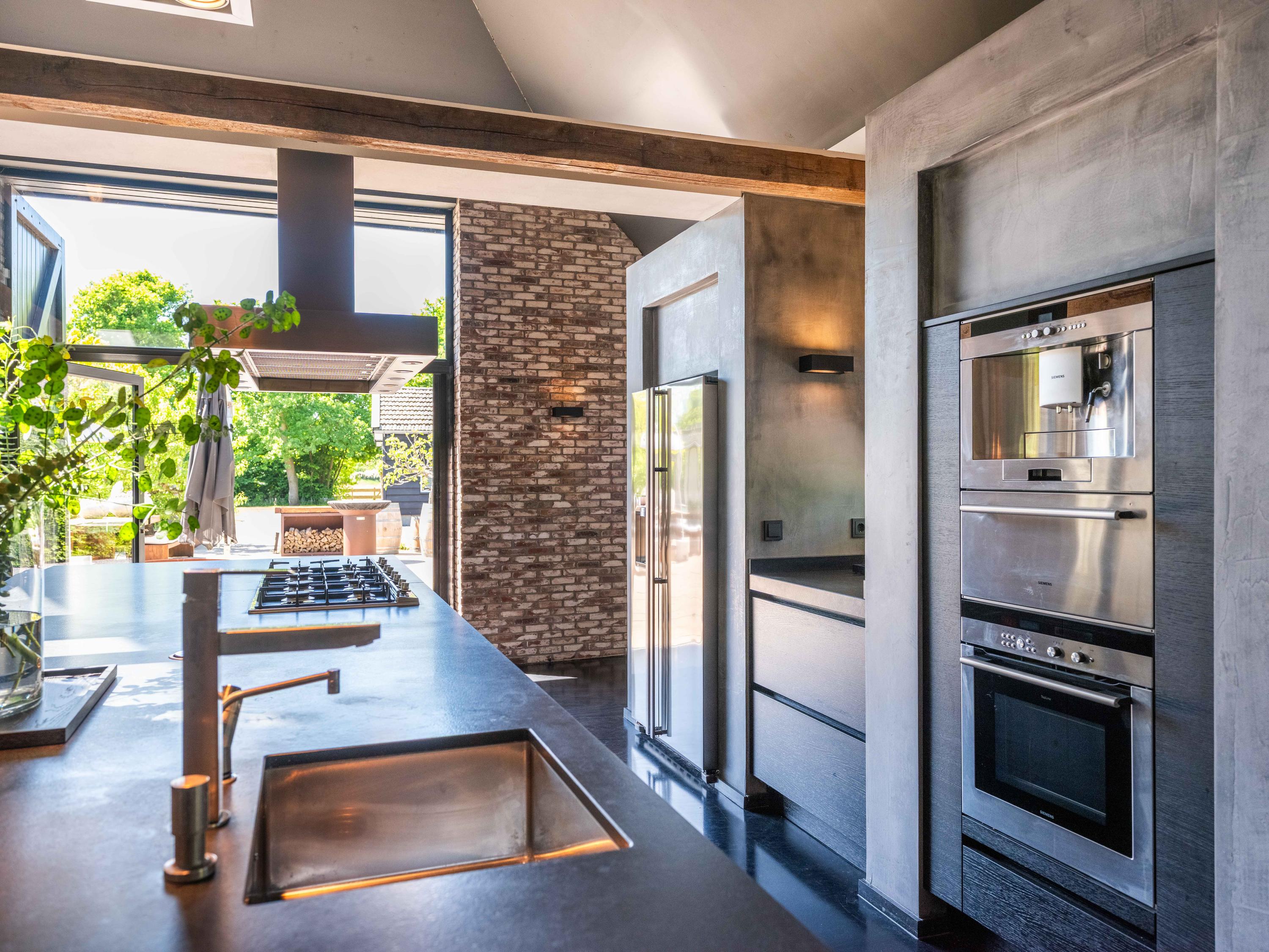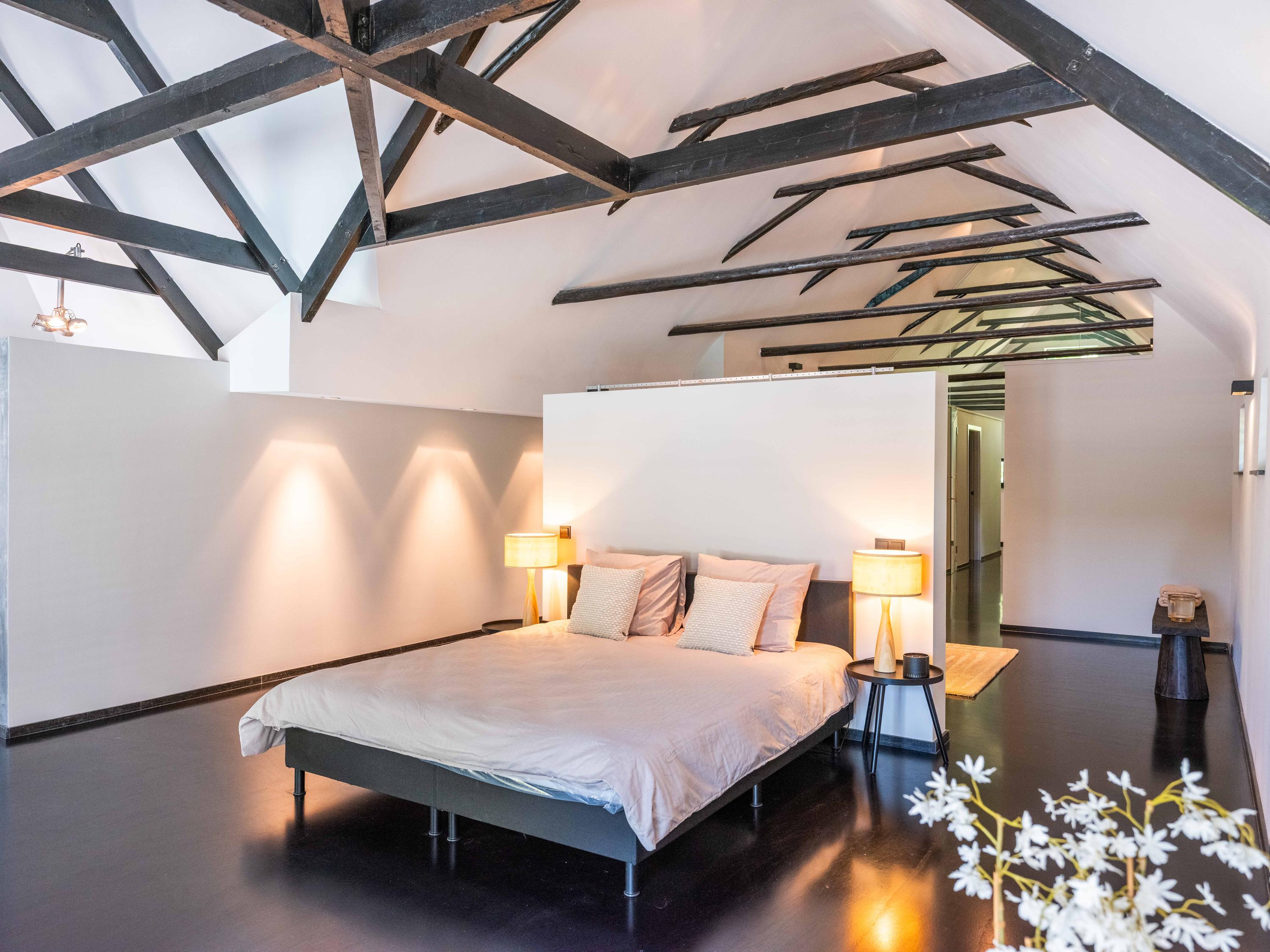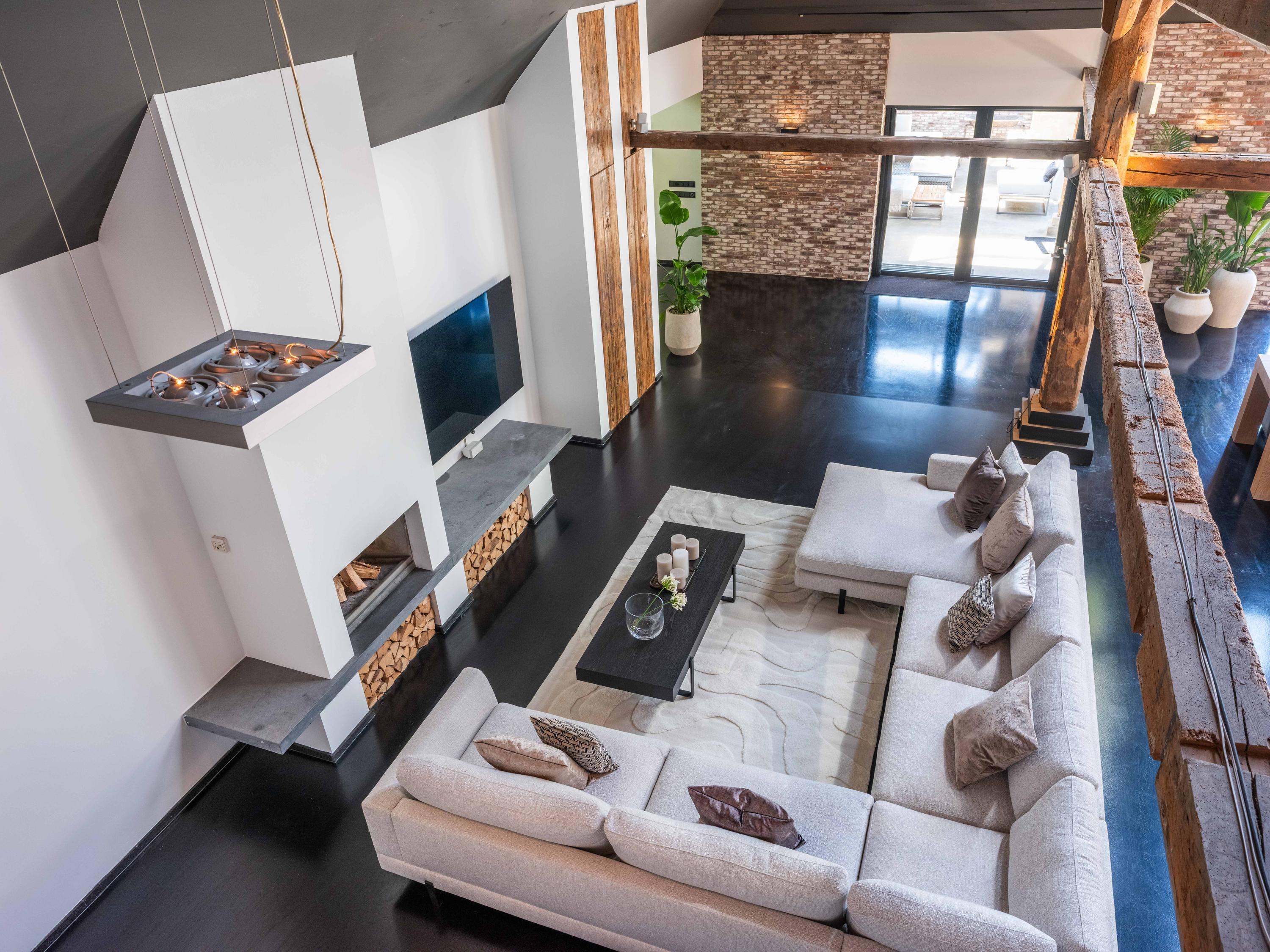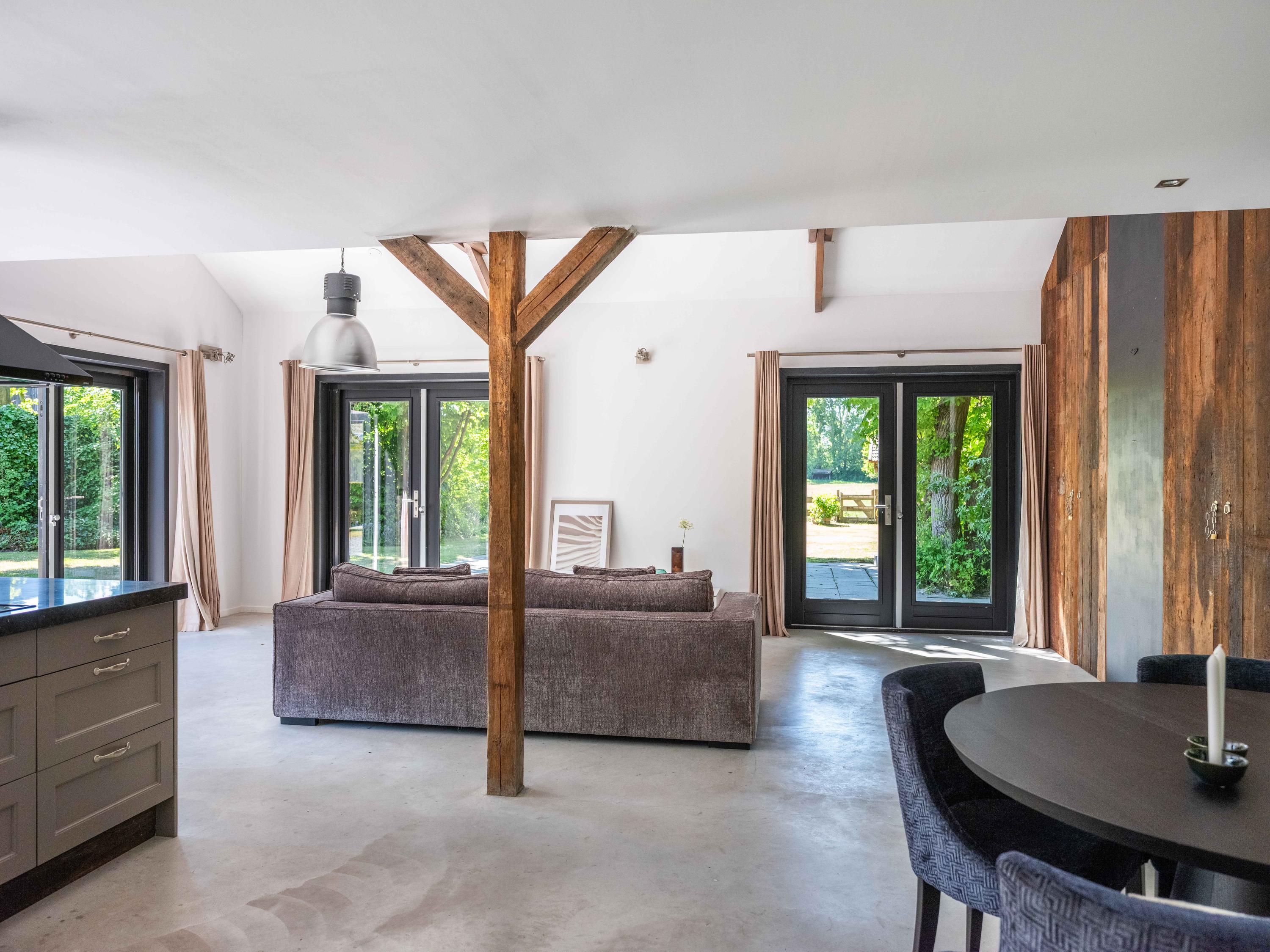 The living room where the ceiling, which reaches to the ridge, immediately catches the eye. The contrast of colours in the house enhance its sturdy character. This very spacious living room has a fireplace and French doors to the garden. The modern open kitchen is equipped with various built-in appliances, including a Boretti 8-burner cooker, an American fridge with coffee maker and plate warmer, oven, built-in fridge and dishwasher.