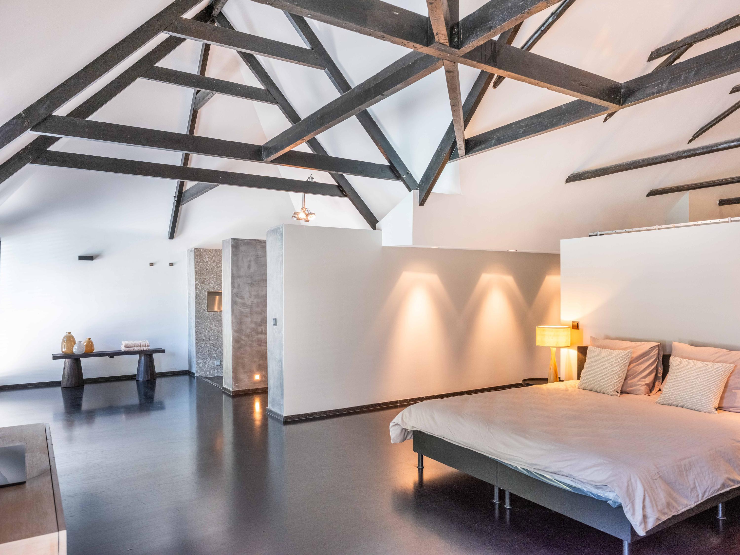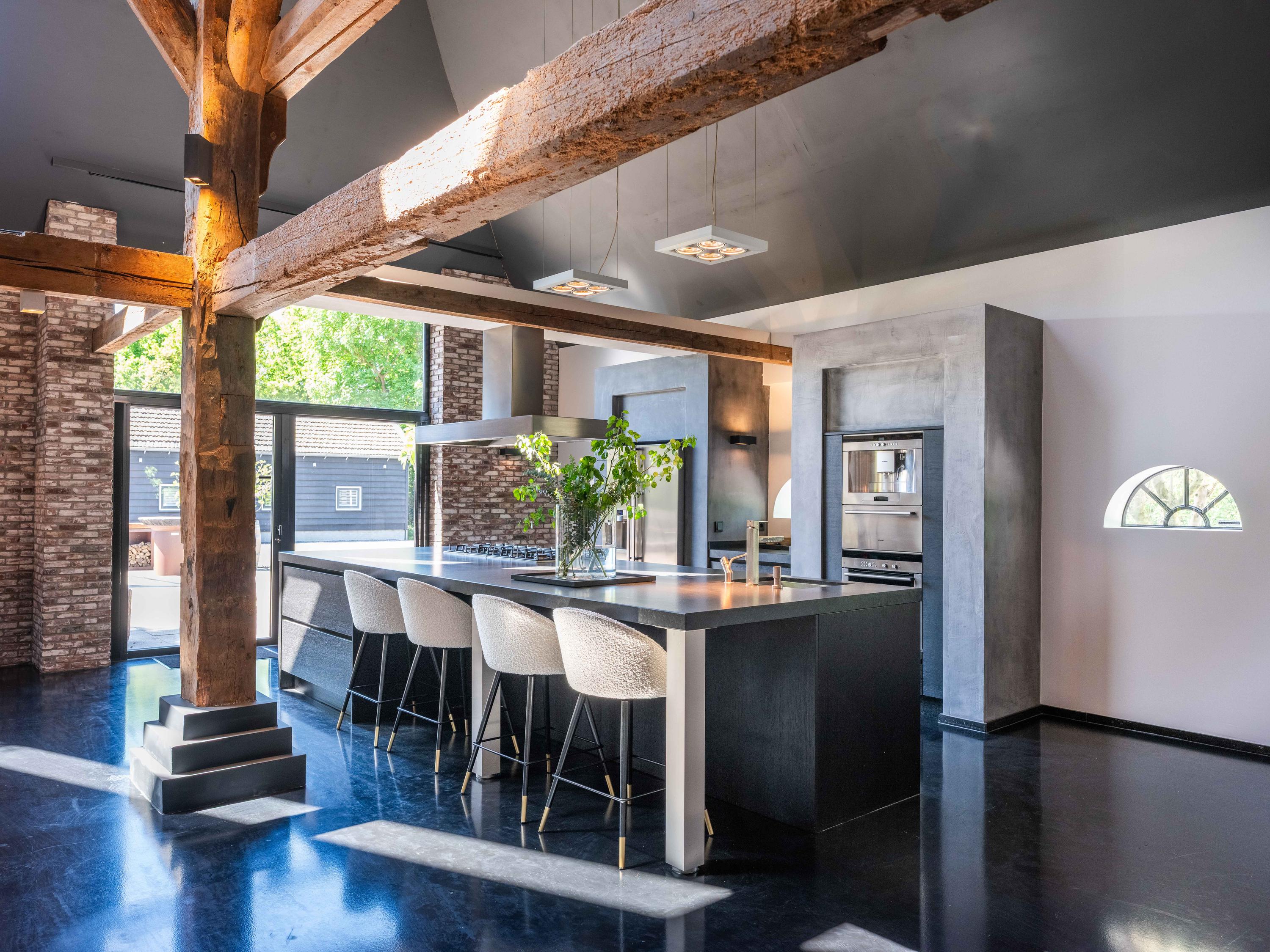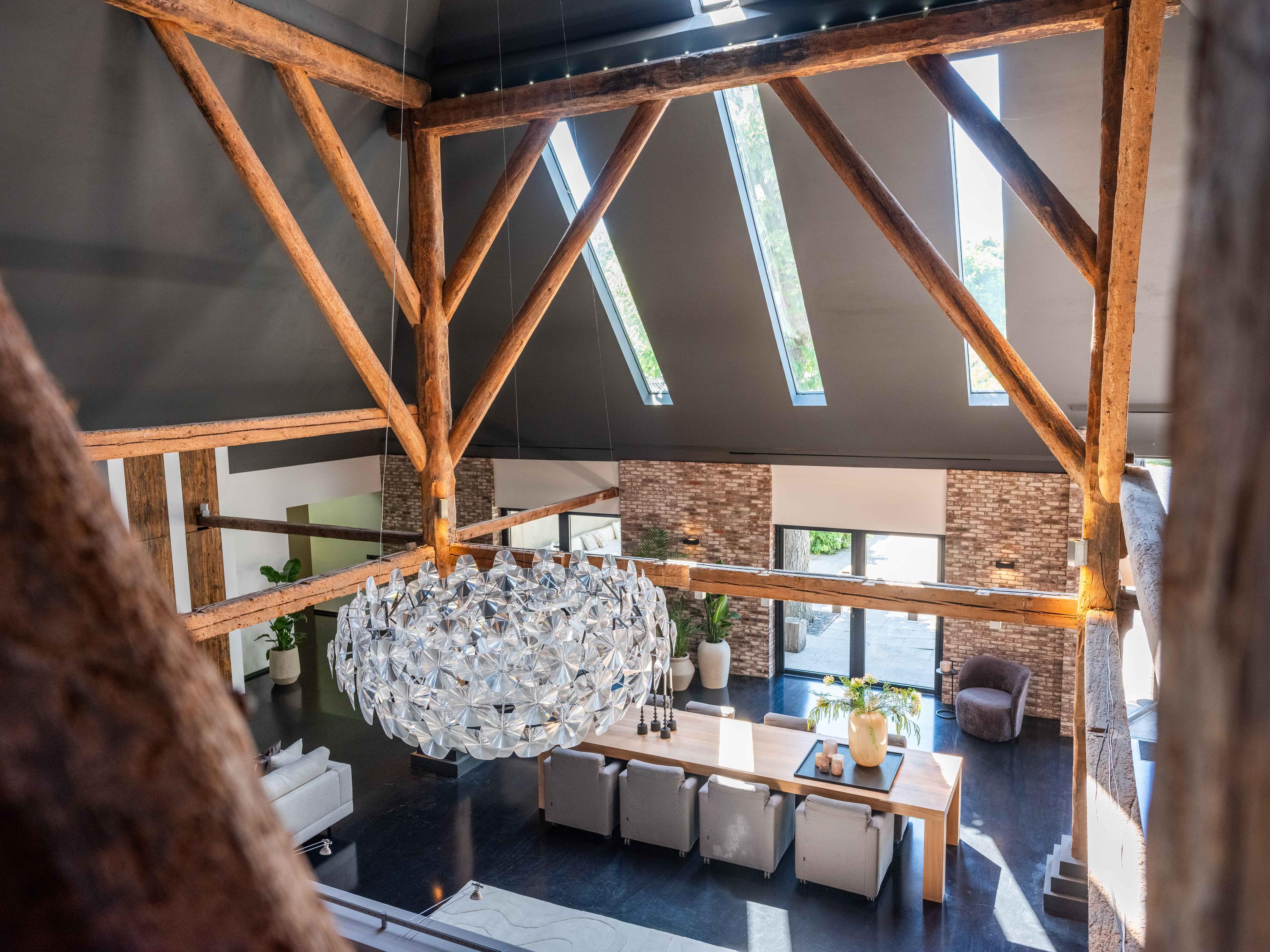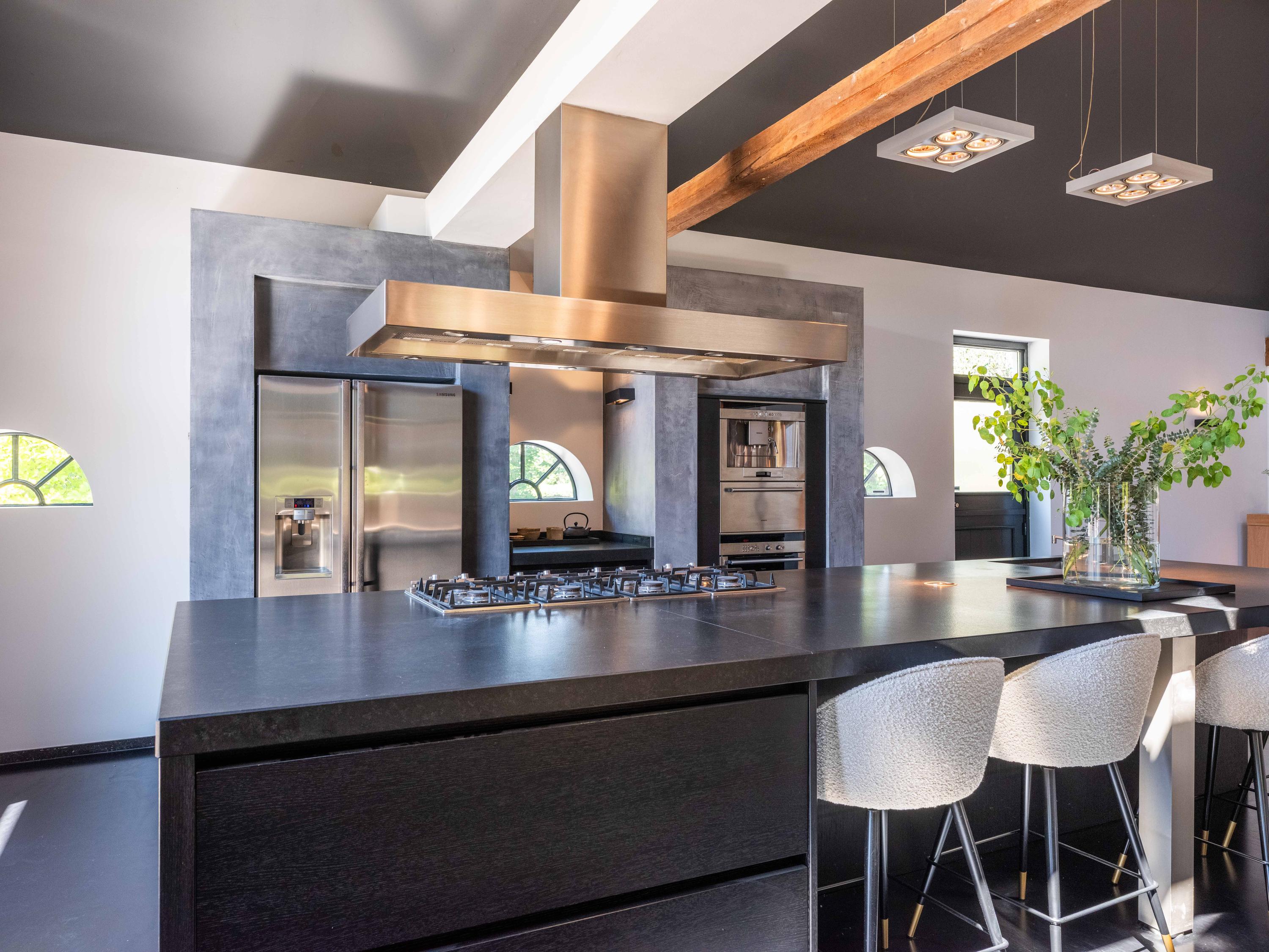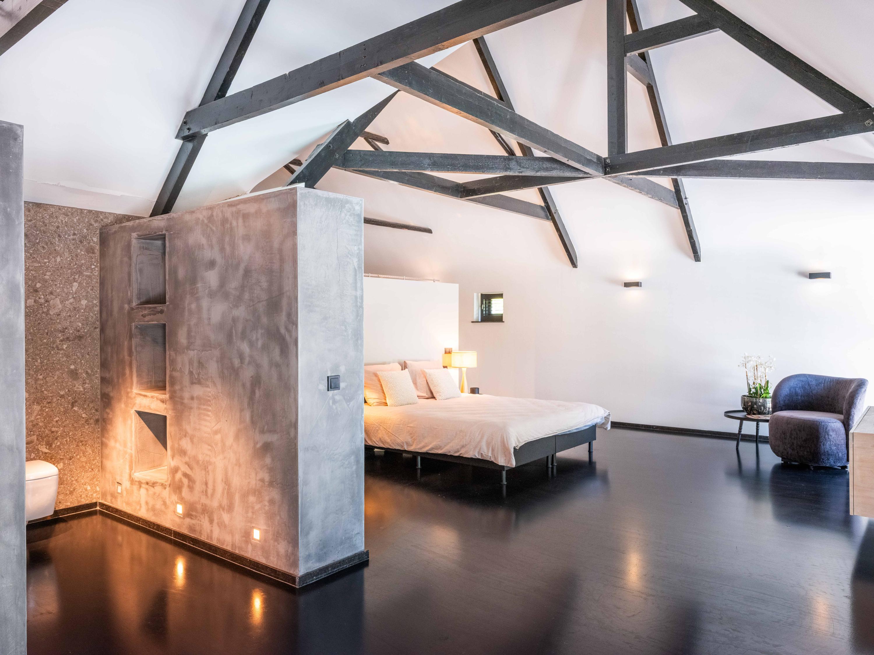 The living room where the ceiling, which reaches to the ridge, immediately catches the eye. The contrast of colours in the house enhance its sturdy character. This very spacious living room has a fireplace and French doors to the garden. The modern open kitchen is equipped with various built-in appliances, including a Boretti 8-burner cooker, an American fridge with coffee maker and plate warmer, oven, built-in fridge and dishwasher.