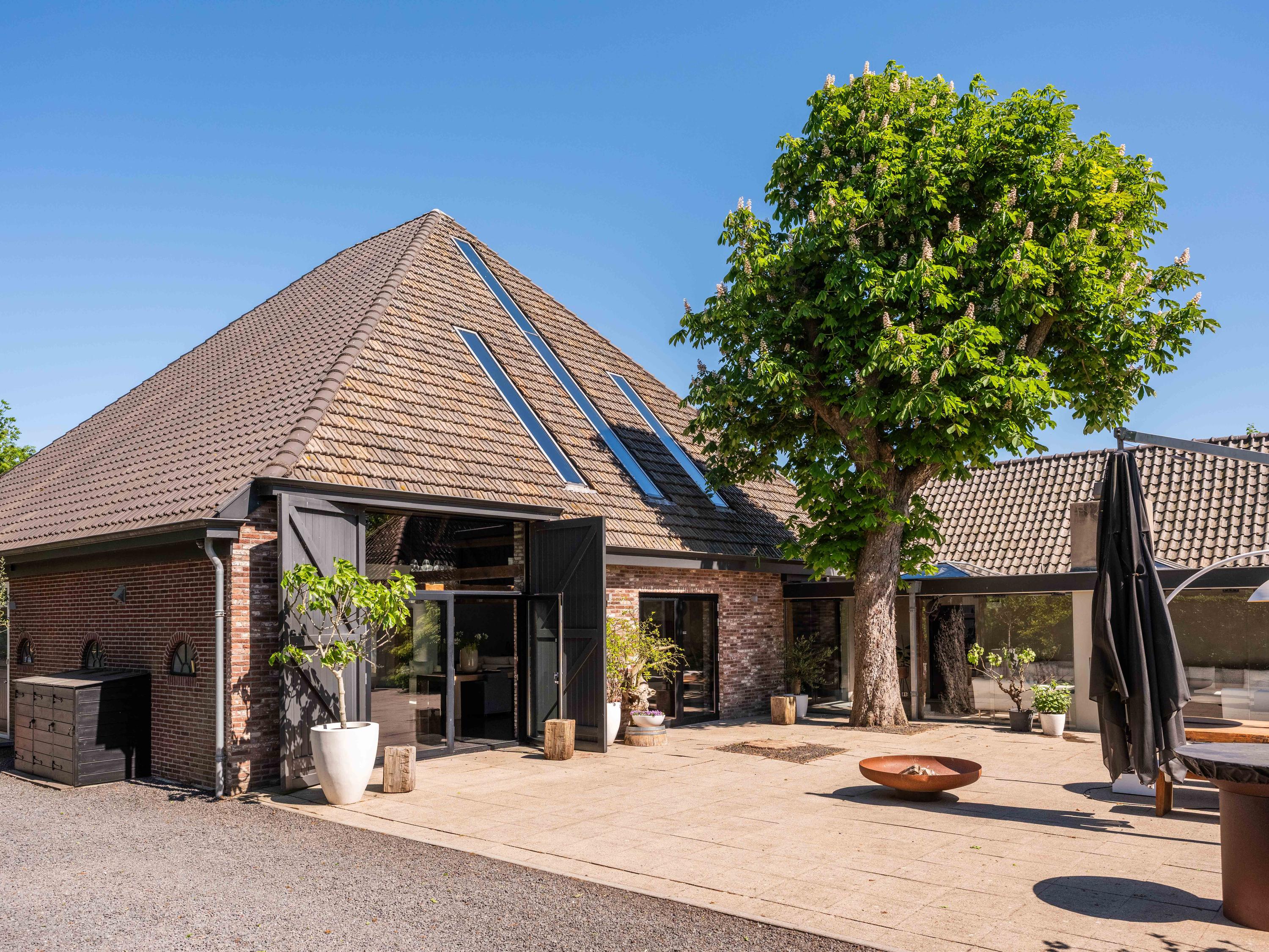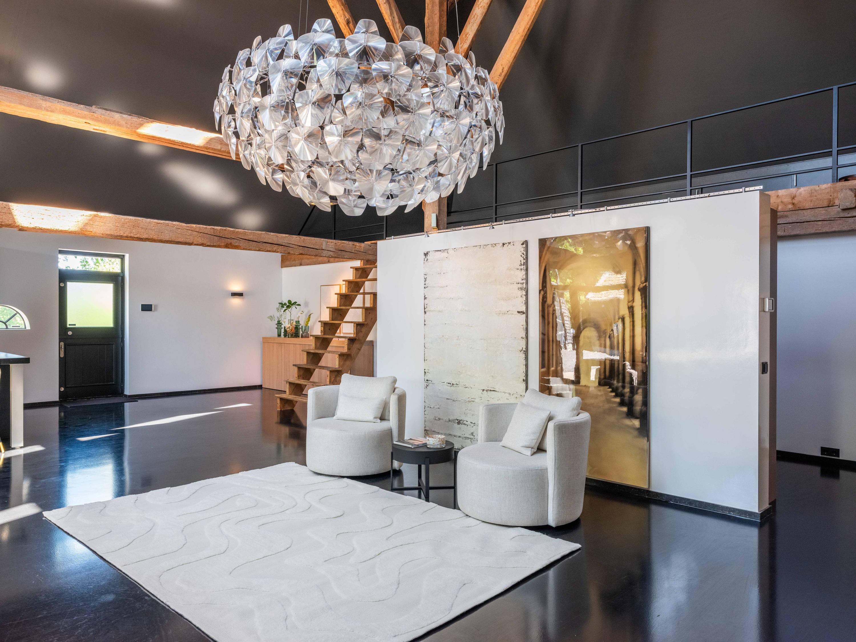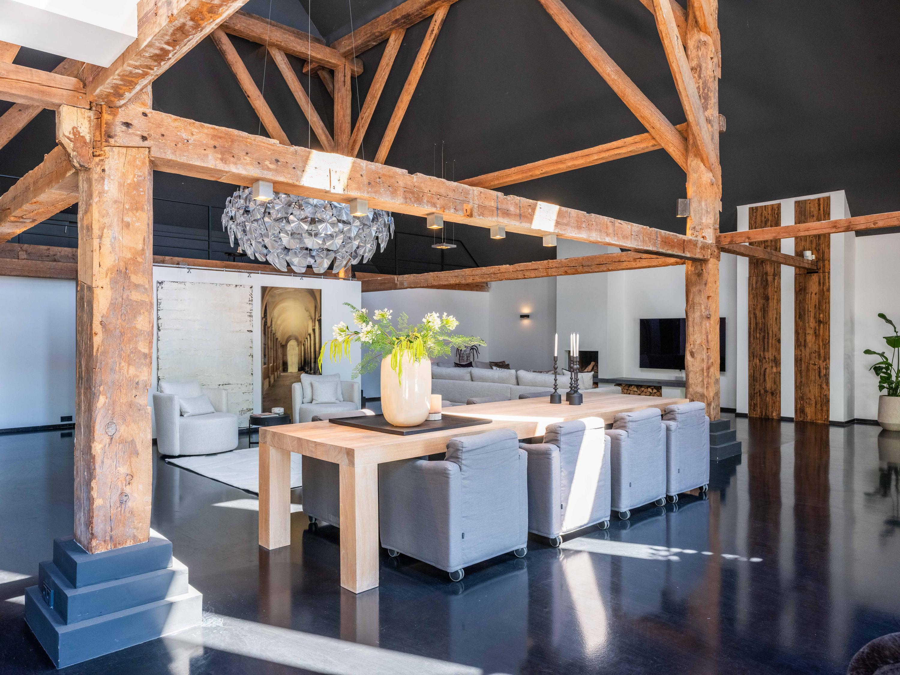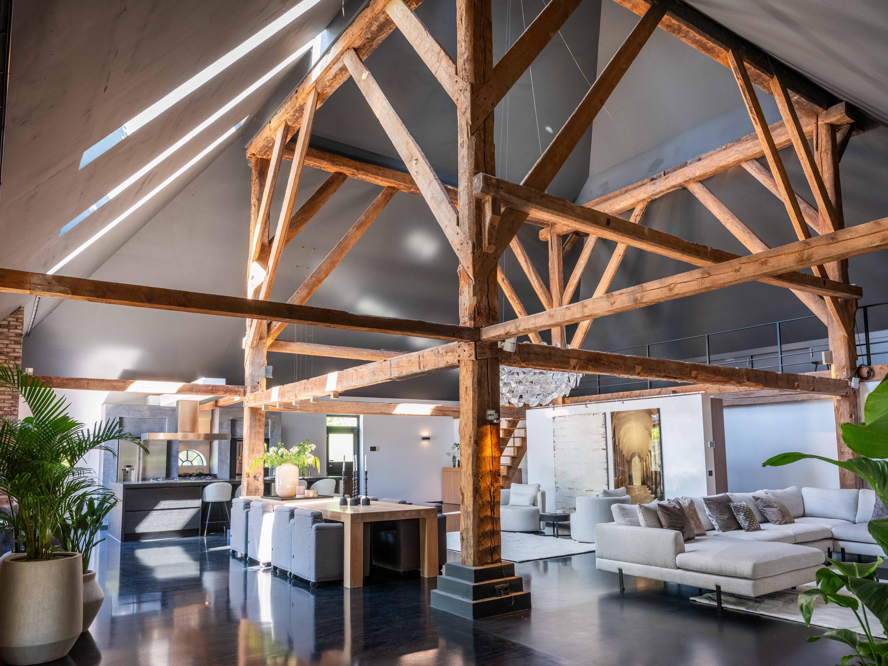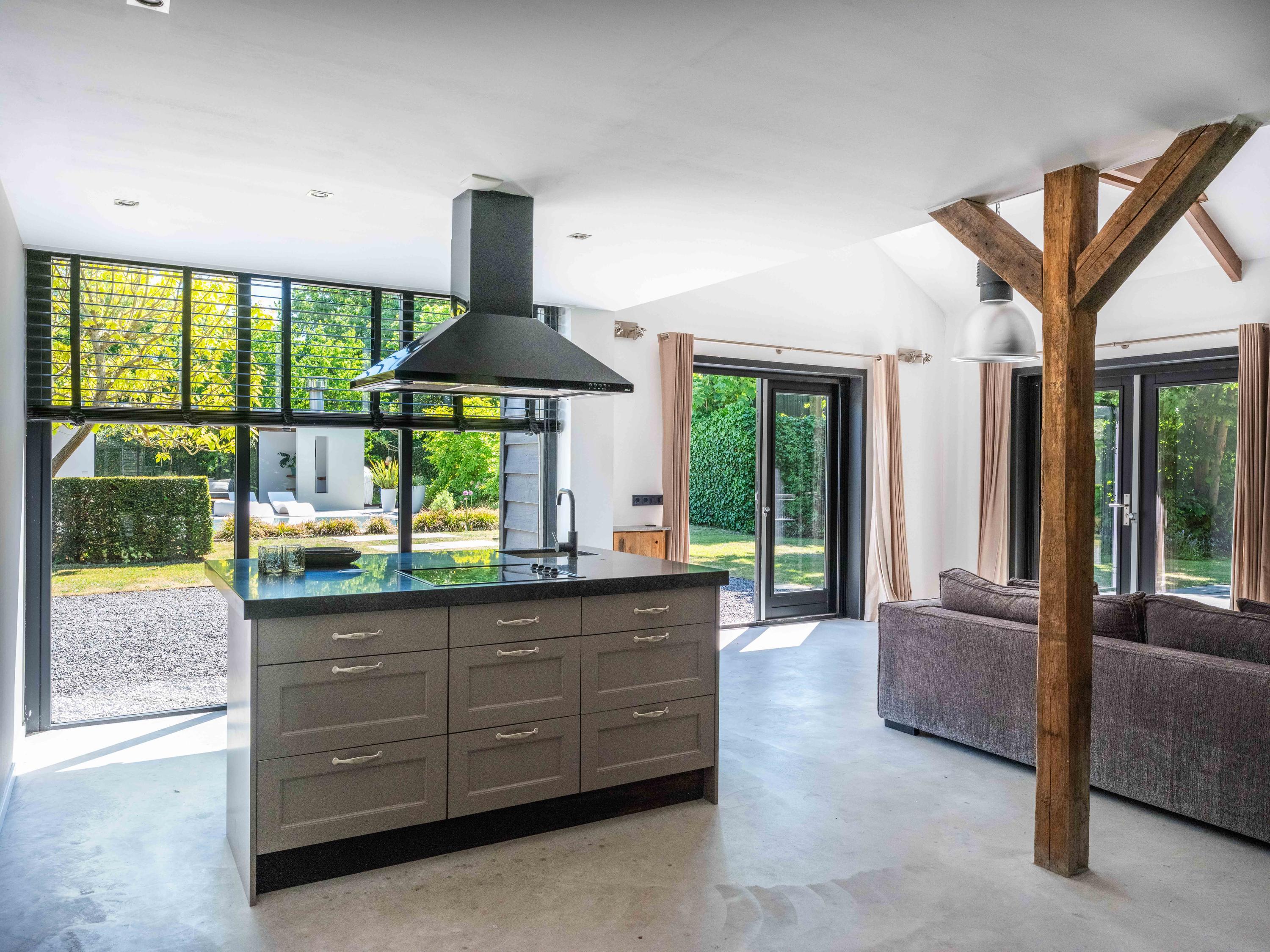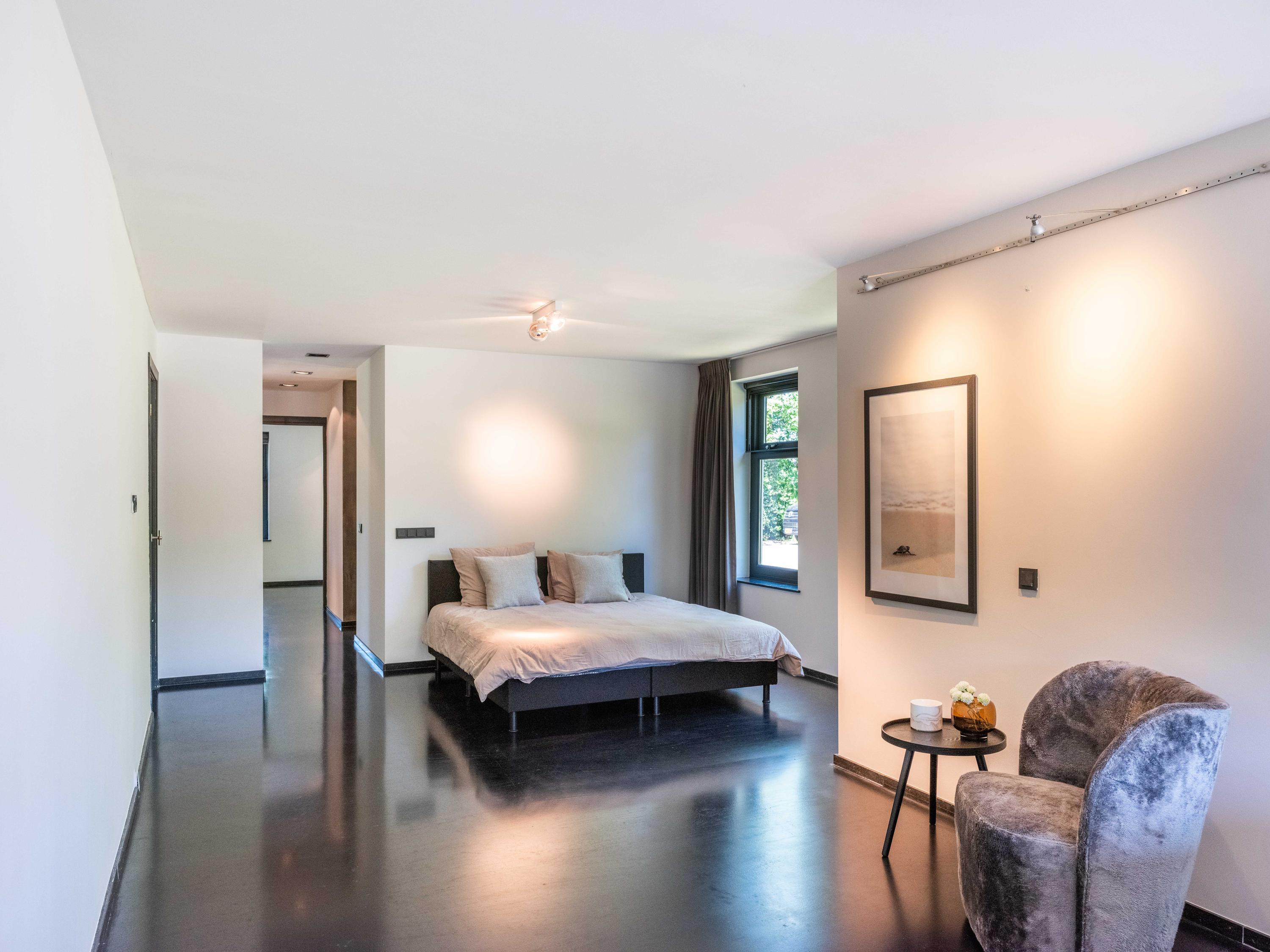 The living room where the ceiling, which reaches to the ridge, immediately catches the eye. The contrast of colours in the house enhance its sturdy character. This very spacious living room has a fireplace and French doors to the garden. The modern open kitchen is equipped with various built-in appliances, including a Boretti 8-burner cooker, an American fridge with coffee maker and plate warmer, oven, built-in fridge and dishwasher.