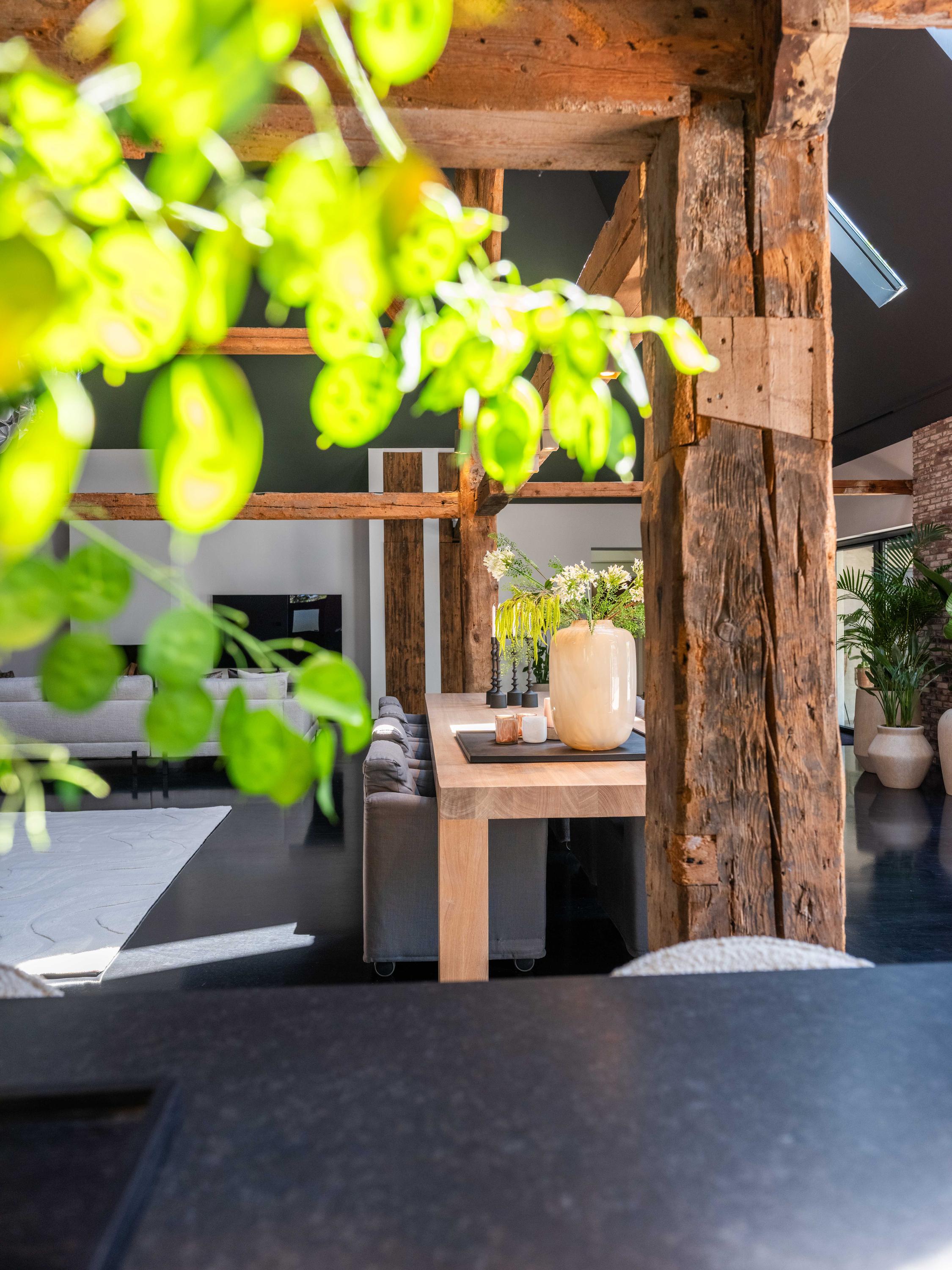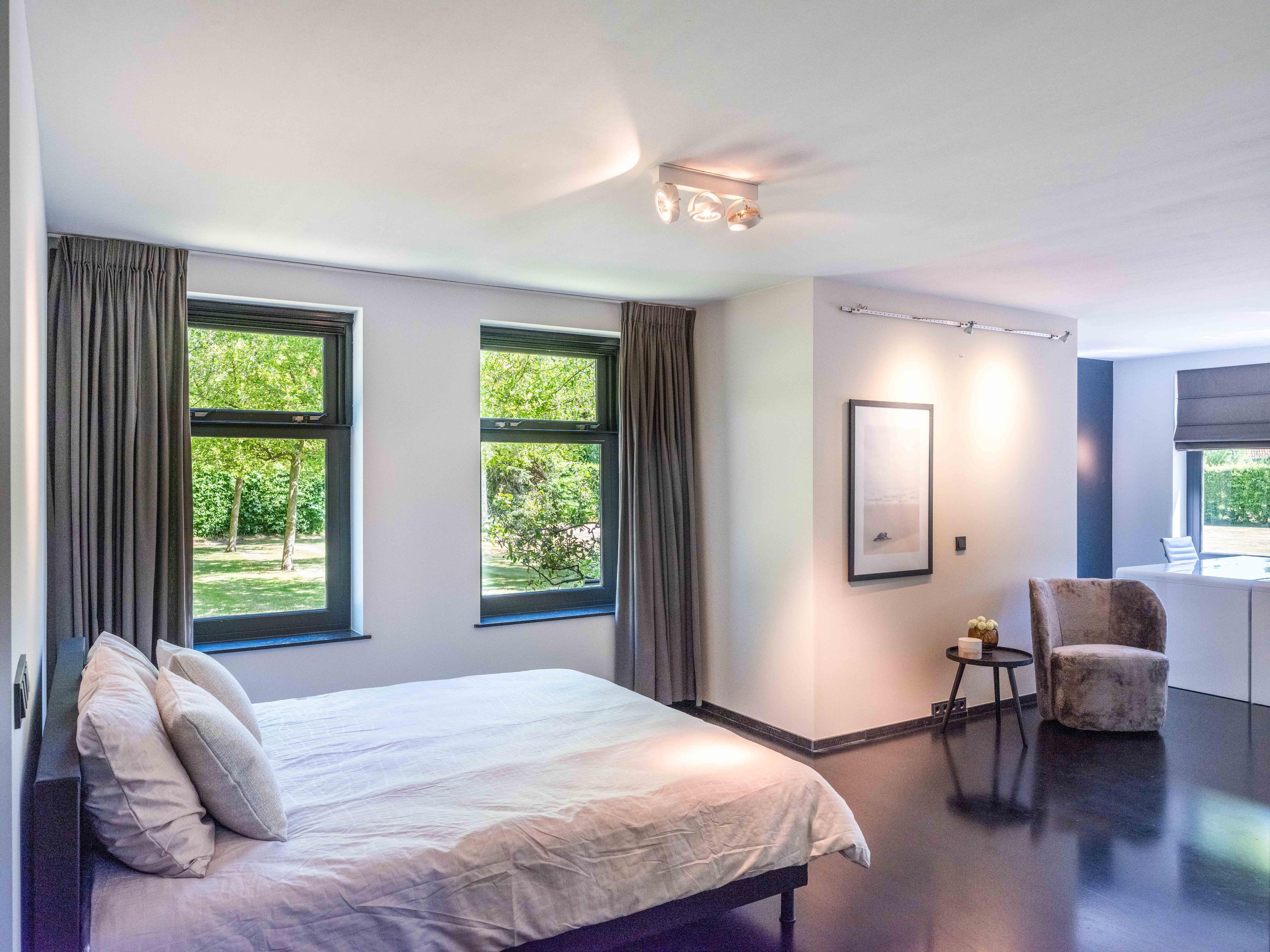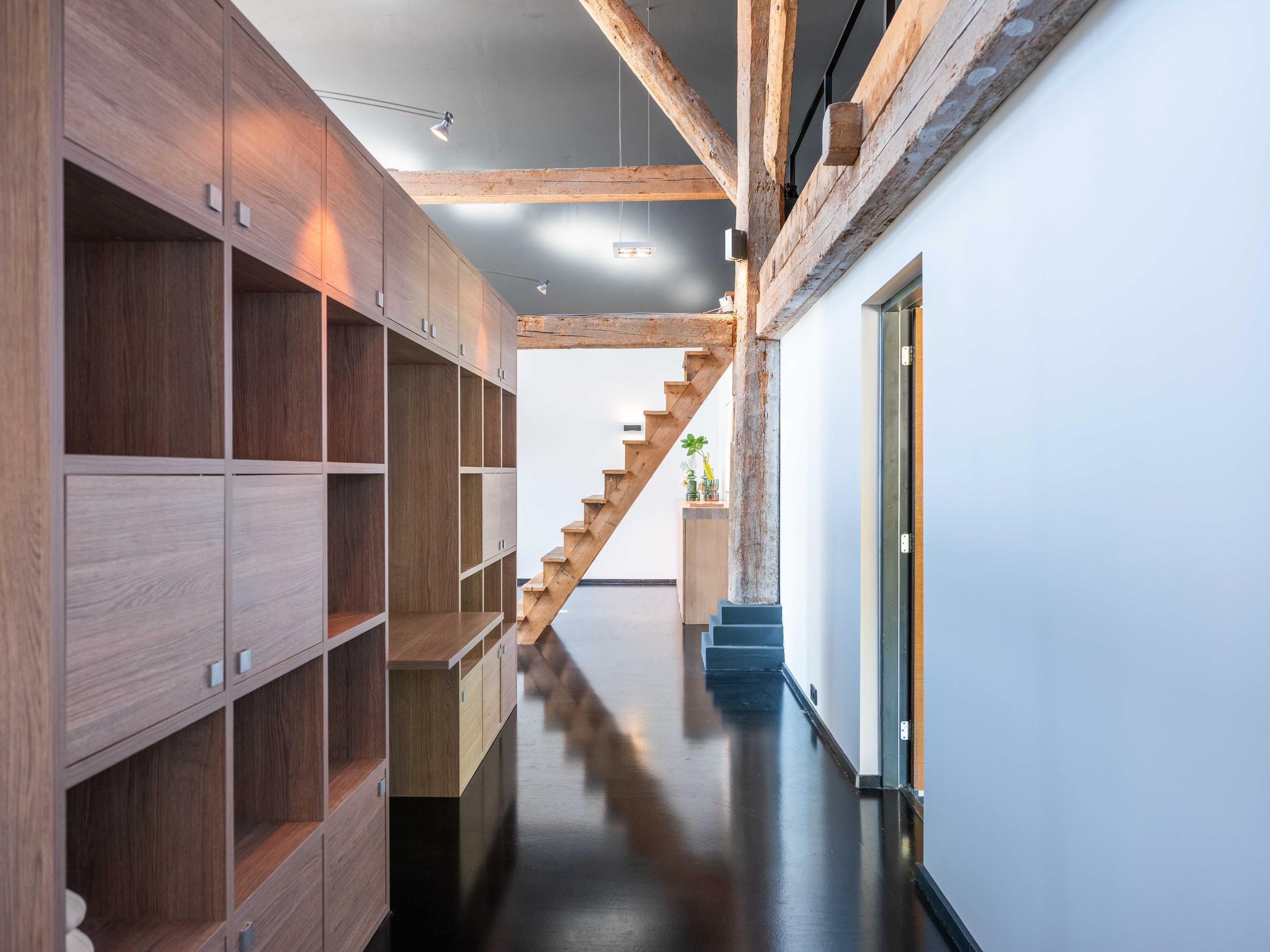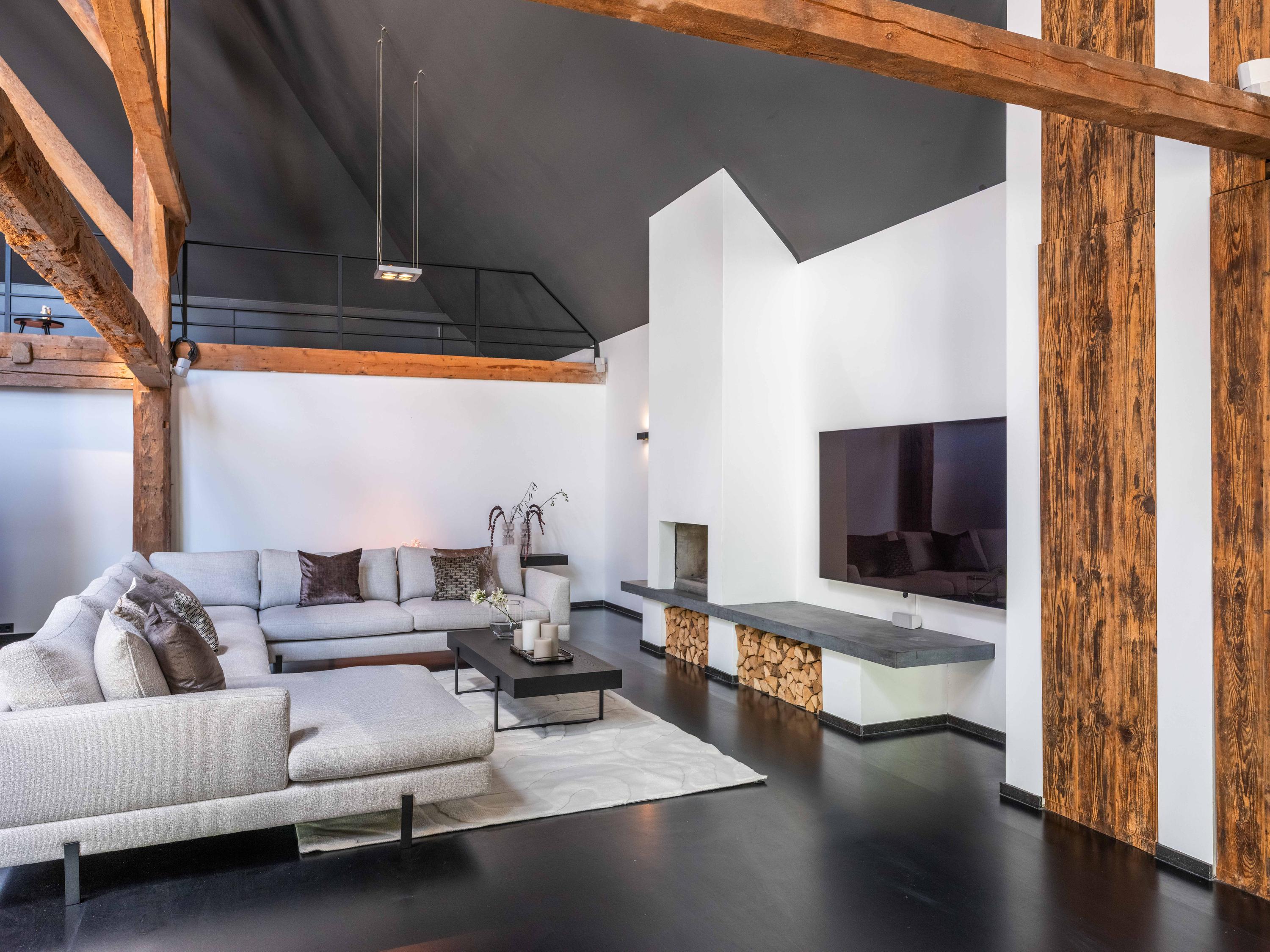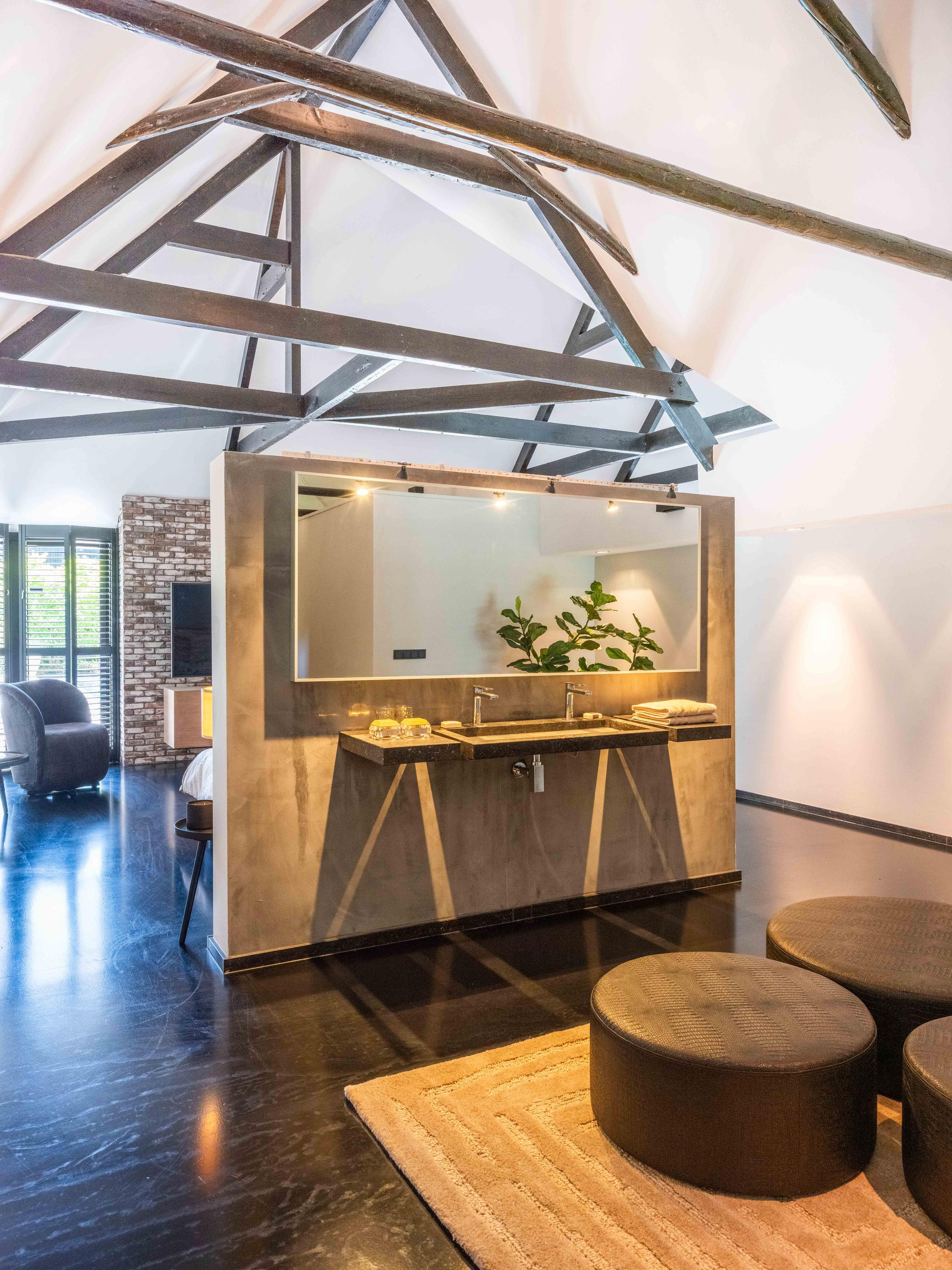 The living room where the ceiling, which reaches to the ridge, immediately catches the eye. The contrast of colours in the house enhance its sturdy character. This very spacious living room has a fireplace and French doors to the garden. The modern open kitchen is equipped with various built-in appliances, including a Boretti 8-burner cooker, an American fridge with coffee maker and plate warmer, oven, built-in fridge and dishwasher.