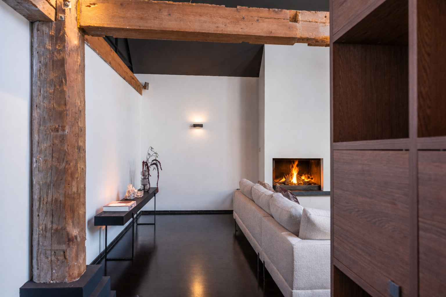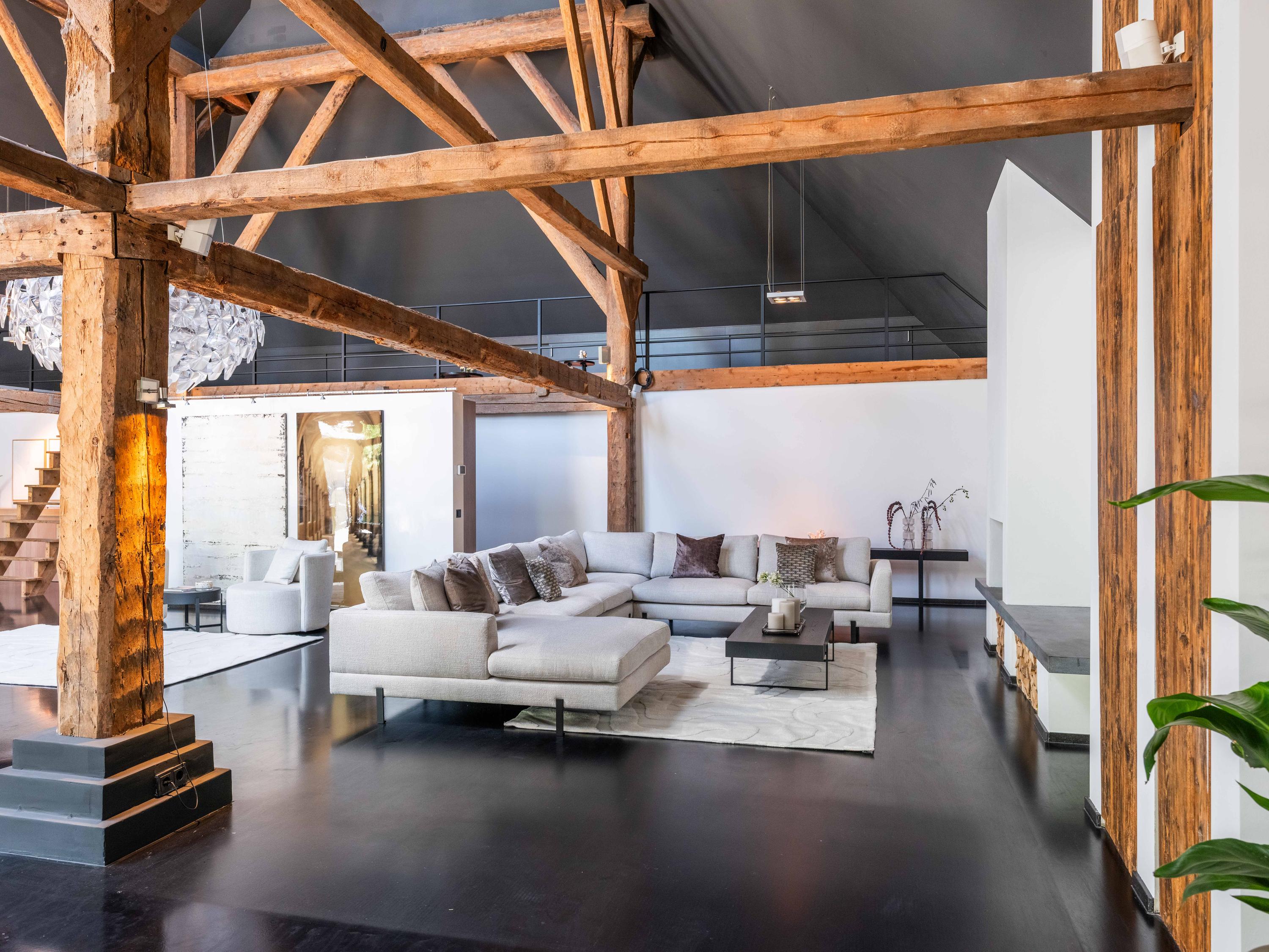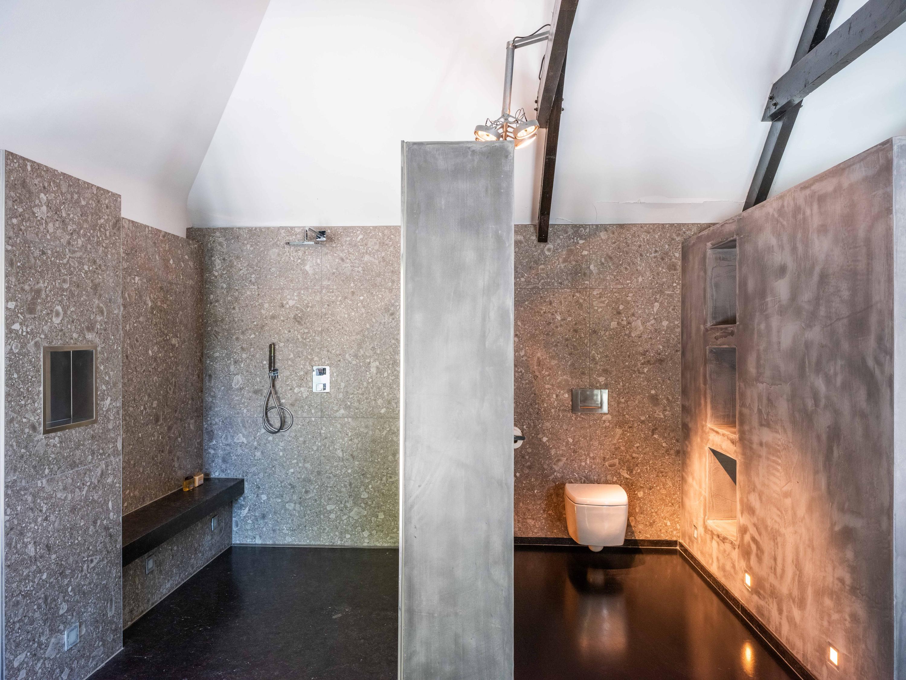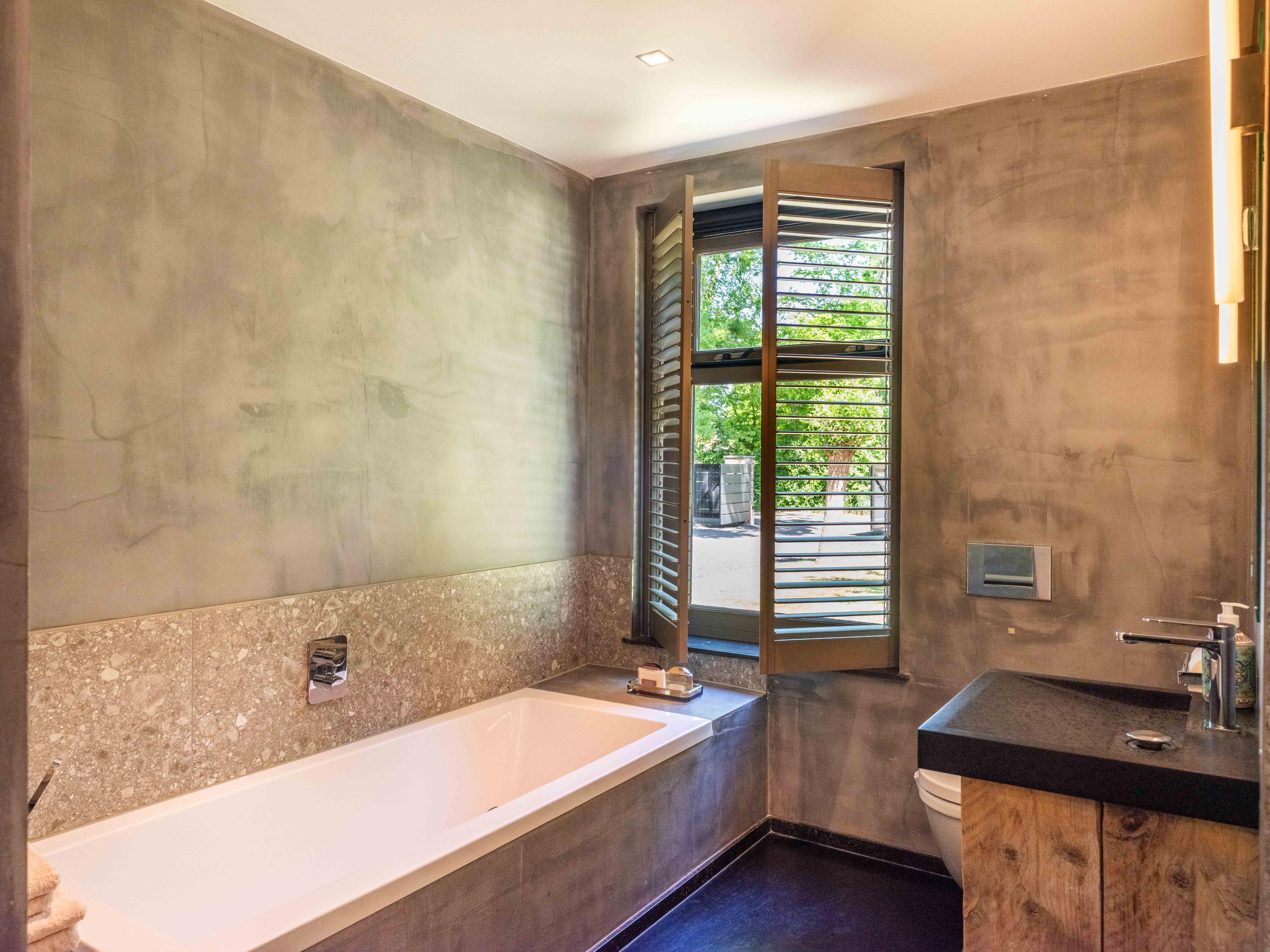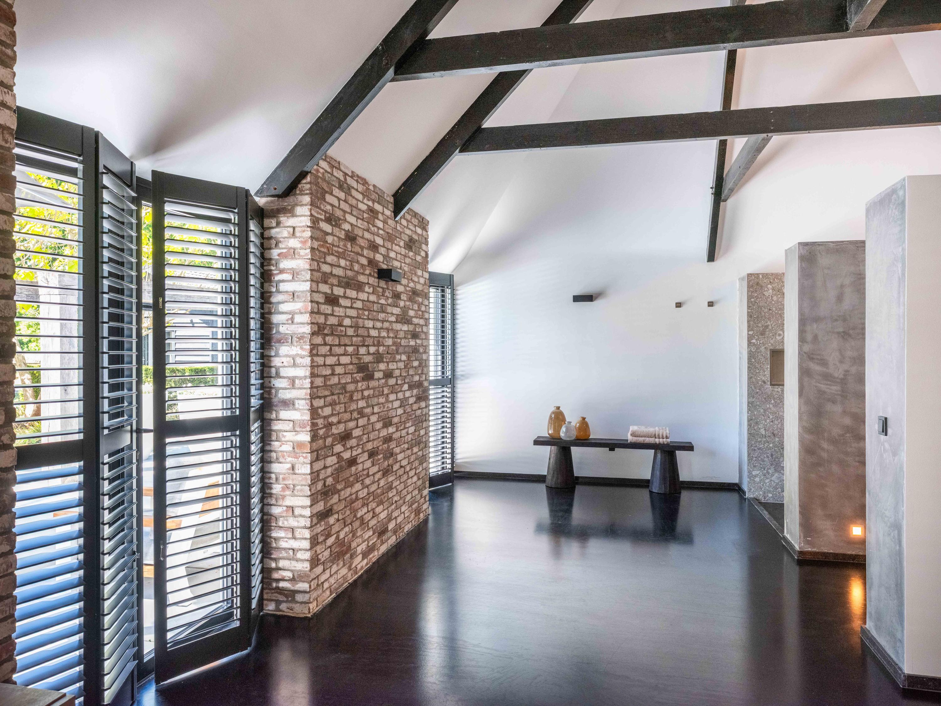 The living room where the ceiling, which reaches to the ridge, immediately catches the eye. The contrast of colours in the house enhance its sturdy character. This very spacious living room has a fireplace and French doors to the garden. The modern open kitchen is equipped with various built-in appliances, including a Boretti 8-burner cooker, an American fridge with coffee maker and plate warmer, oven, built-in fridge and dishwasher.