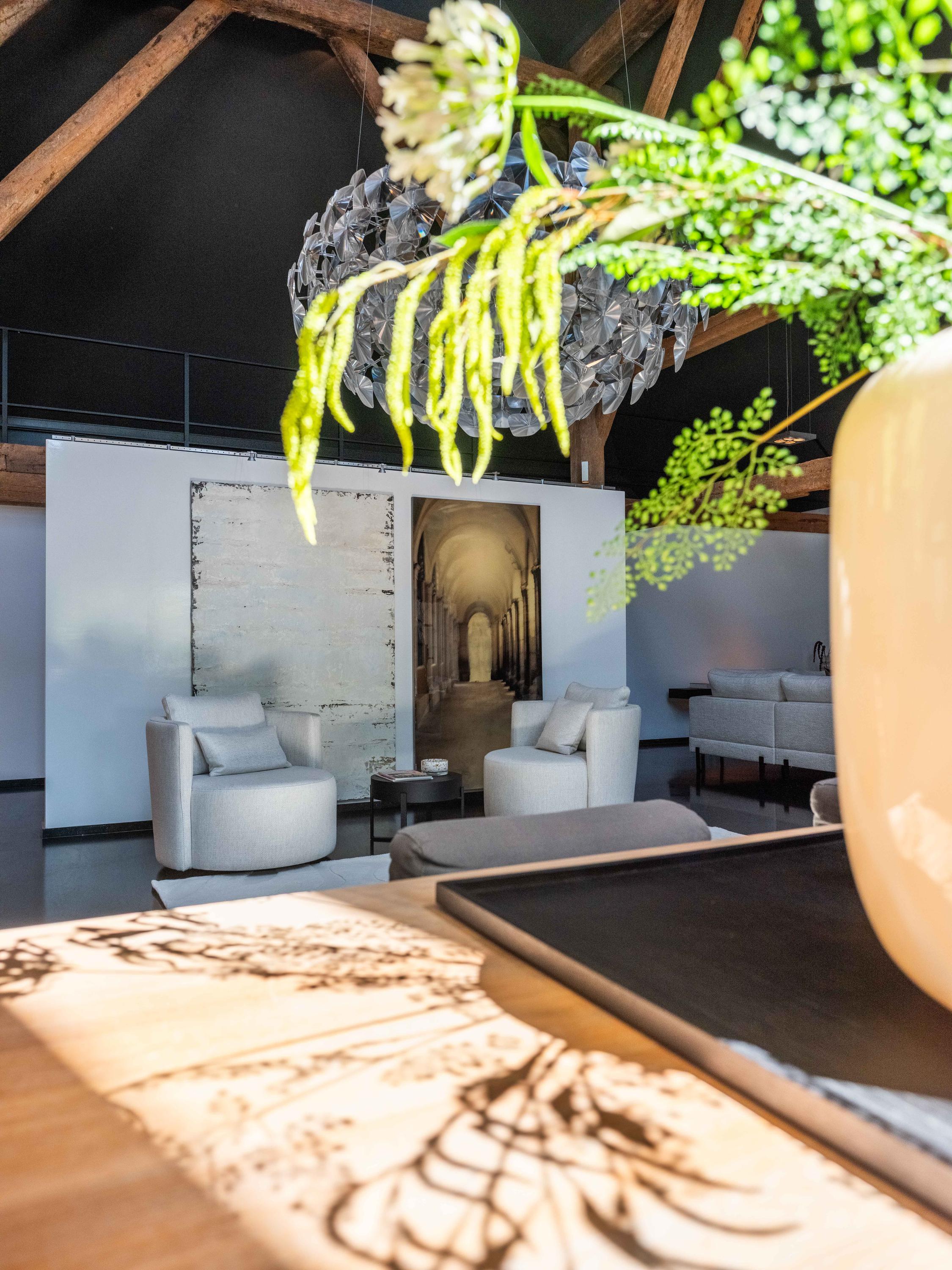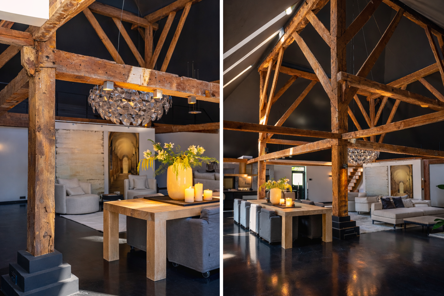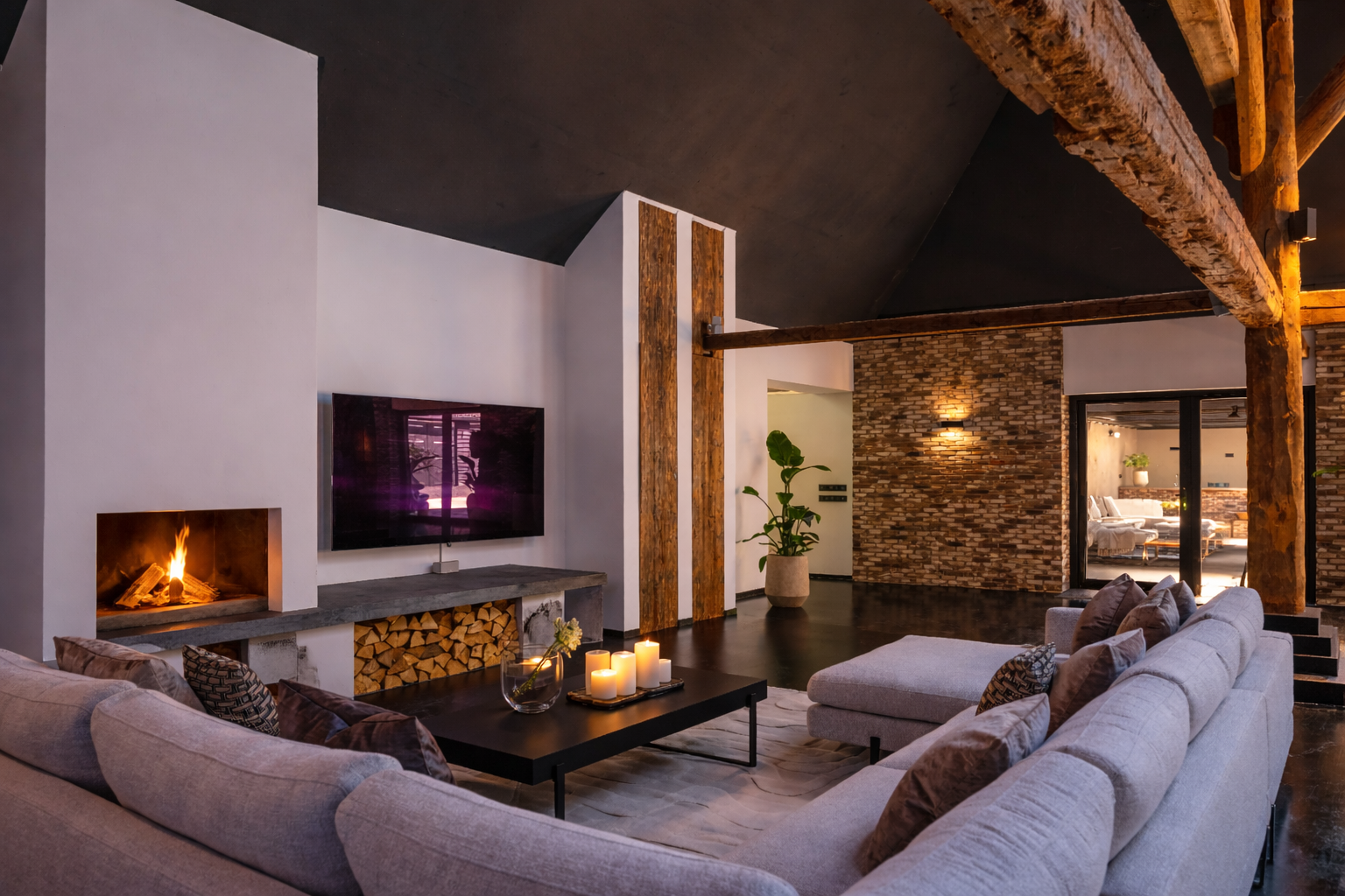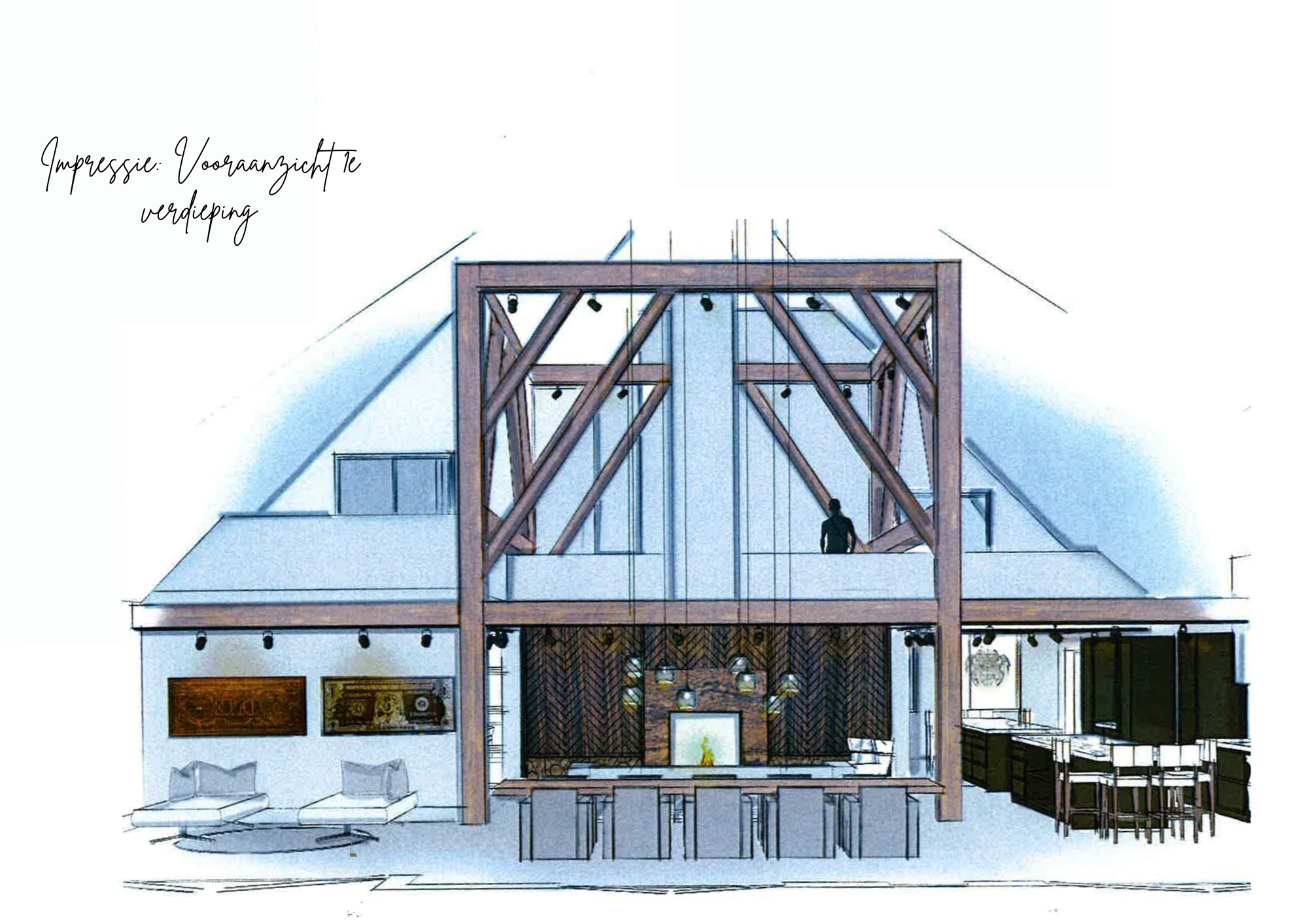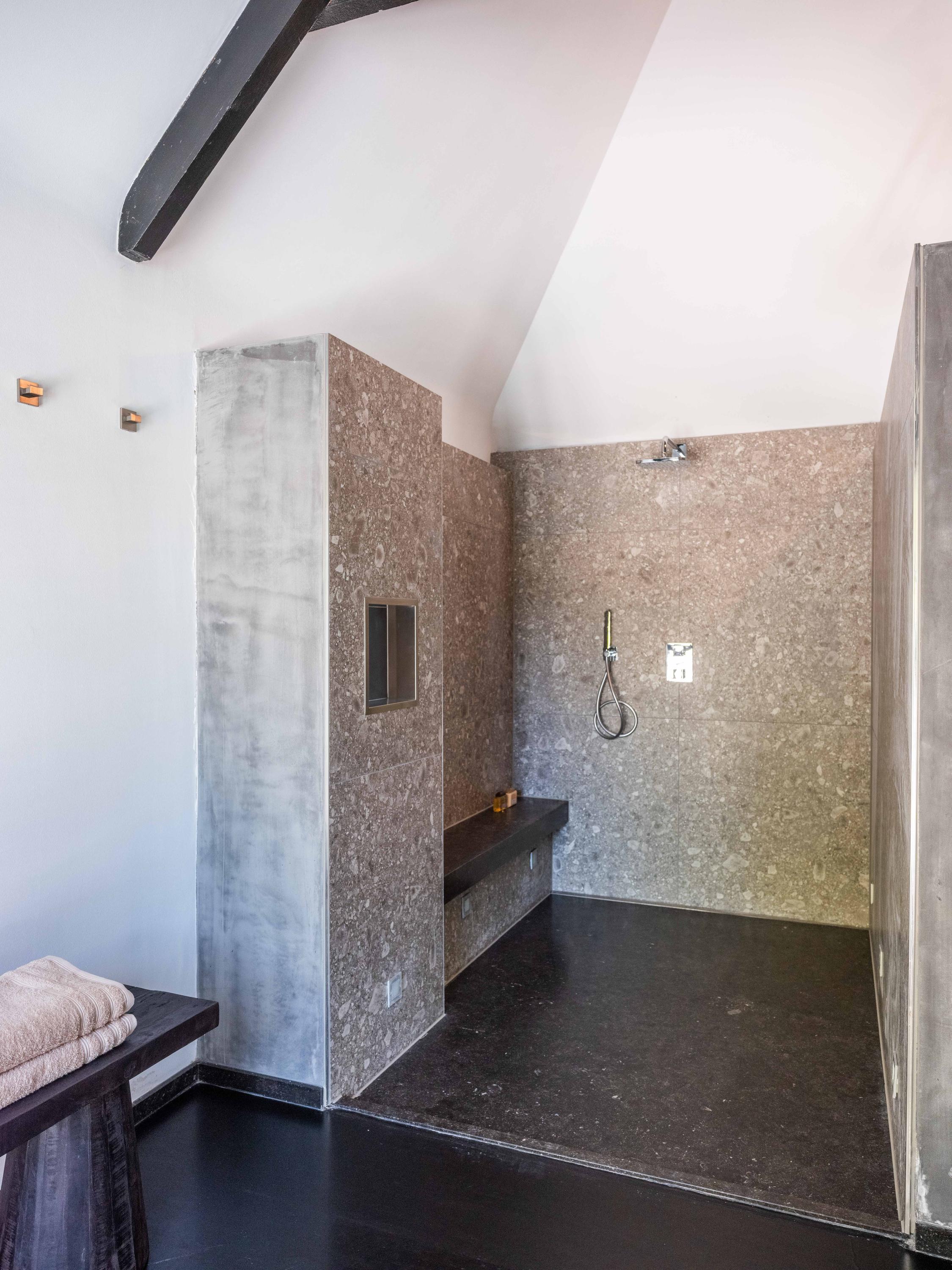 The living room where the ceiling, which reaches to the ridge, immediately catches the eye. The contrast of colours in the house enhance its sturdy character. This very spacious living room has a fireplace and French doors to the garden. The modern open kitchen is equipped with various built-in appliances, including a Boretti 8-burner cooker, an American fridge with coffee maker and plate warmer, oven, built-in fridge and dishwasher.