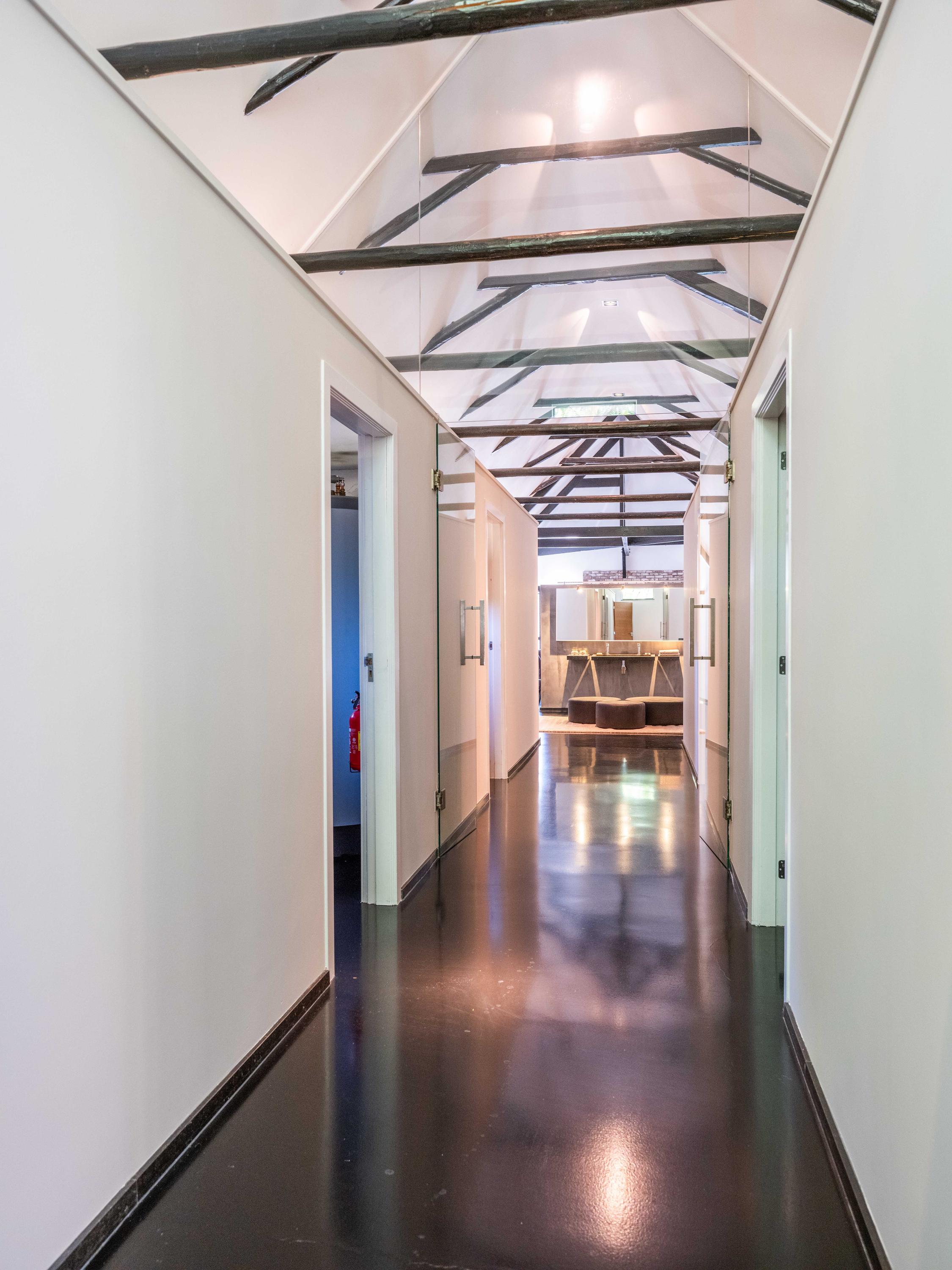 Upon entering this residential farmhouse, you enter a spacious hallway at the front which provides access to the first bedroom on the left and a second bedroom or study with an adjacent bathroom on the right. The room next to the bathroom offers great flexibility and can be used as either a workspace or a bedroom. The bathroom has a bathtub, toilet, washbasin and a walk-in shower. The hallway also houses the meter cupboard.
