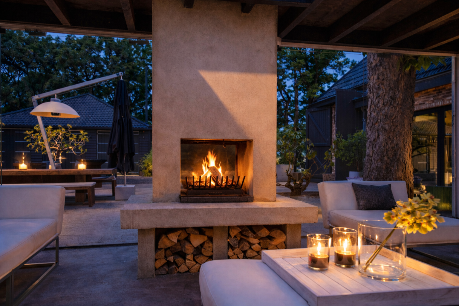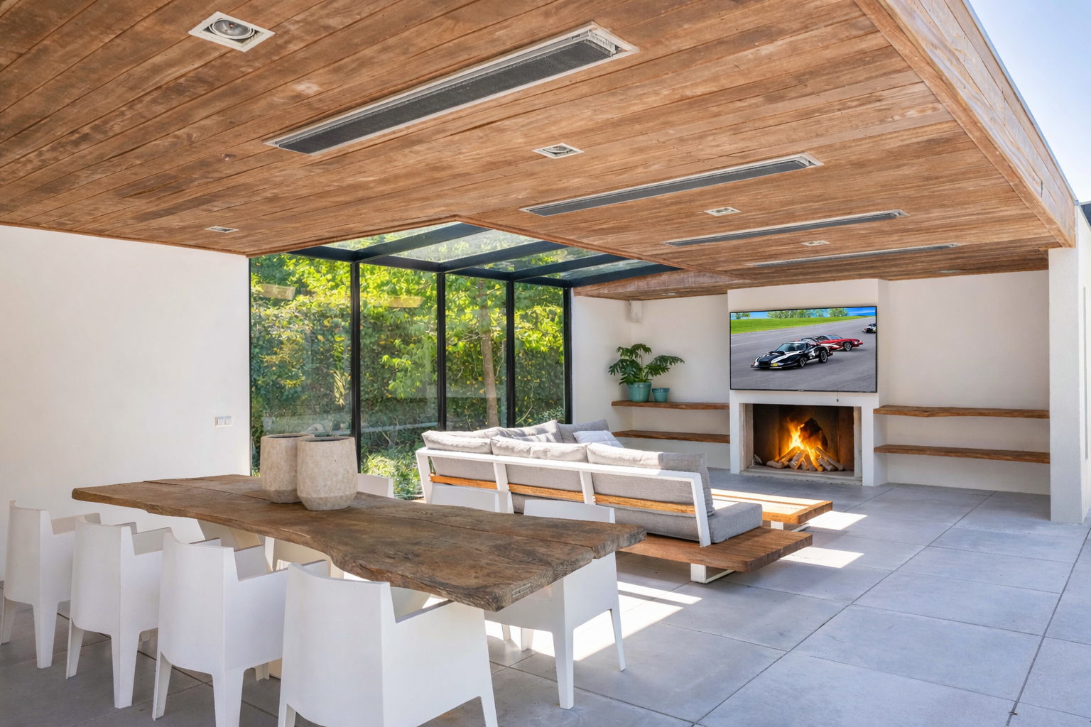 From the living room you have access to the conservatory, which is equipped with a fireplace, a pantry and a large lounge area. From the conservatory, you have beautiful views over the spaciously landscaped garden.