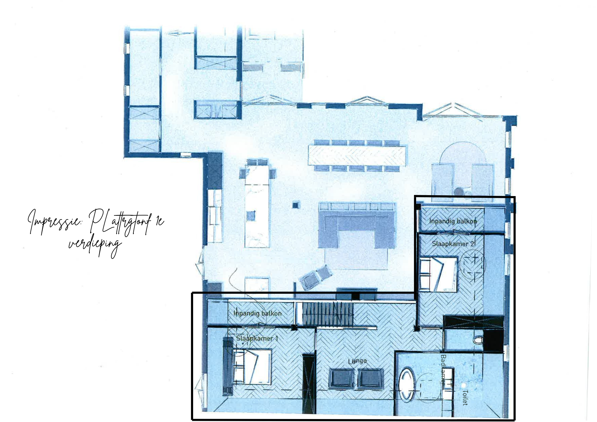 All facilities are on the ground floor, which makes the house extra accessible. The large windows provide plenty of light, making the rooms feel spacious and inviting. The living room also has a staircase leading to the loft above the rooms at the front. The loft offers opportunities to create additional rooms-work space.