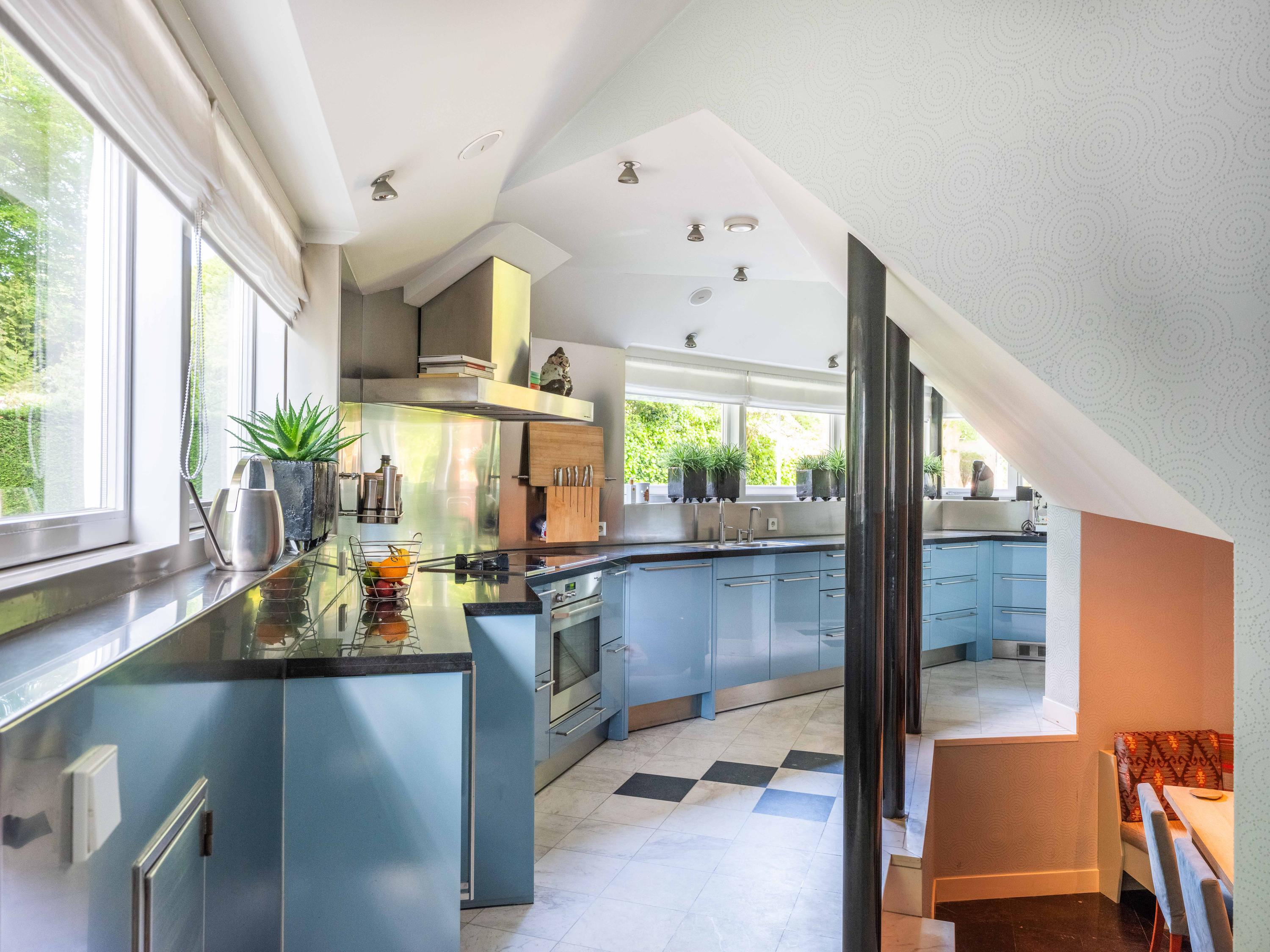 A few steps down from the hall leads to the kitchen, equipped with modern built-in appliances. Its shape, a half hexagon, gives it a playful and unique design, as does the dining area with space for a large table, which is one level lower.