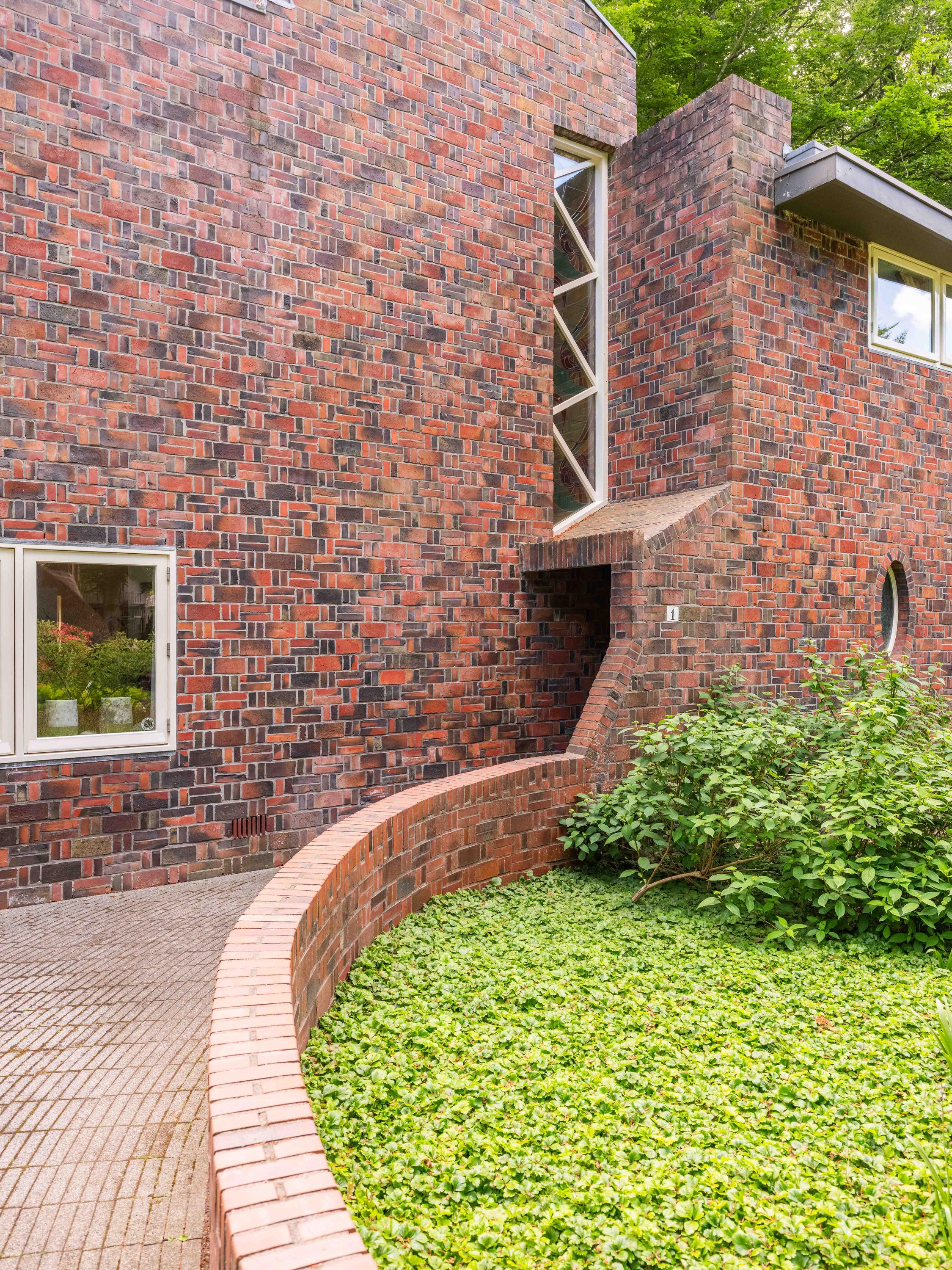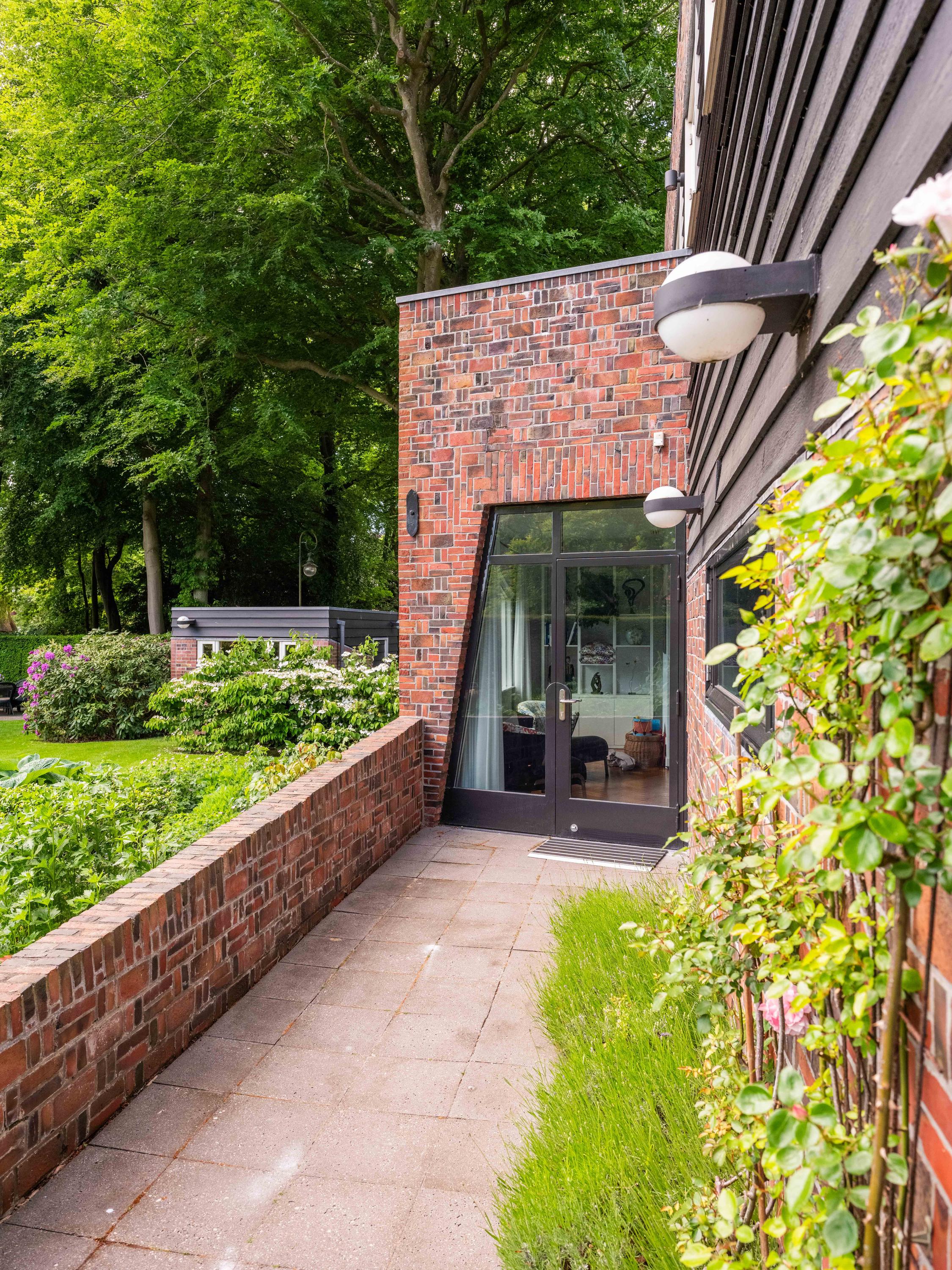 A winding path between beautifully shaped privet hedges leads to the hidden front door. Through the entrance, one enters the hall with a cloakroom, the stairs to the upper floor and a toilet.