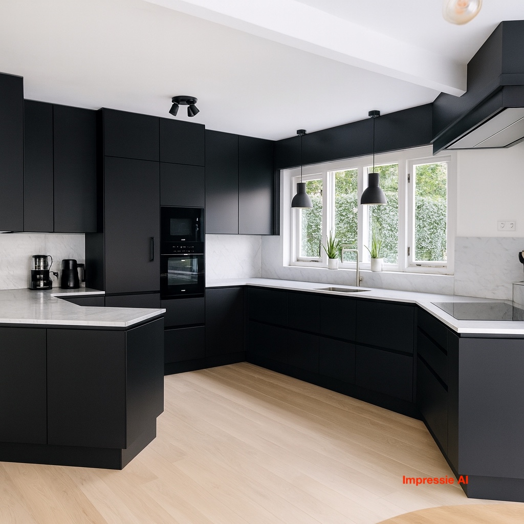 From the hall we enter the spacious kitchen, which is equipped with all kinds of appliances, such as a five-burner induction hob, quooker, steamer, two combi ovens etc. The cooking enthusiast can have a great time here.