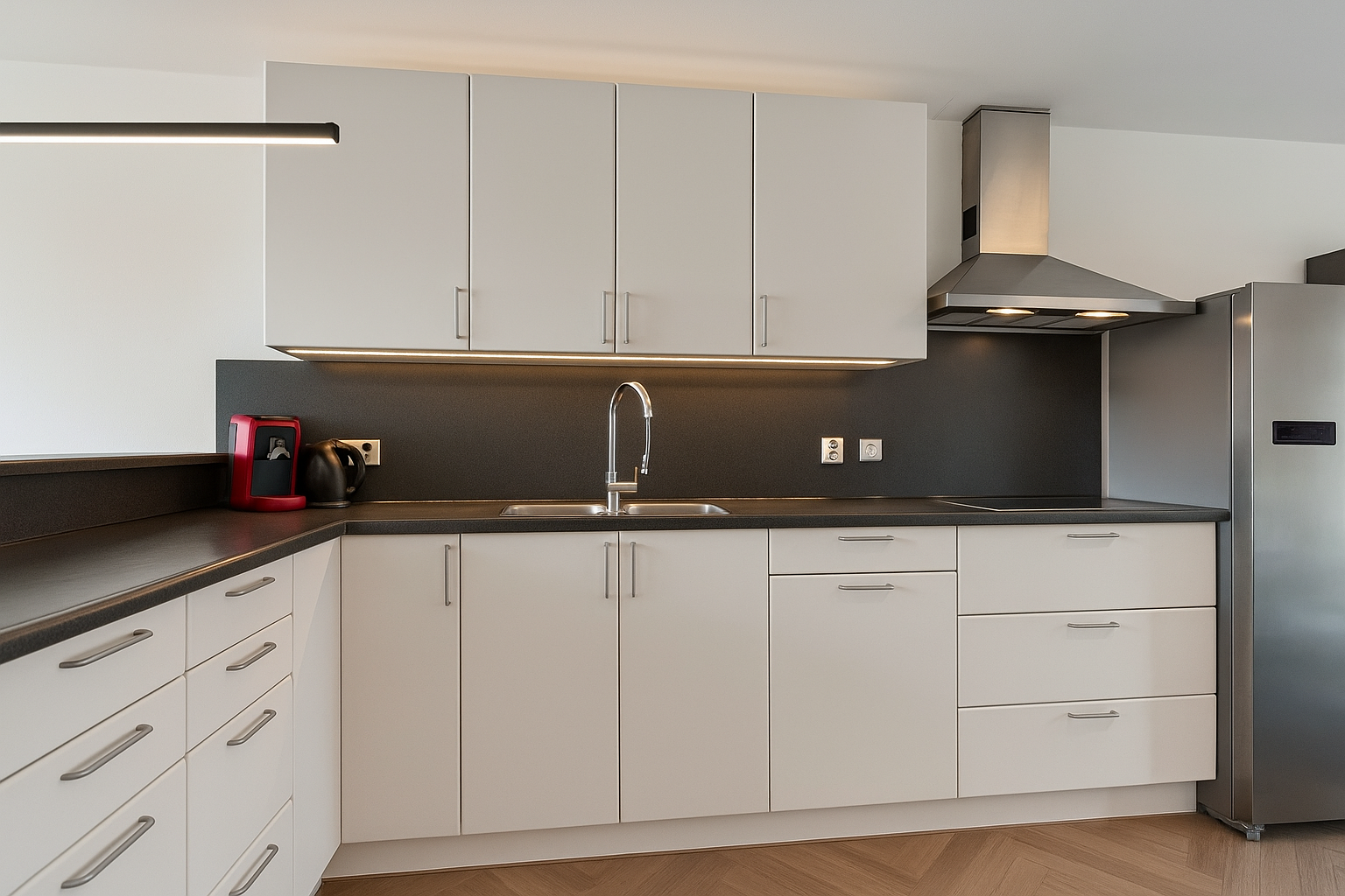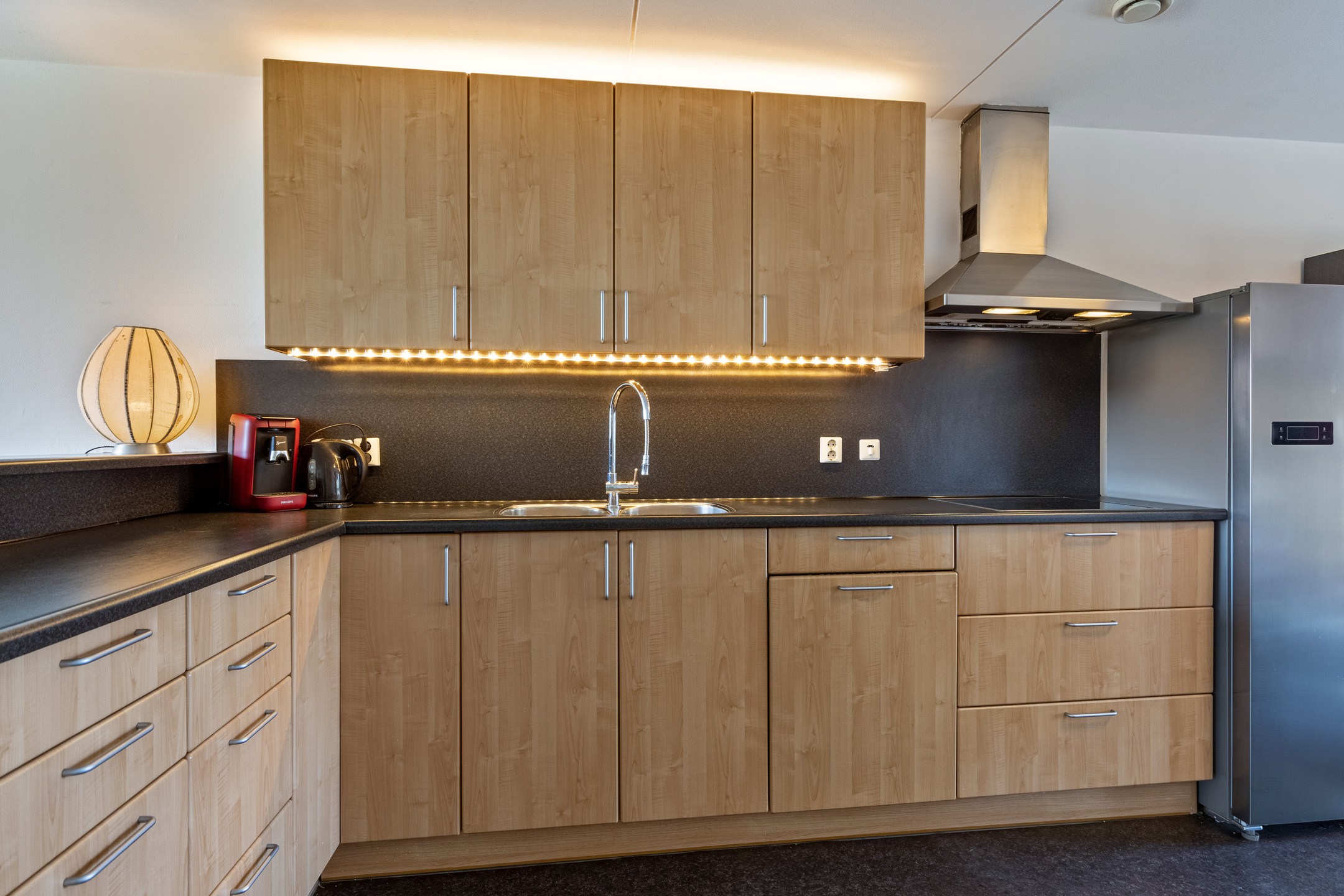 At the front is the open-plan kitchen, which offers plenty of storage space and is fully equipped with a sink and mixer tap, ceramic hob, extractor hood, refrigerator, freezer, and dishwasher.