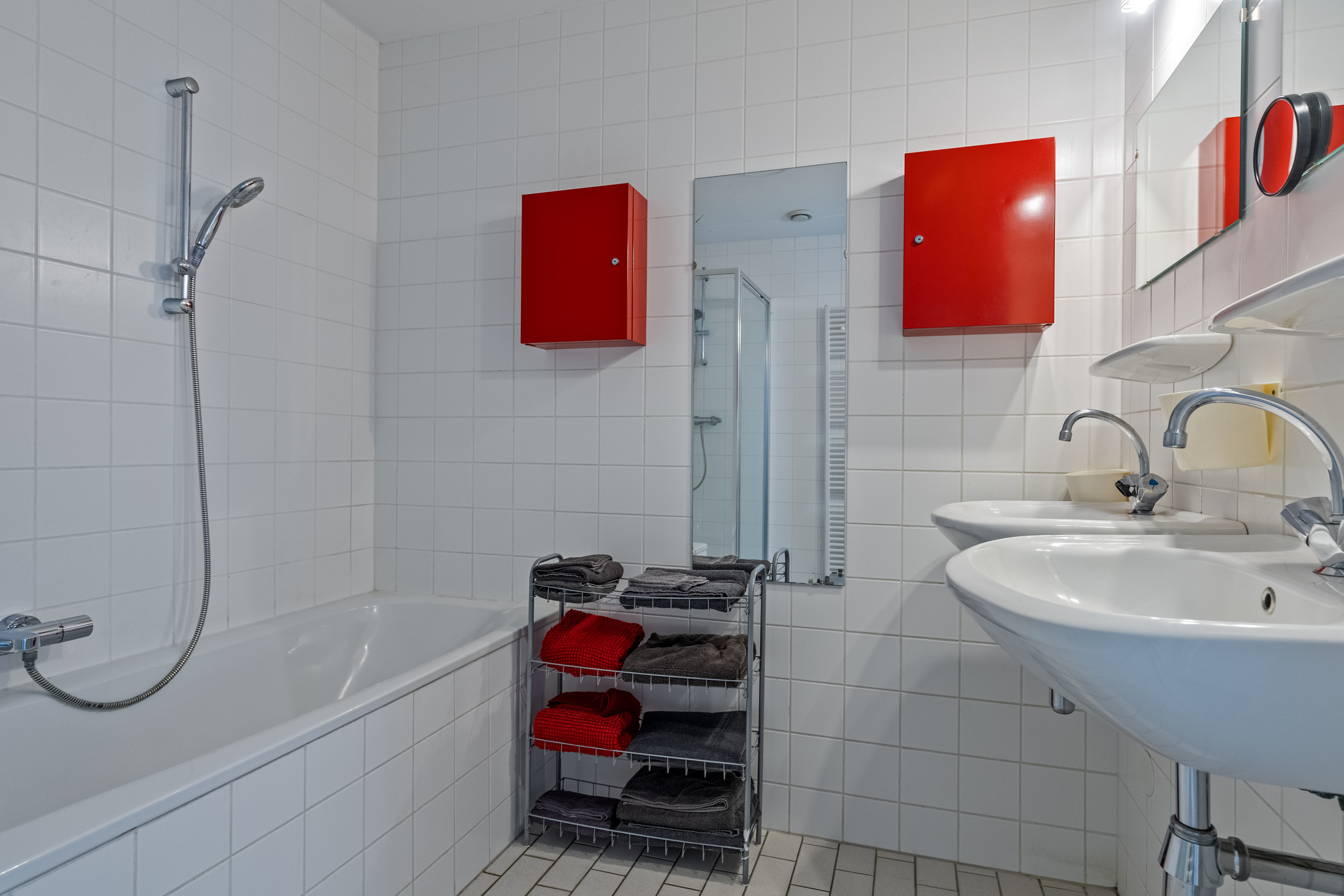 The centrally located bathroom includes a shower, bathtub, double sinks, and a towel radiator.