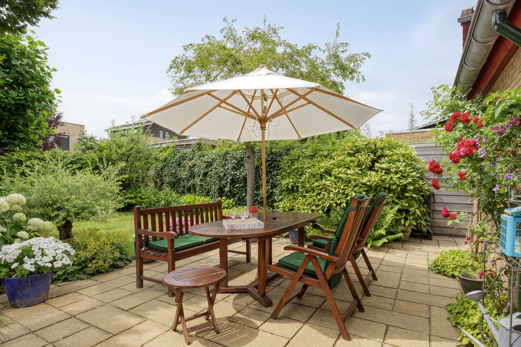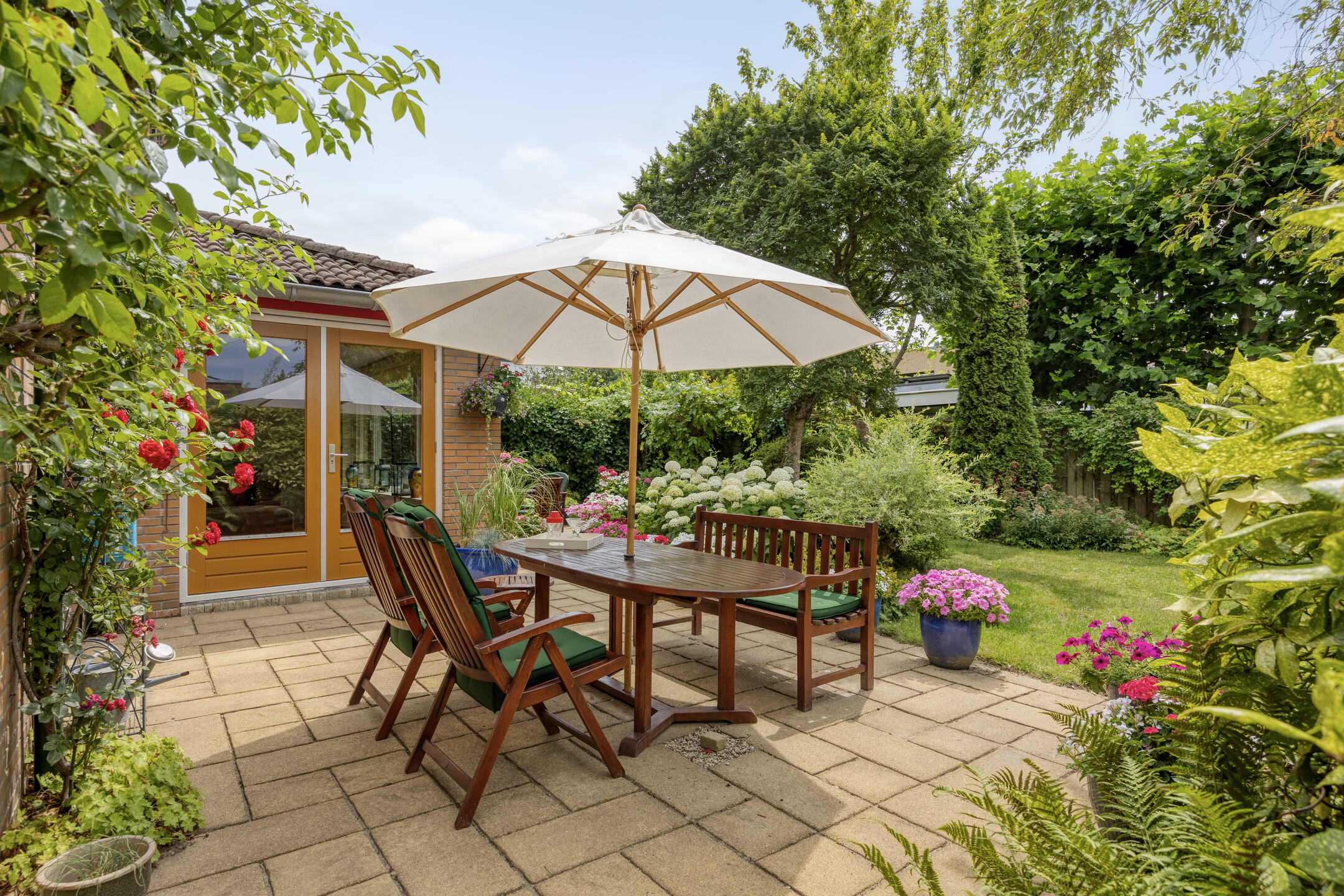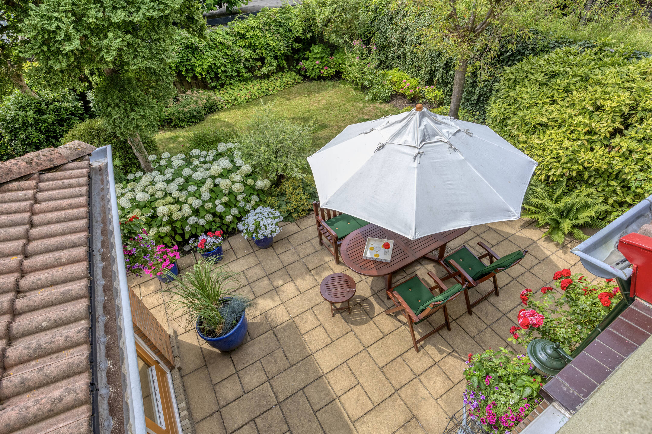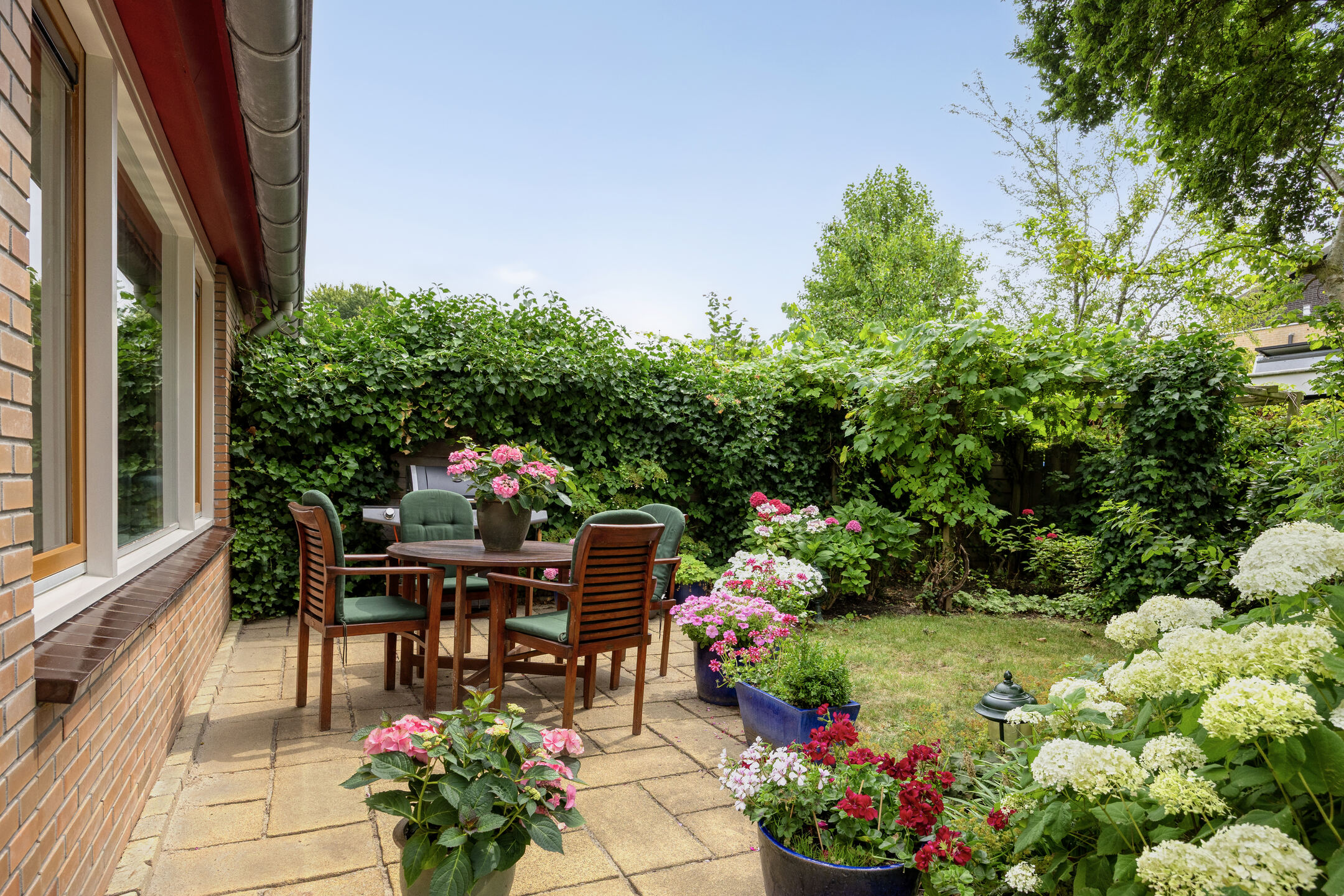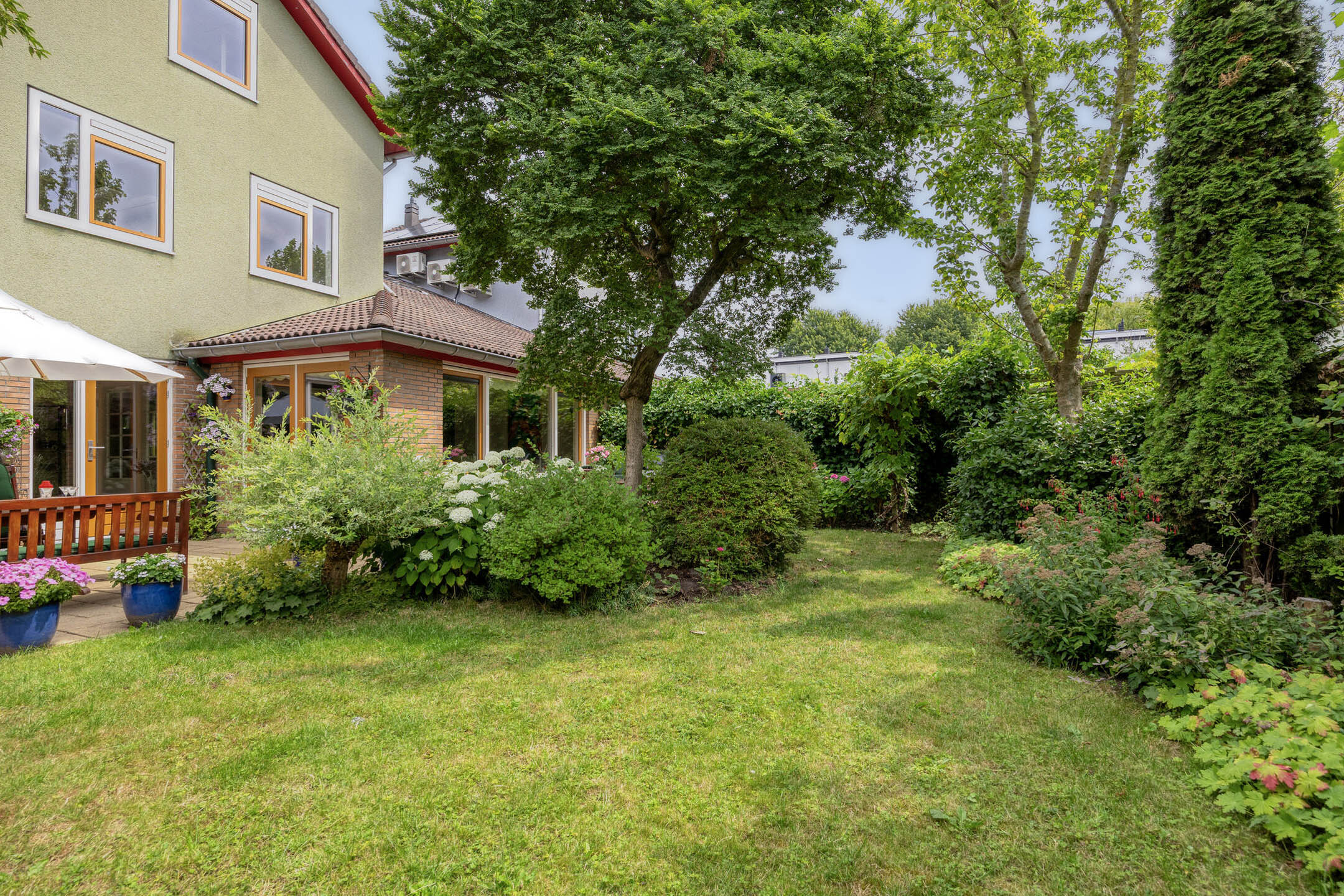 The beautifully landscaped garden faces southwest, providing plenty of sunshine and privacy. The combination of lawn, plants, shrubs, and trees creates a green and peaceful atmosphere, a wonderful place to relax or enjoy outdoor living.