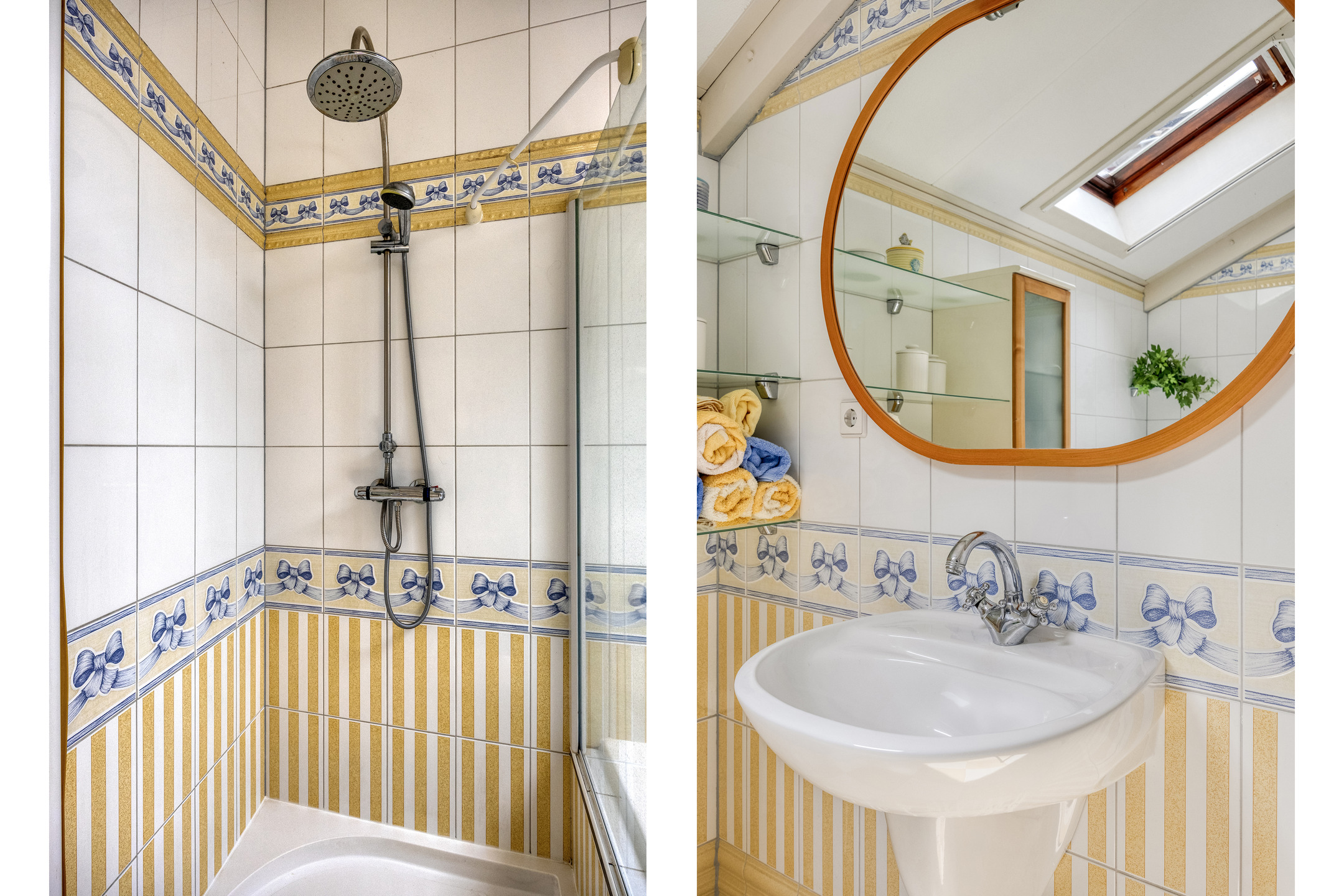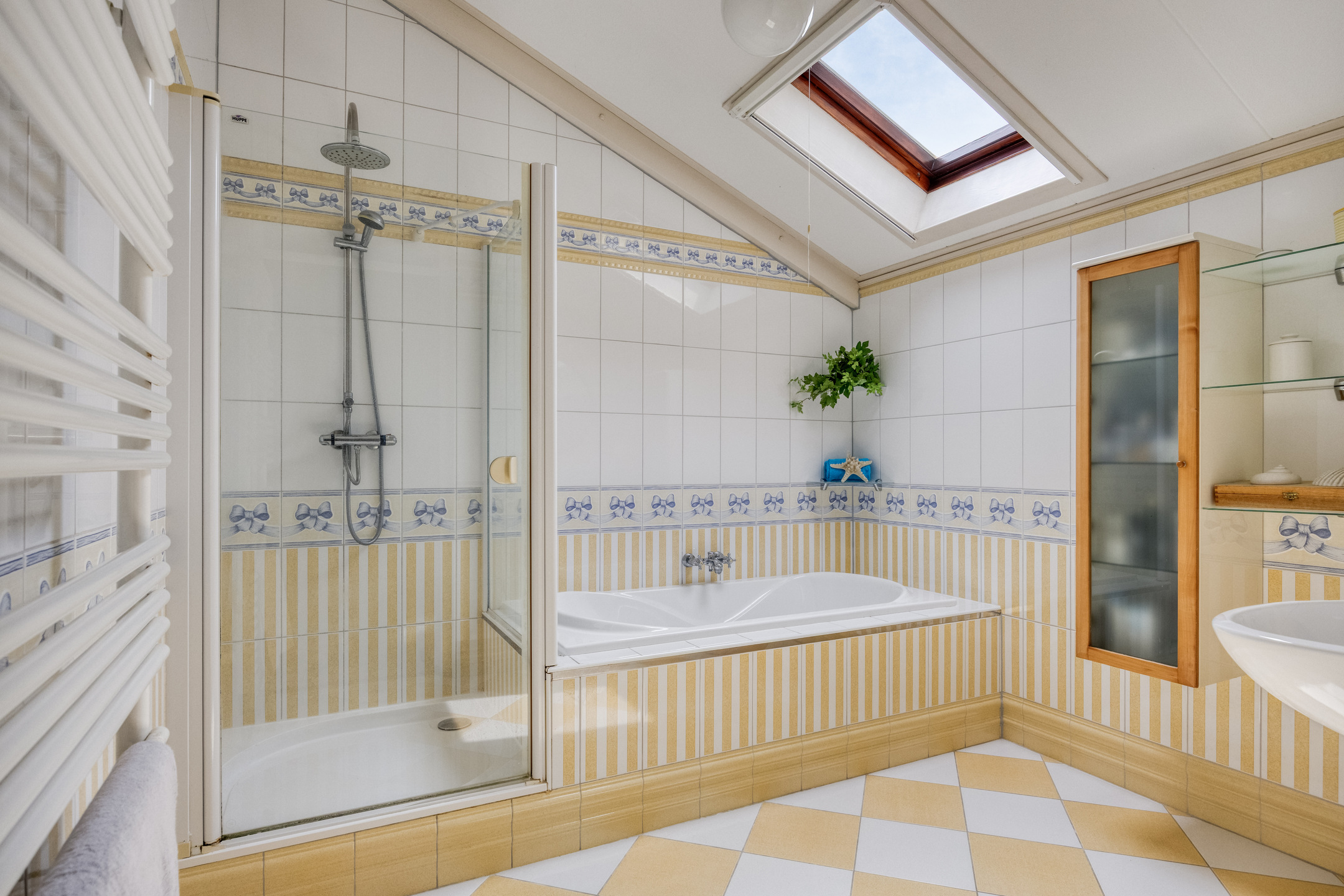 The bathroom includes a bathtub, shower, towel radiator, and washbasin.