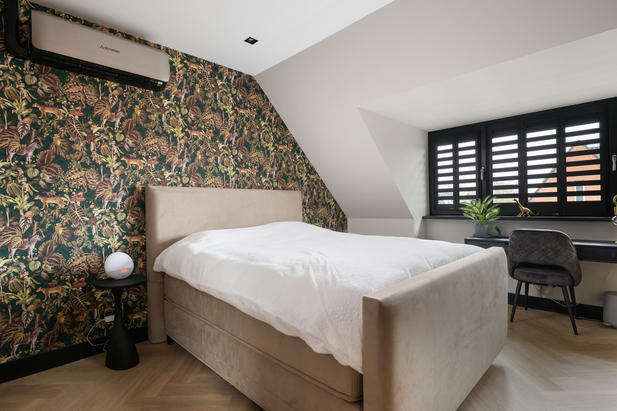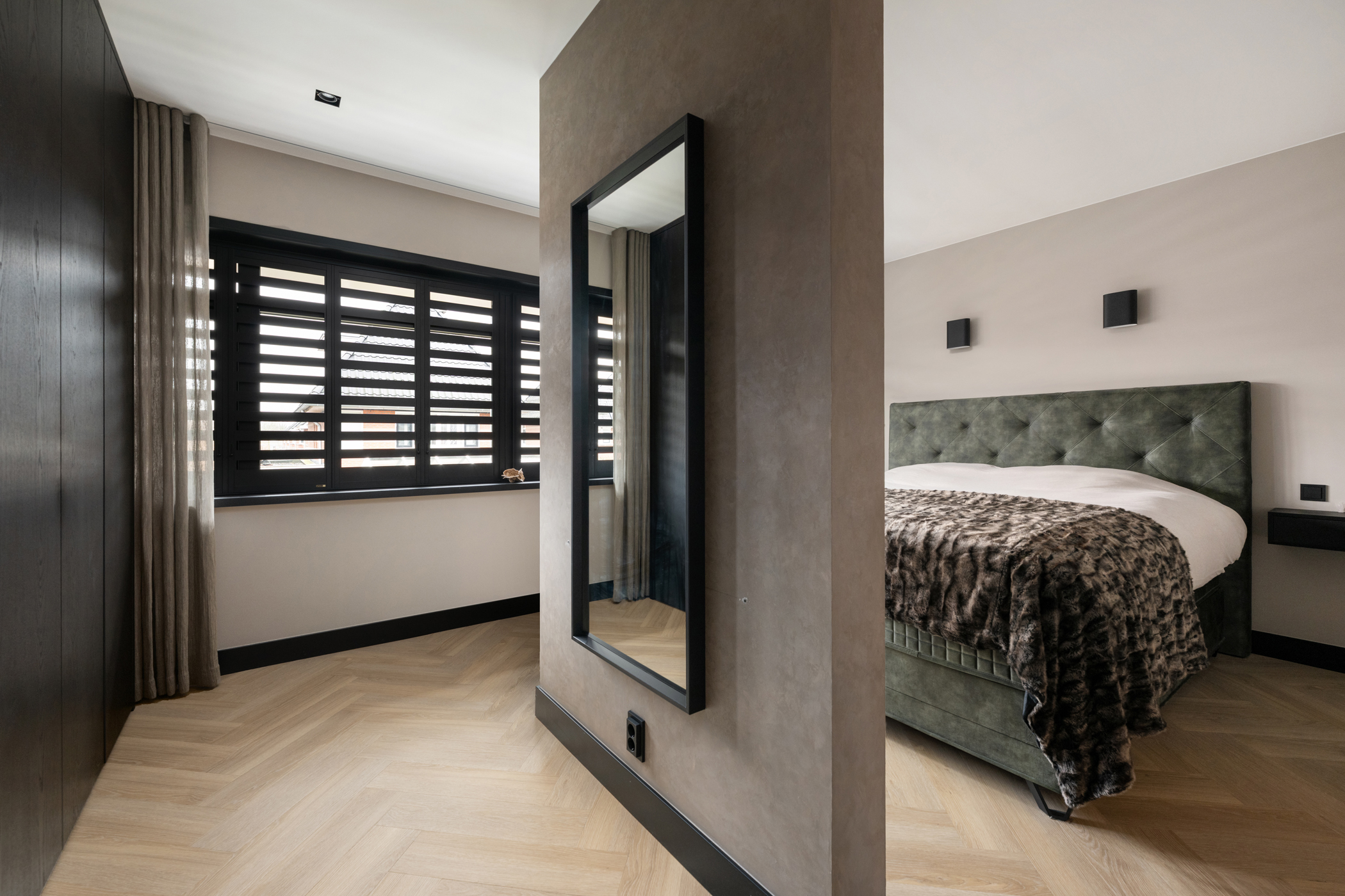 At the front you will find the third bedroom, equipped with air conditioning and built-in wardrobes hidden behind a stylish slatted wall.
