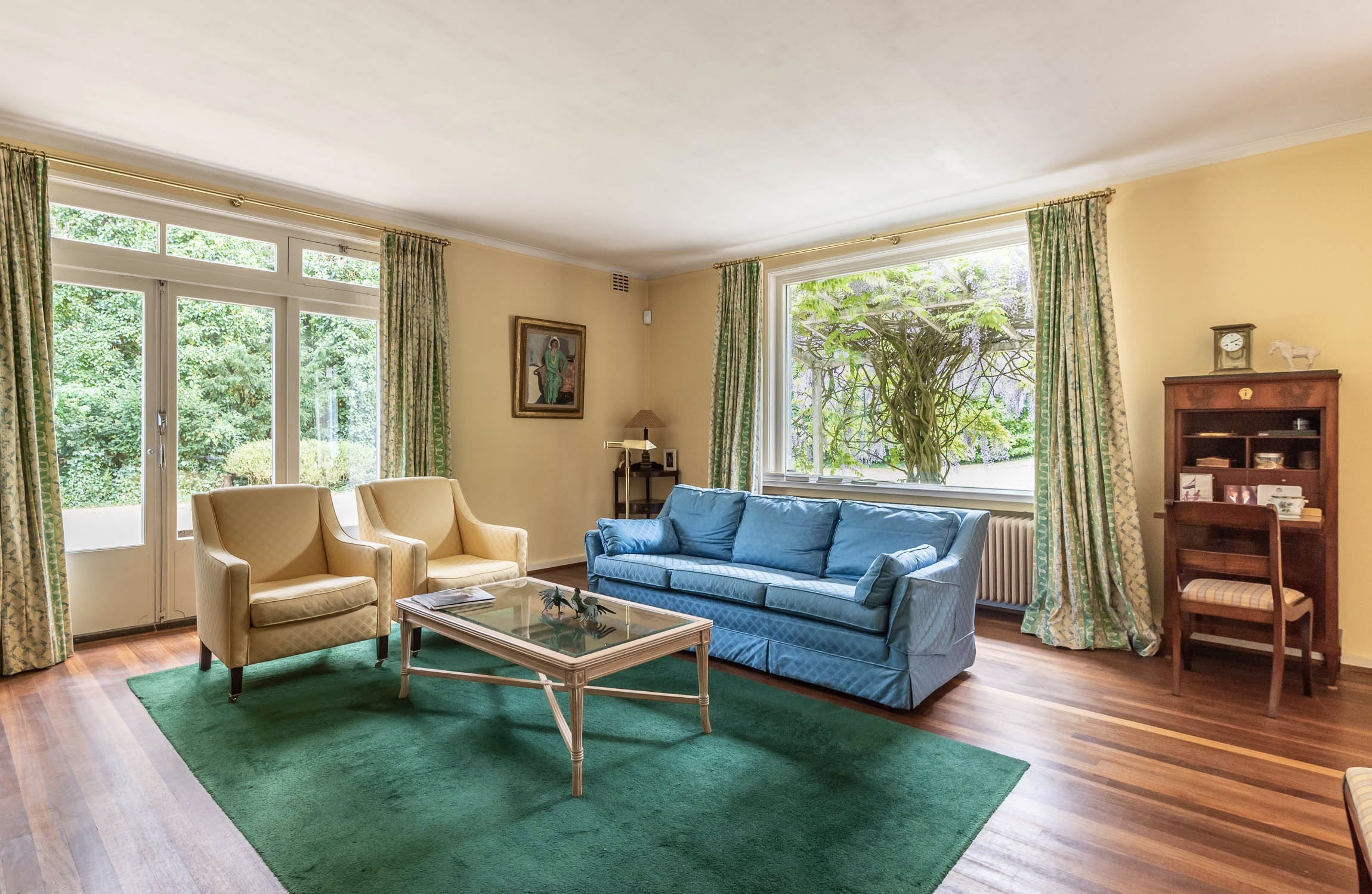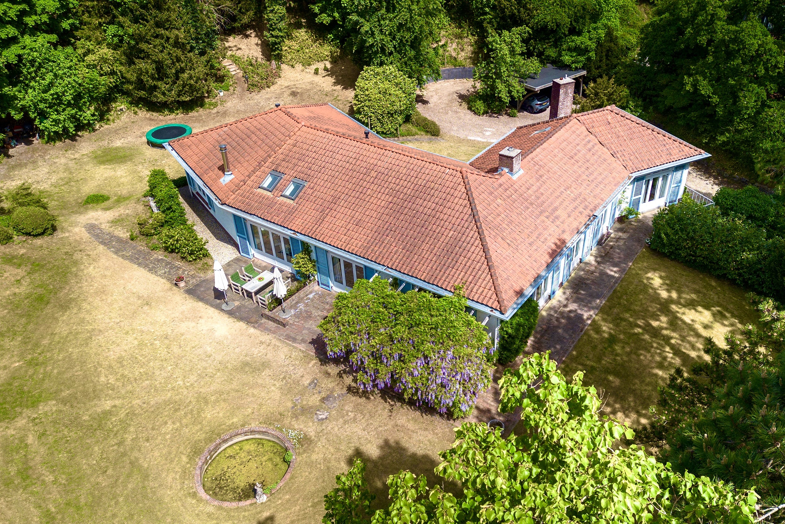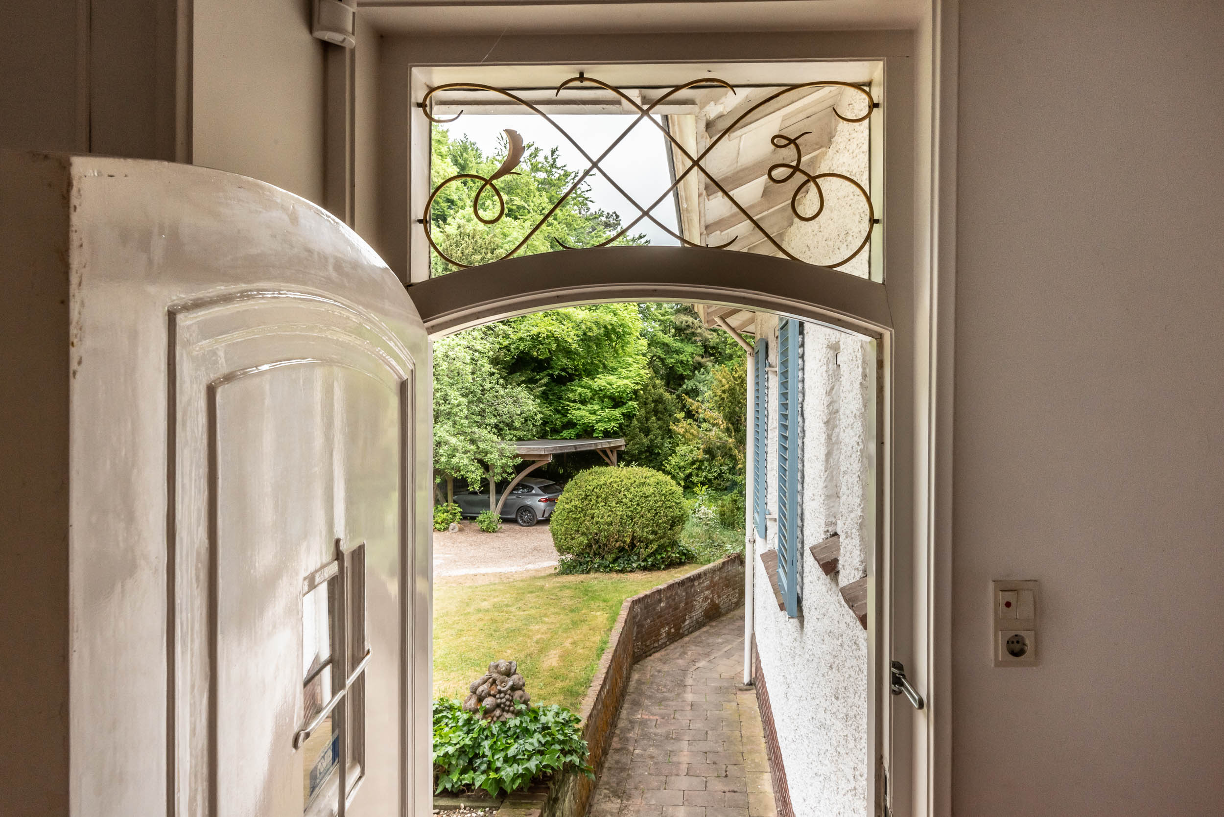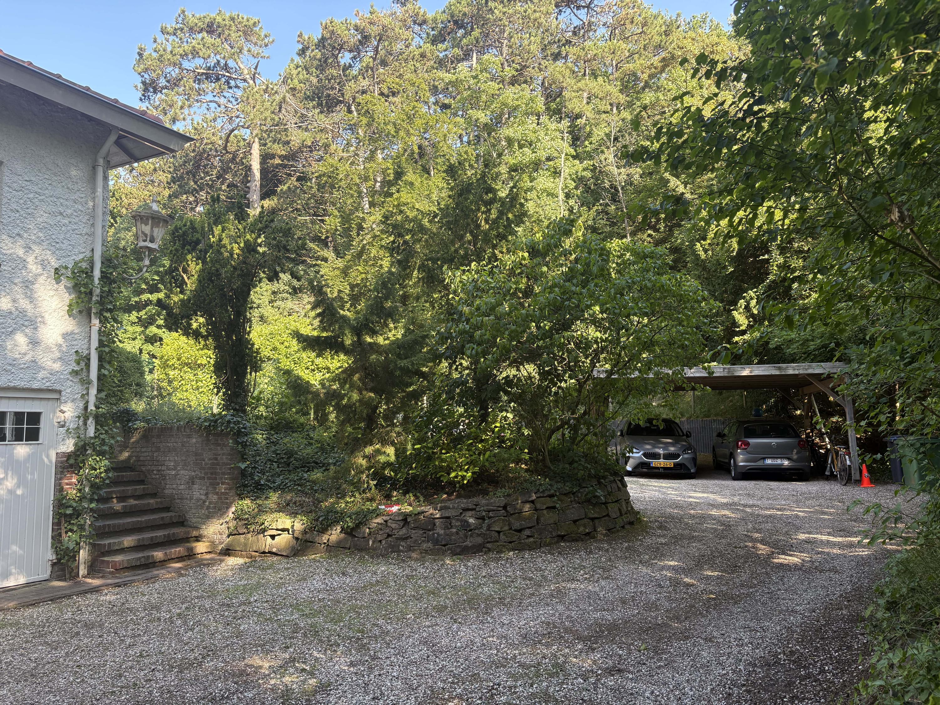 The villa exudes a Mediterranean feel with its light blue Louvre shutters, hipped roof and French tiles in the hallway. Set on a sunny plot spanning no less than 4420 m², it is surrounded by beautiful trees. The generously-sized driveway leads to the double carport with round point. There is ample parking space for several cars, as well as an indoor garage. The property has a comfortable and welcoming layout, with rooms that are nicely sized. Most of the rooms open onto the garden through French doors, which is unexpected because of the varied nature of the plot. The original architecture was reflected in an extension that was built in 2001.