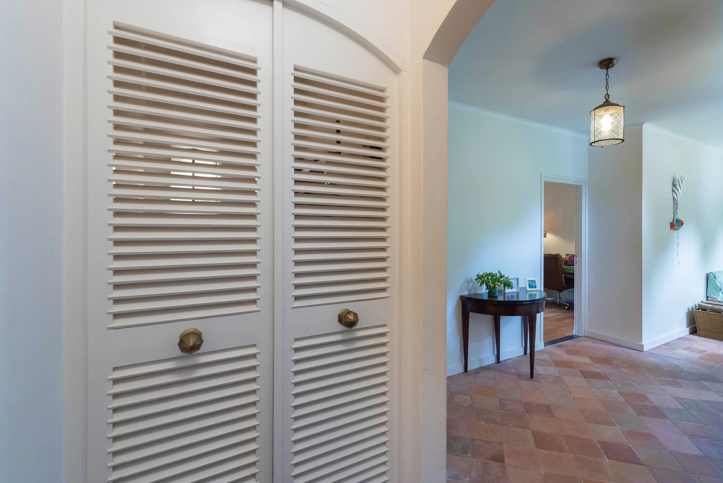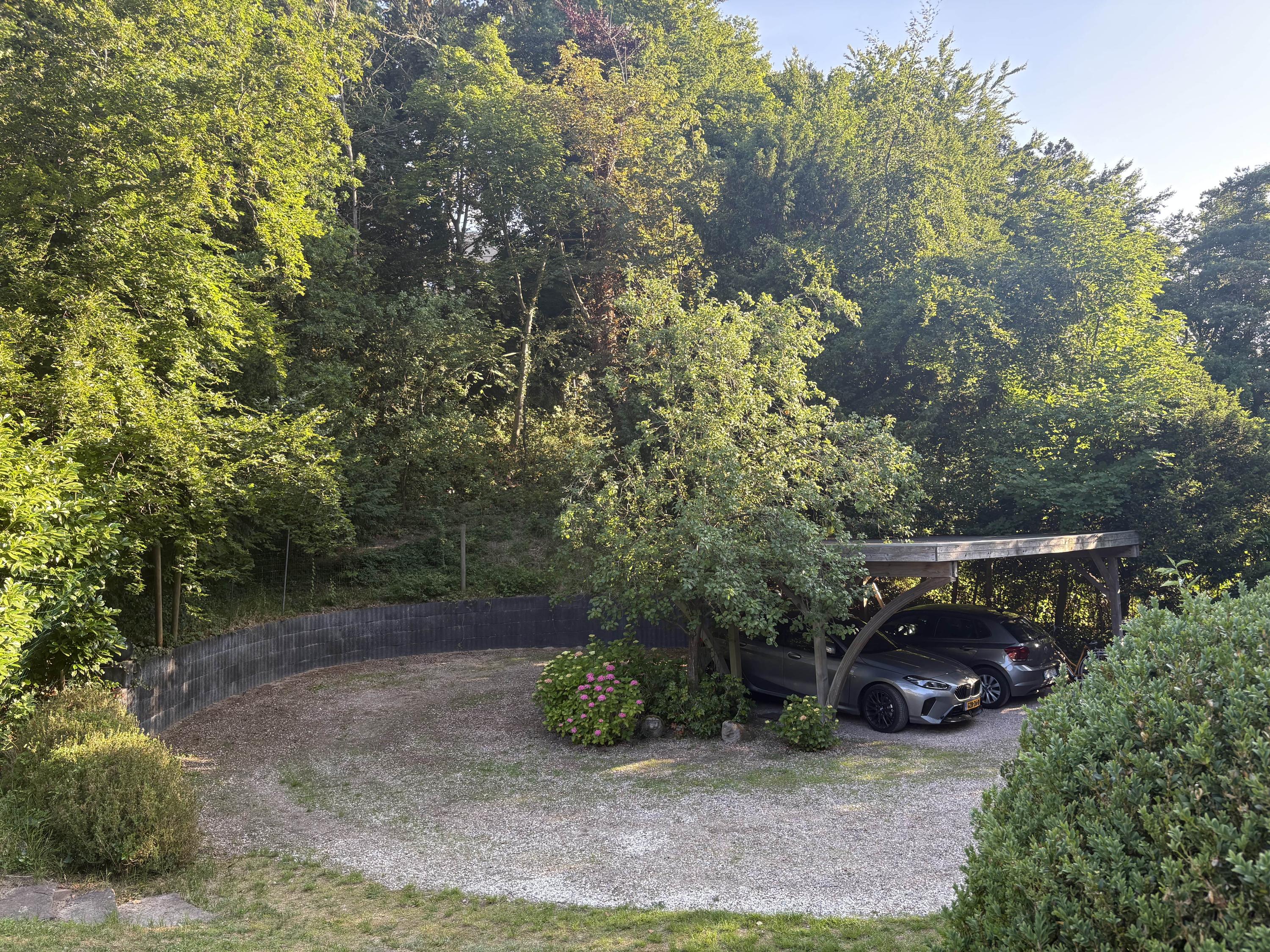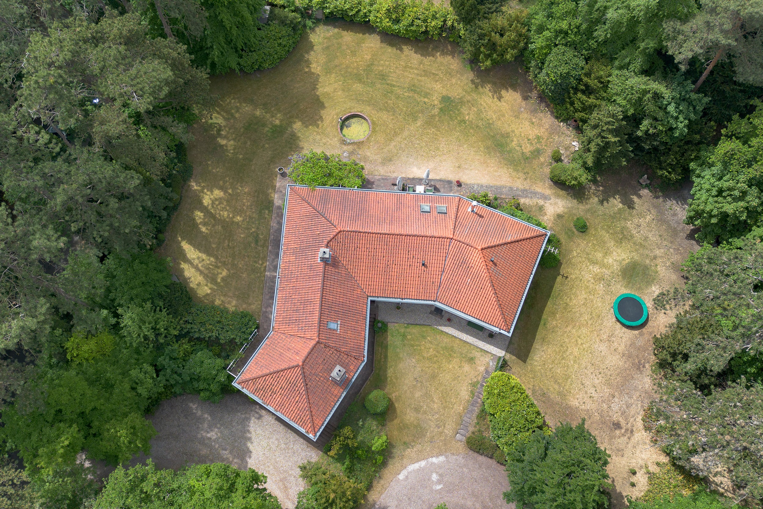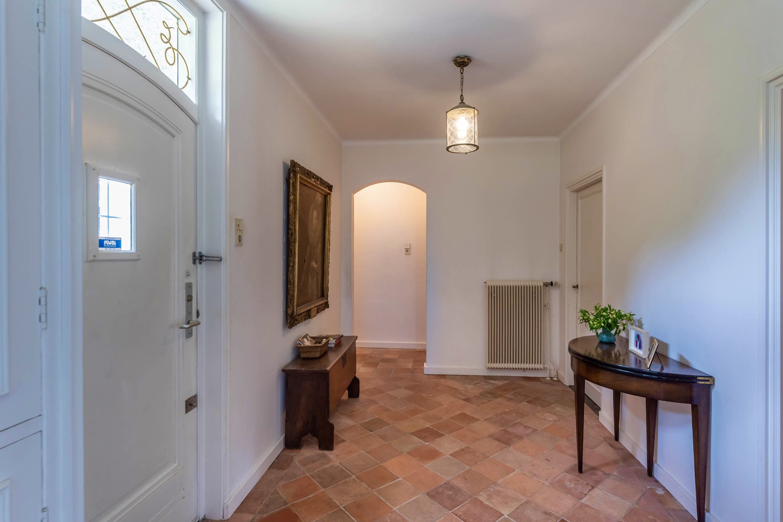 The villa exudes a Mediterranean feel with its light blue Louvre shutters, hipped roof and French tiles in the hallway. Set on a sunny plot spanning no less than 4420 m², it is surrounded by beautiful trees. The generously-sized driveway leads to the double carport with round point. There is ample parking space for several cars, as well as an indoor garage. The property has a comfortable and welcoming layout, with rooms that are nicely sized. Most of the rooms open onto the garden through French doors, which is unexpected because of the varied nature of the plot. The original architecture was reflected in an extension that was built in 2001.