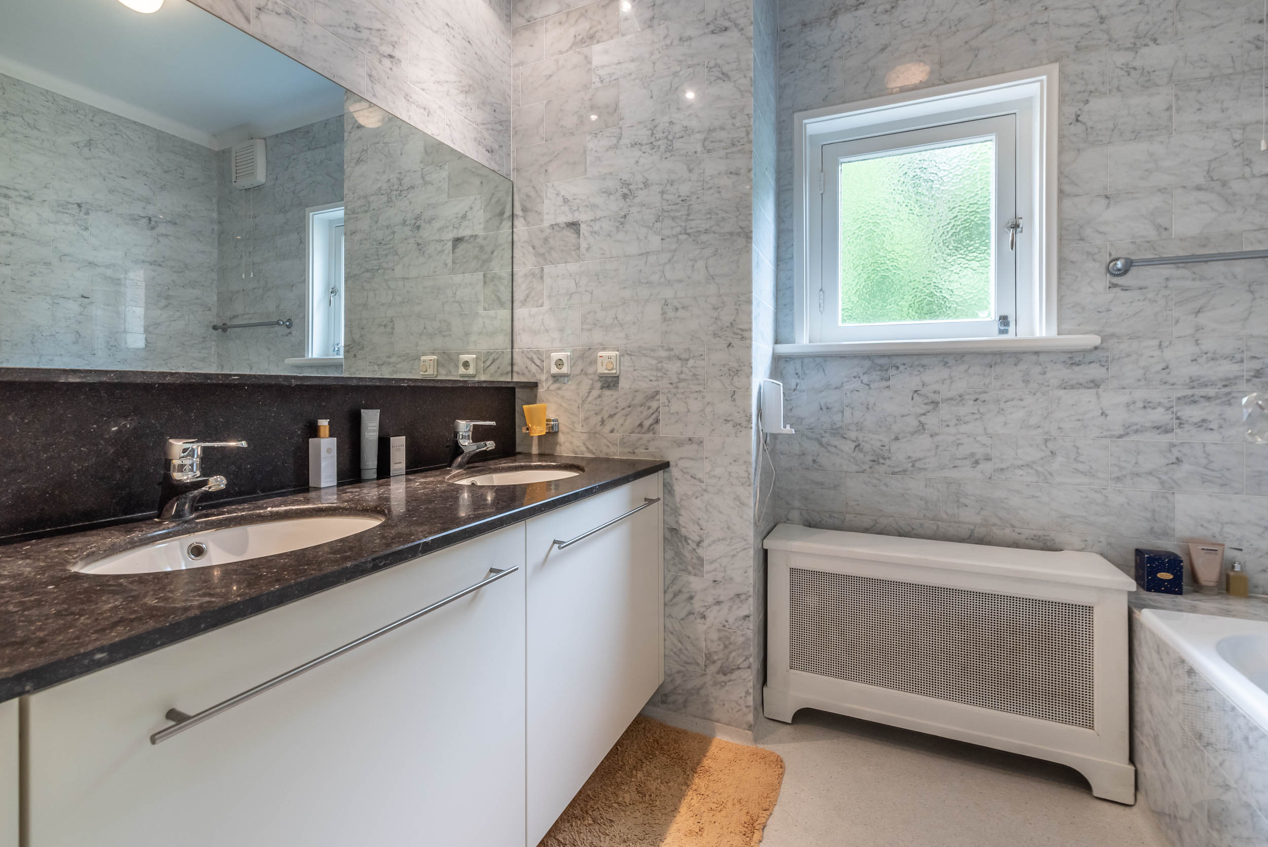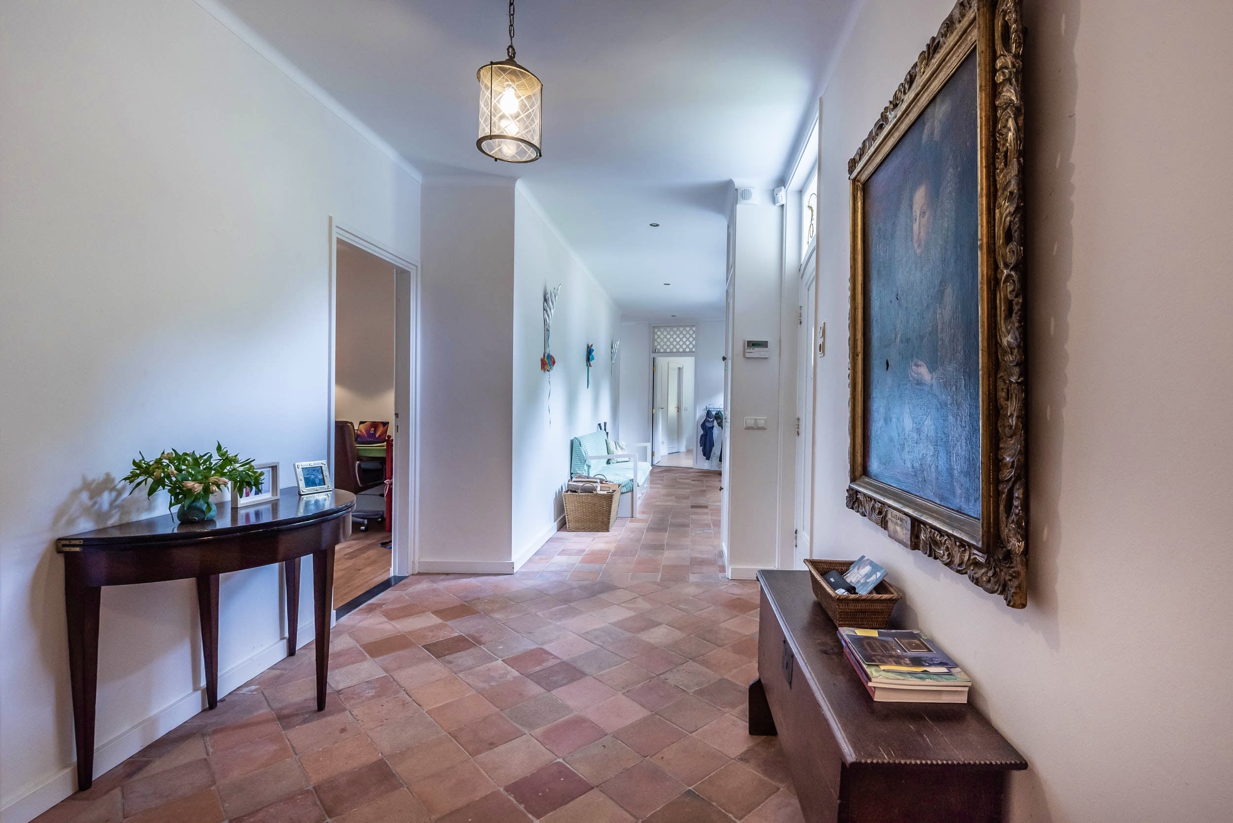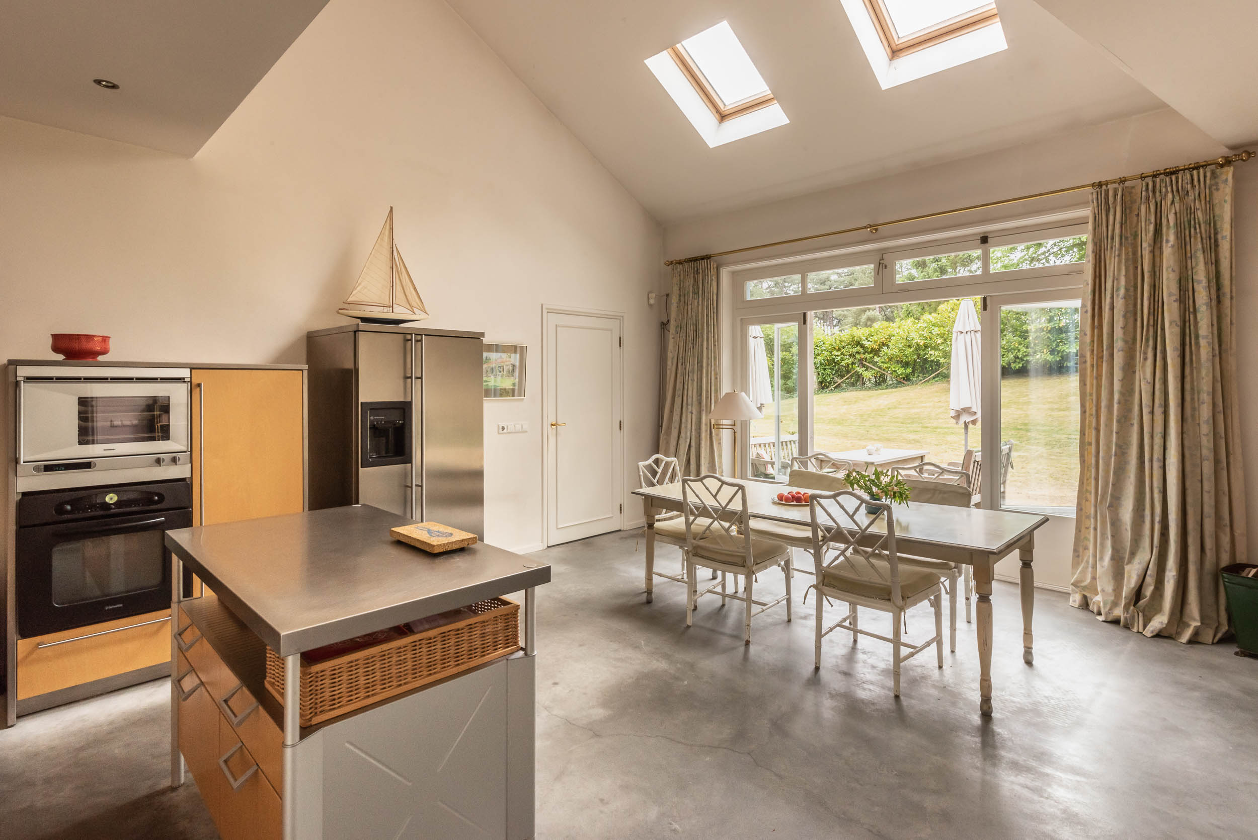 Extension from 2001: a lovely, spacious kitchen with high ceilings, a fireplace, a terrazzo floor with underfloor heating, and French doors that open onto a sunny terrace. The Bulthaup kitchen comes with a kitchen island and a range of appliances, including a Gaggenau steam oven. Deep pantry/utility room with utility sink. Two bedrooms, both of which join a bathroom with WC, bathtub, walk-in shower, double vanity unit and underfloor heating.