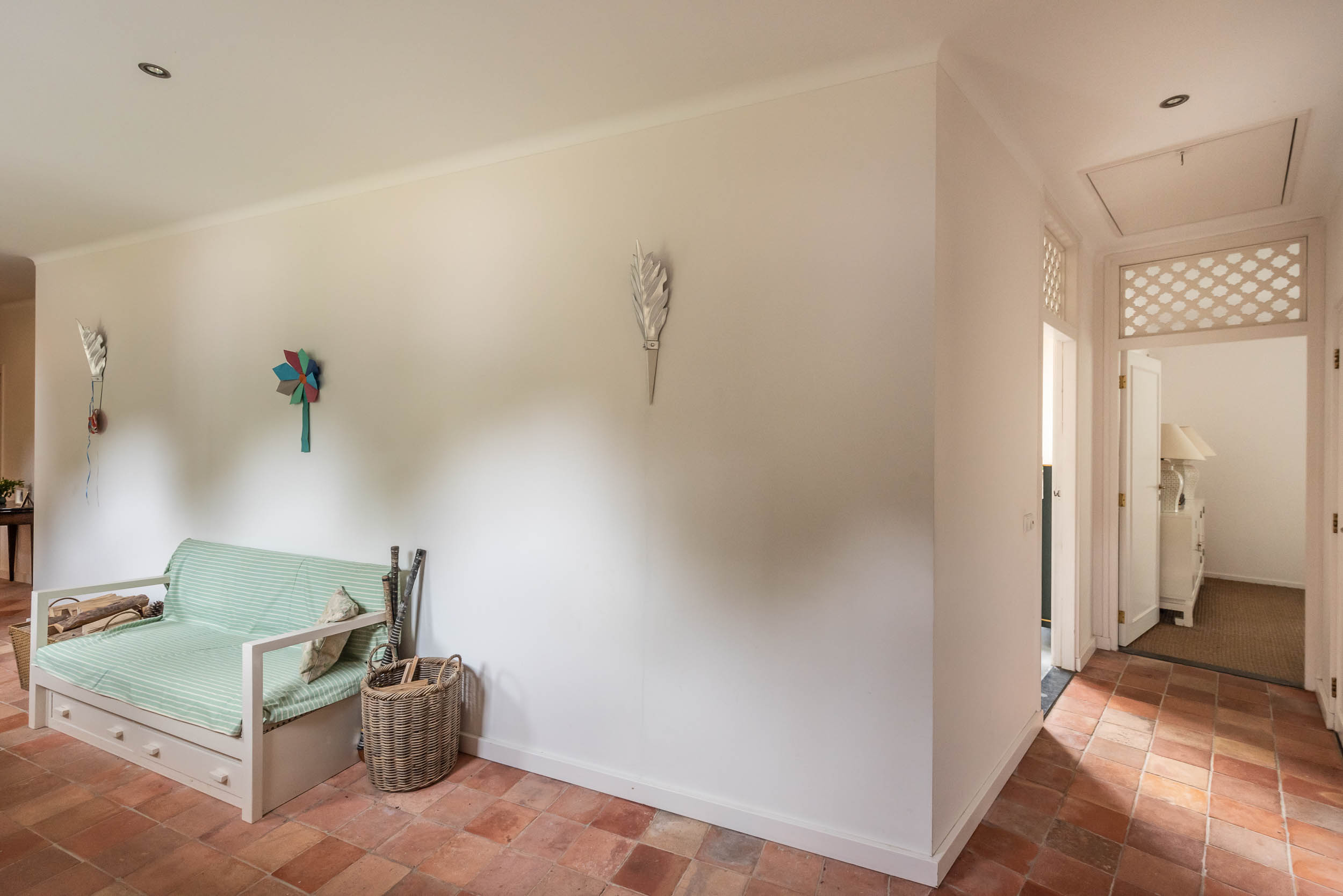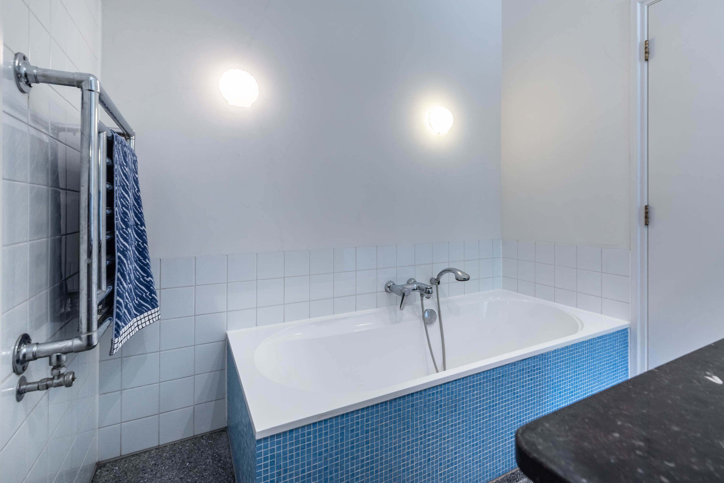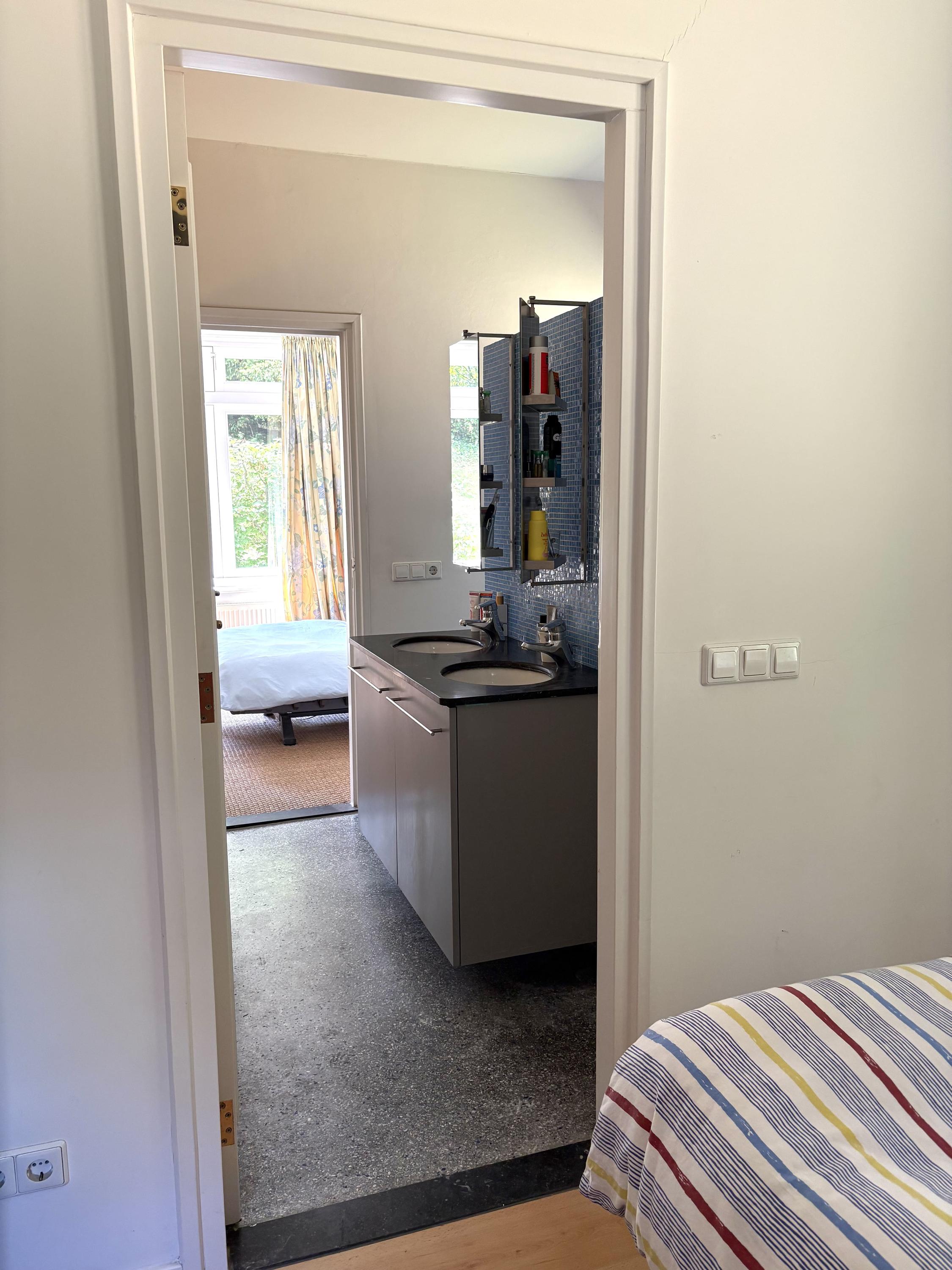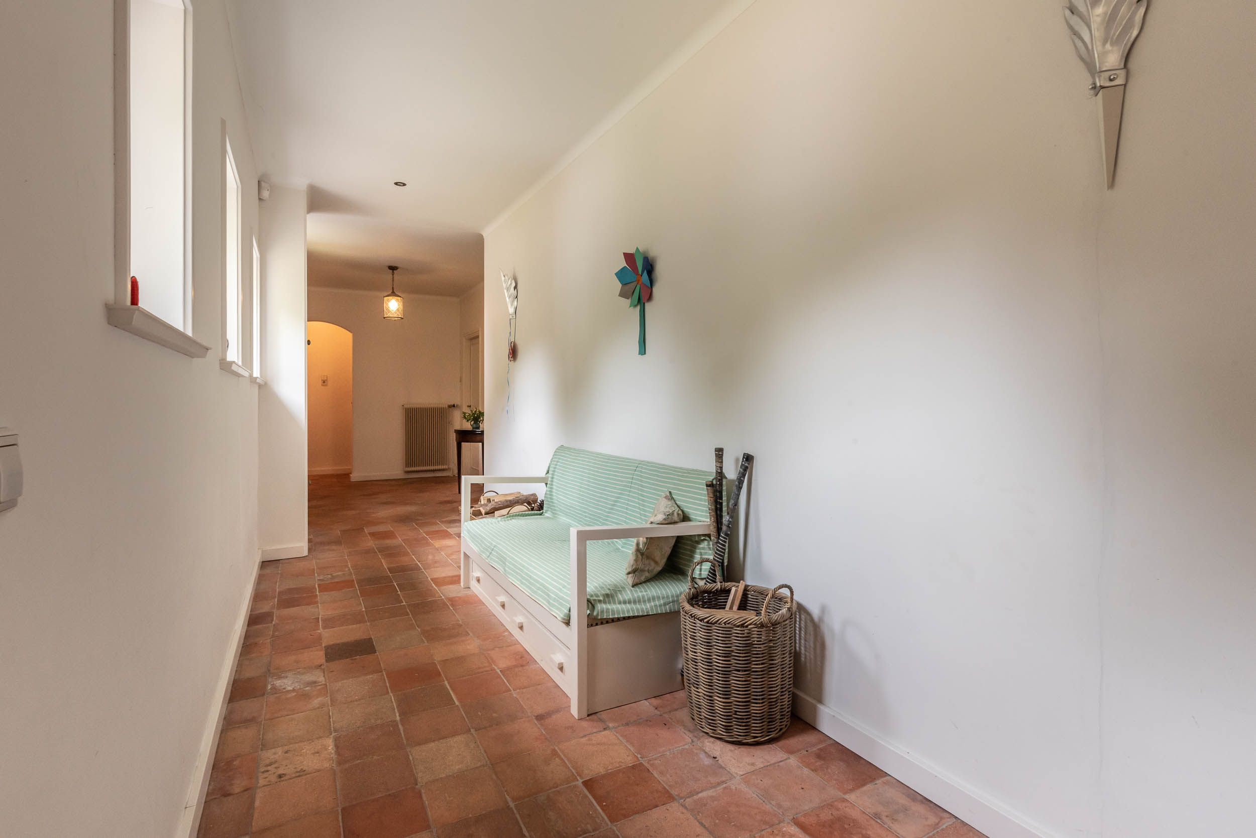 Extension from 2001: a lovely, spacious kitchen with high ceilings, a fireplace, a terrazzo floor with underfloor heating, and French doors that open onto a sunny terrace. The Bulthaup kitchen comes with a kitchen island and a range of appliances, including a Gaggenau steam oven. Deep pantry/utility room with utility sink. Two bedrooms, both of which join a bathroom with WC, bathtub, walk-in shower, double vanity unit and underfloor heating.