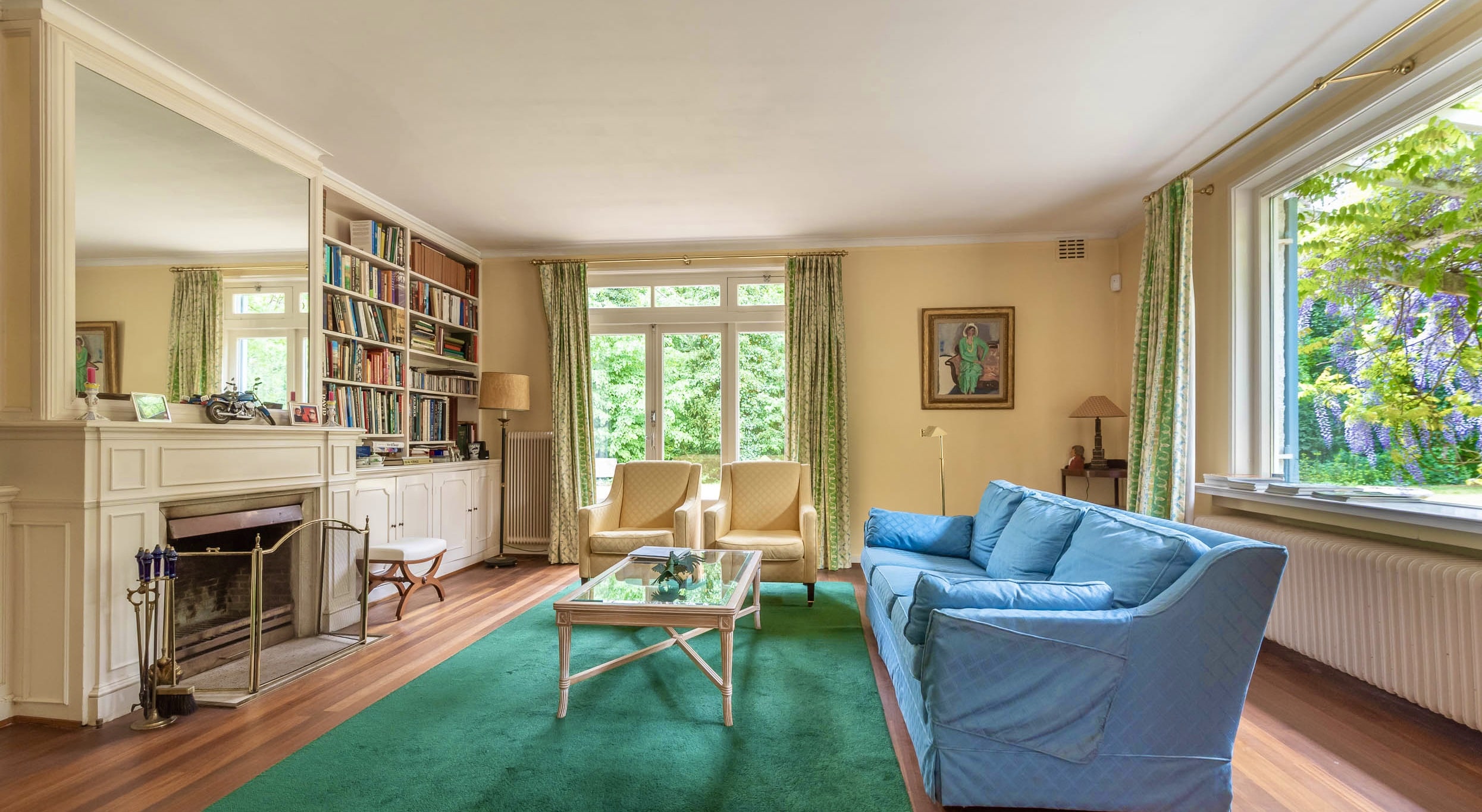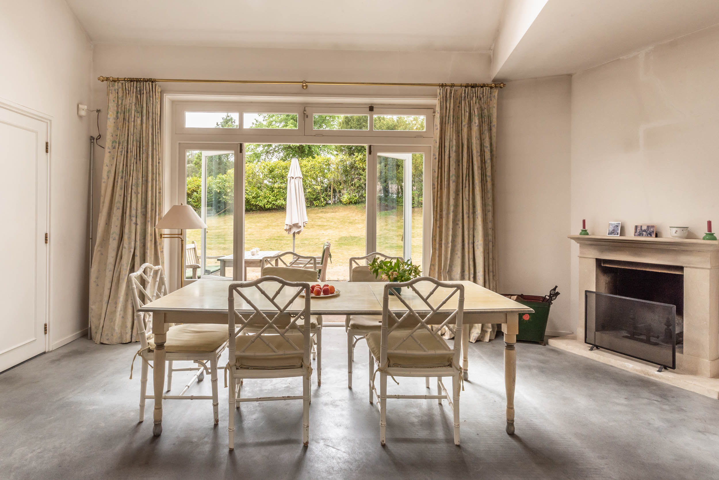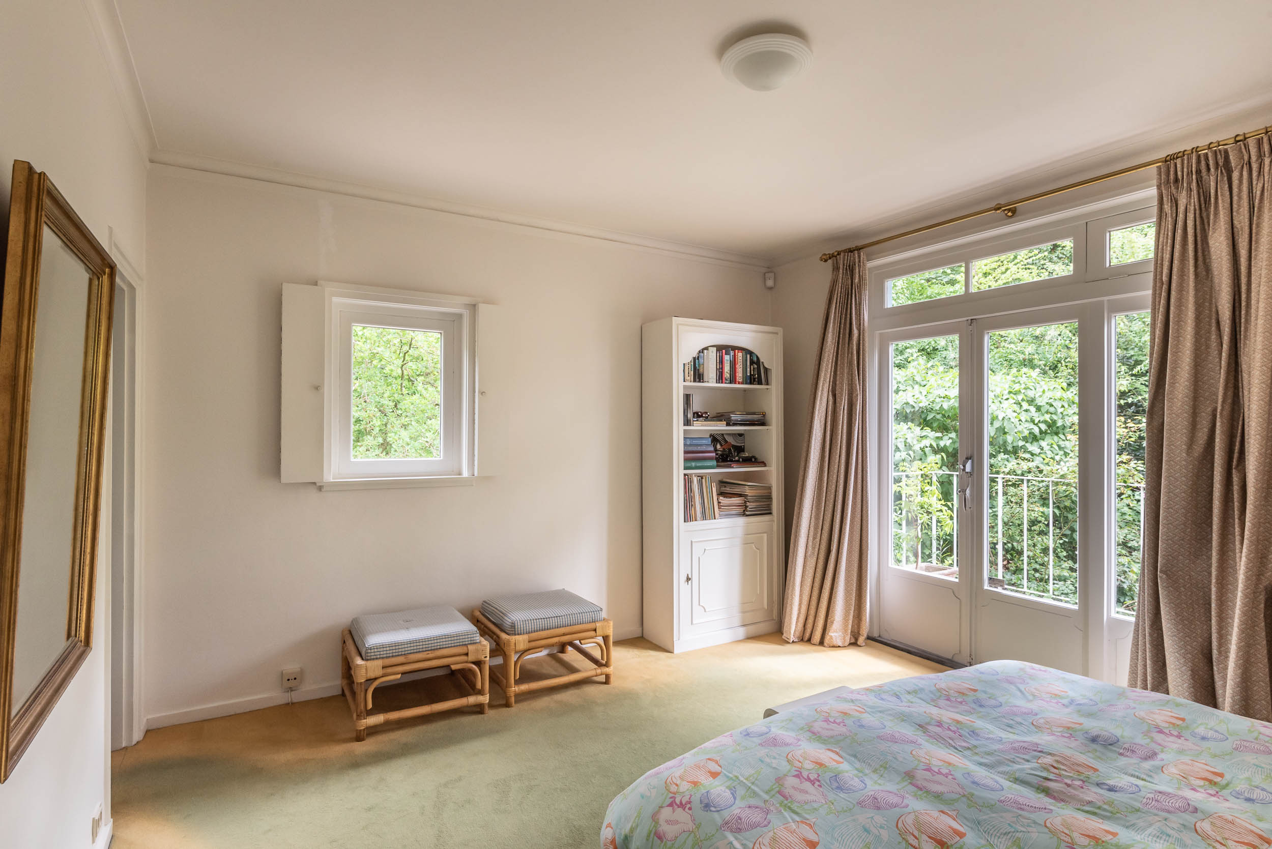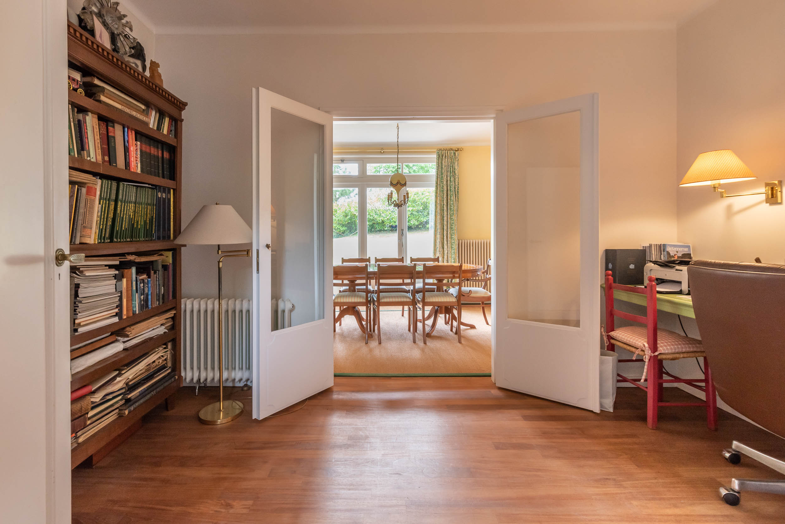 Original part: entrance, welcoming hallway with Piet Jonker tiled floor, passageway to separate cloakroom and WC with hand basin. Light and airy living room overlooking the beautiful garden fitted with a fireplace, parquet floor, custom-made bookcase and French doors to the garden. The living room has an open-plan connection to the dining room with a study that adjoins it. The hallway leads to the basement and garage, as well as three bedrooms and a second bathroom. The master bedroom comes with an en suite bathroom with a bathtub, a double vanity unit and underfloor heating, plus walk-in wardrobe and French doors that open onto a balcony and garden.