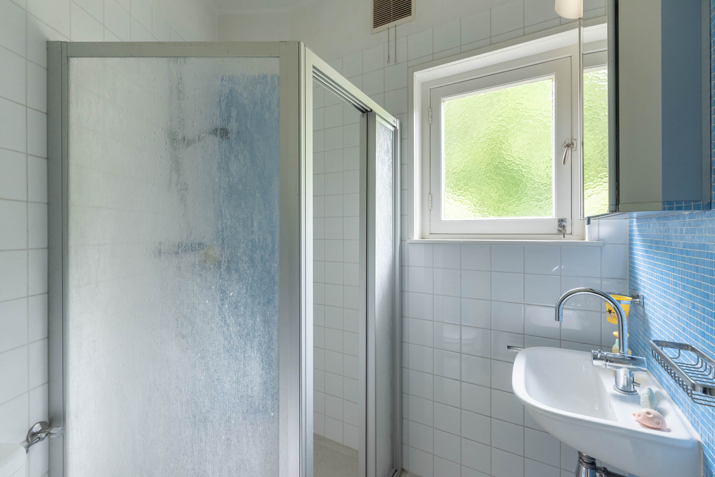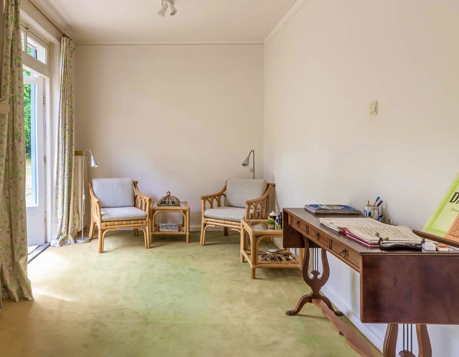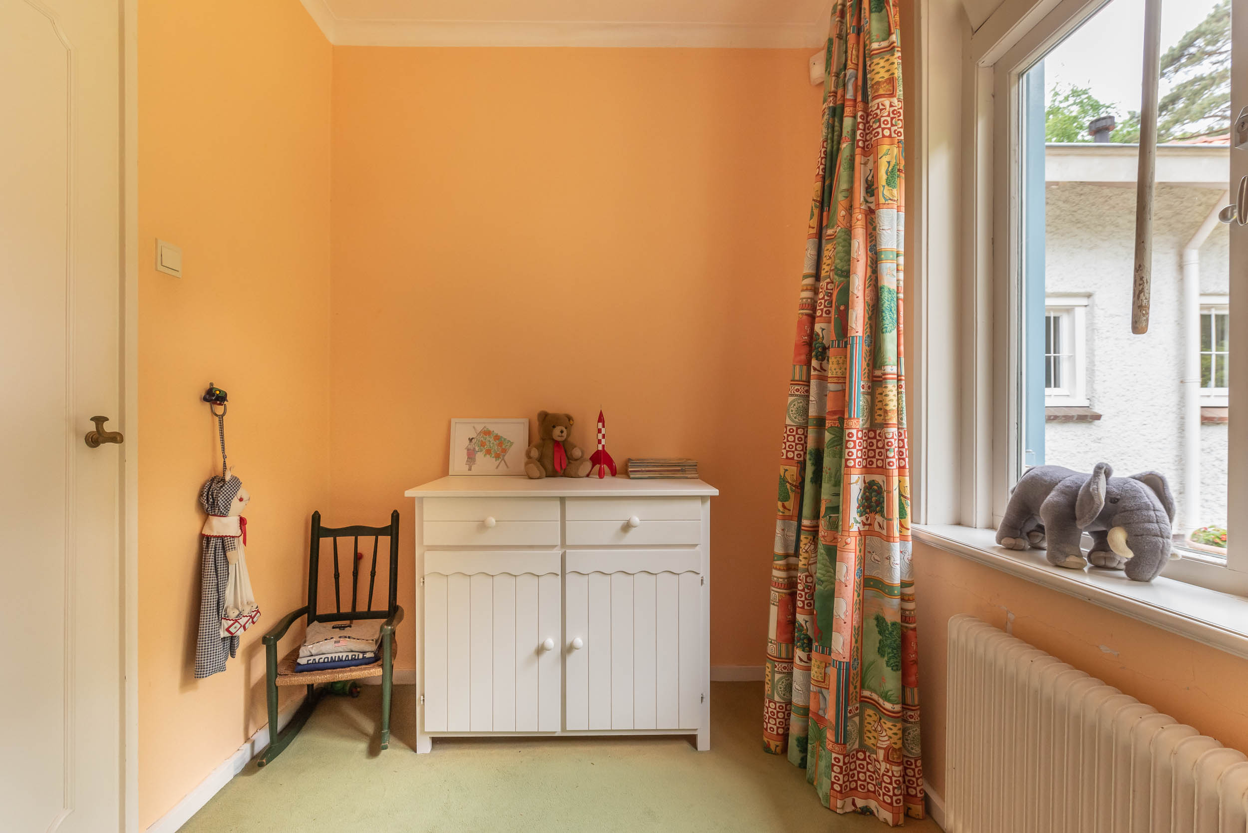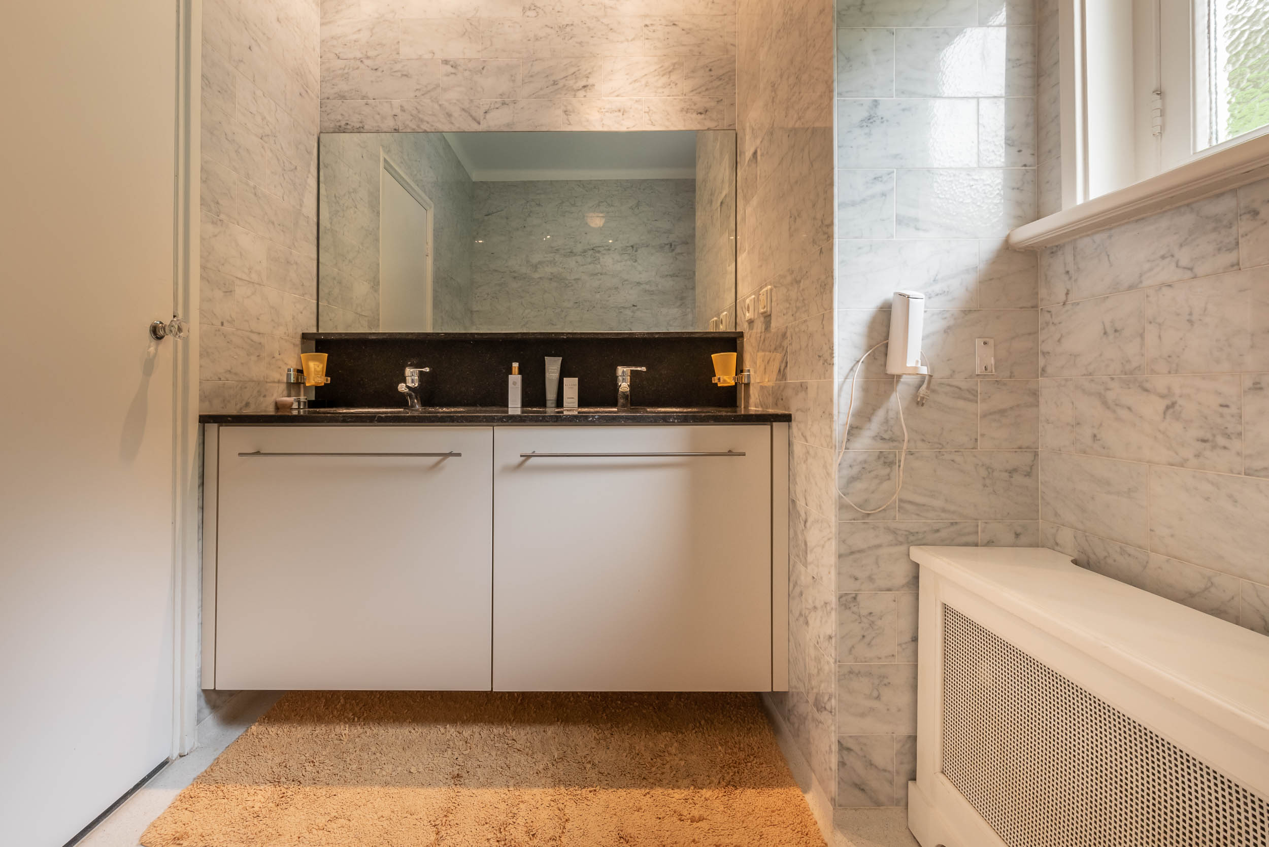 Original part: entrance, welcoming hallway with Piet Jonker tiled floor, passageway to separate cloakroom and WC with hand basin. Light and airy living room overlooking the beautiful garden fitted with a fireplace, parquet floor, custom-made bookcase and French doors to the garden. The living room has an open-plan connection to the dining room with a study that adjoins it. The hallway leads to the basement and garage, as well as three bedrooms and a second bathroom. The master bedroom comes with an en suite bathroom with a bathtub, a double vanity unit and underfloor heating, plus walk-in wardrobe and French doors that open onto a balcony and garden.