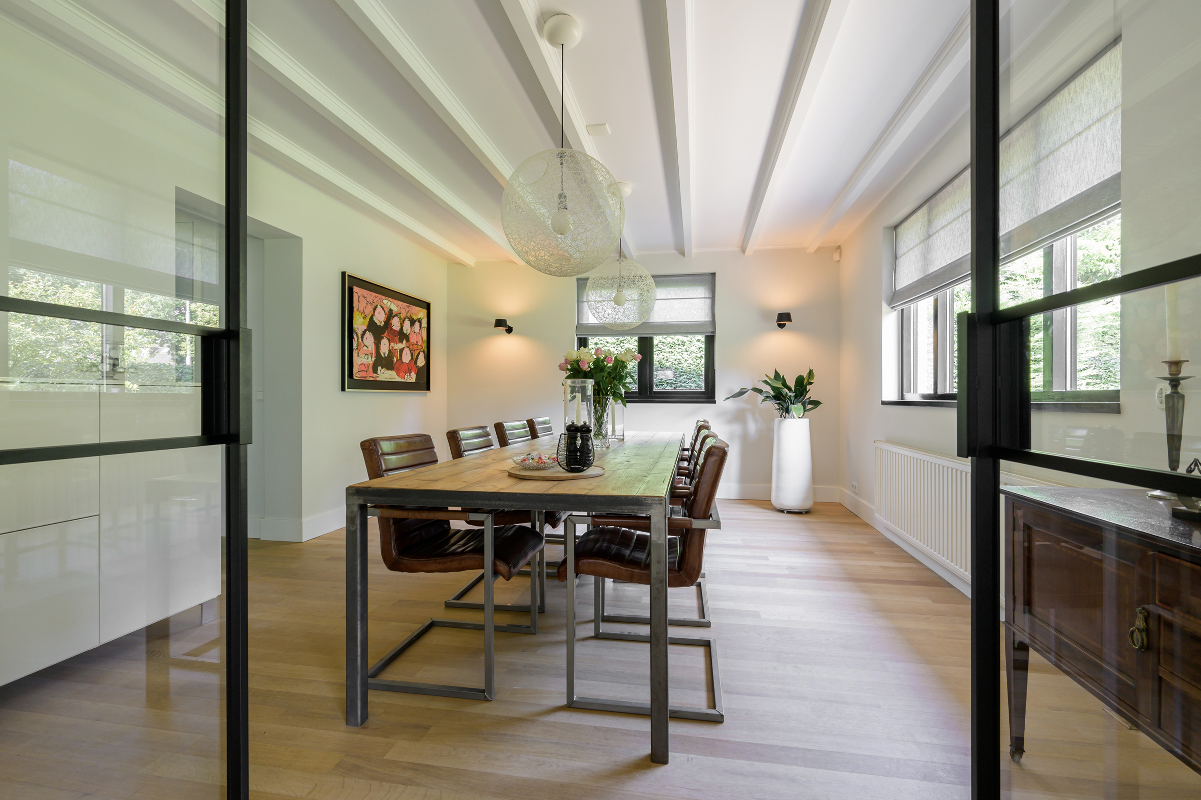 From the sitting room, you also have access to the dining room via glass doors. From the dining room, you can access the kitchen.