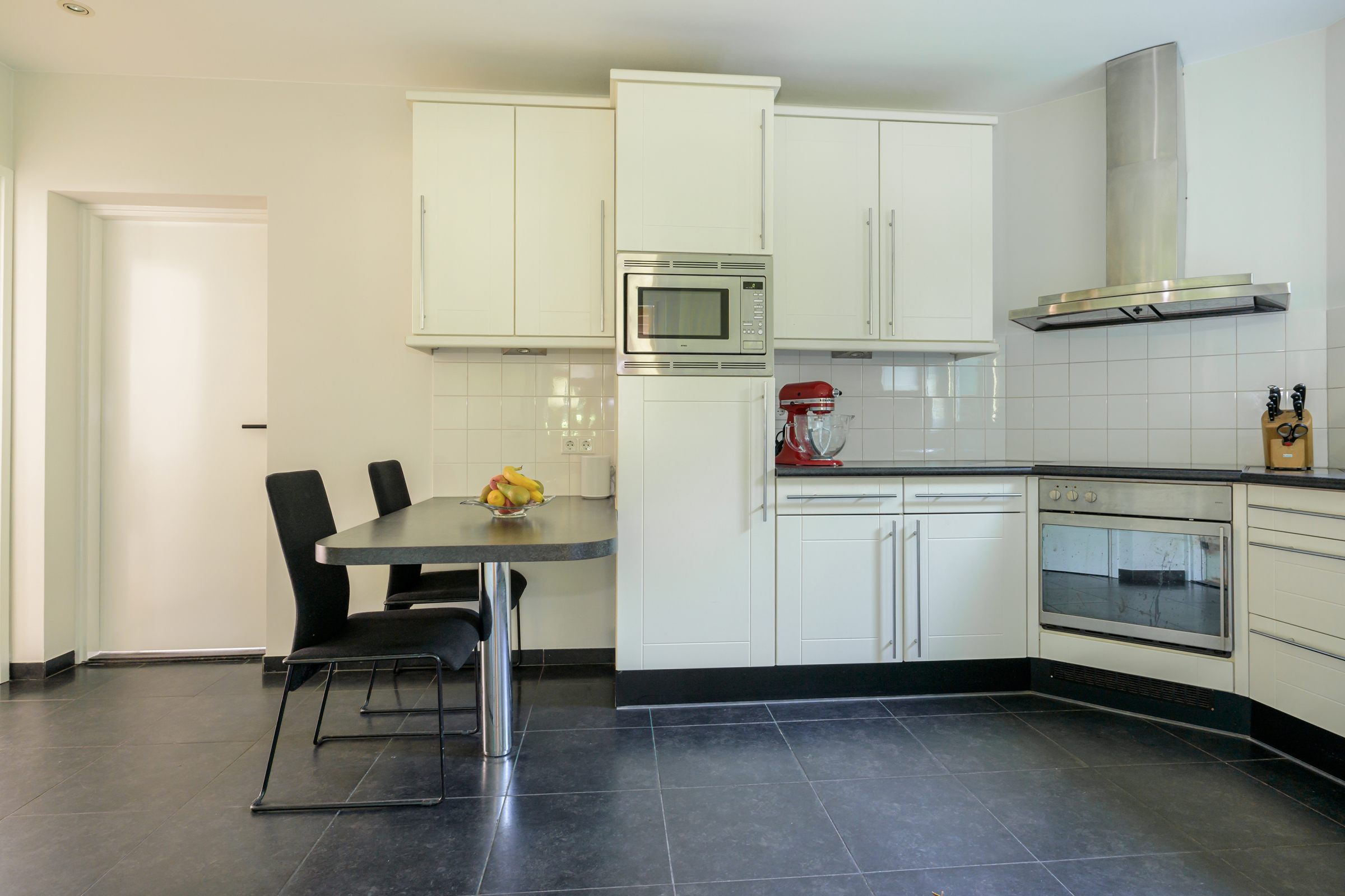 Utility room with (anthracite) tiled floor. Here you will find the connections for the washing machines, wall cabinets, and extra space for a refrigerator or freezer.