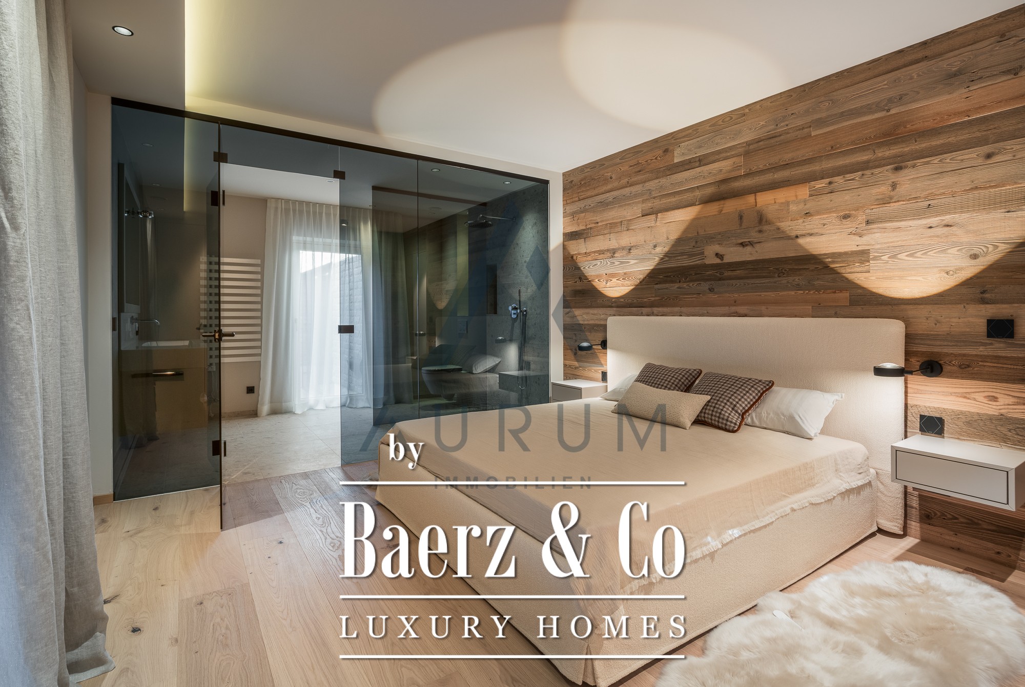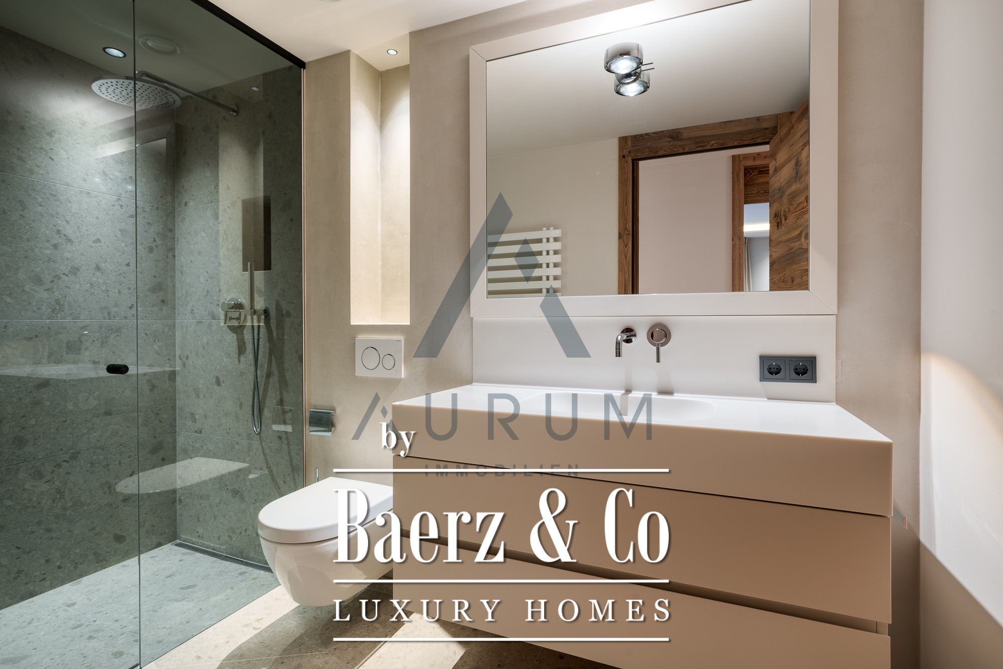 Within its 123 m² of living space, two bedrooms and two bathrooms integrate harmoniously with expansive living areas and a sauna, creating a sense of openness anchored by elemental materials and careful spatial planning. Floor heating ensures year-round comfort, while the Loxone BUS system and motorized blinds add contemporary efficiency. A guest WC, elegant lift access, and basement storage support daily living with seamless flow.