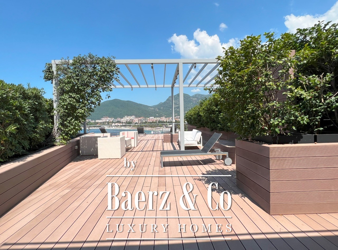 Apartment Budva offers 286m² of meticulously arranged living space within a renowned luxury resort, only 50 meters from the Adriatic Sea and its sandy stretch. This apartment Budva composition includes a welcoming hallway, a generous living room seamlessly connected to a kitchen and dining area, two bedrooms, and two bathrooms. A large rooftop terrace frames sweeping views of Budva Bay, the sea, and encircling mountains, inviting both quiet contemplation and open gatherings.