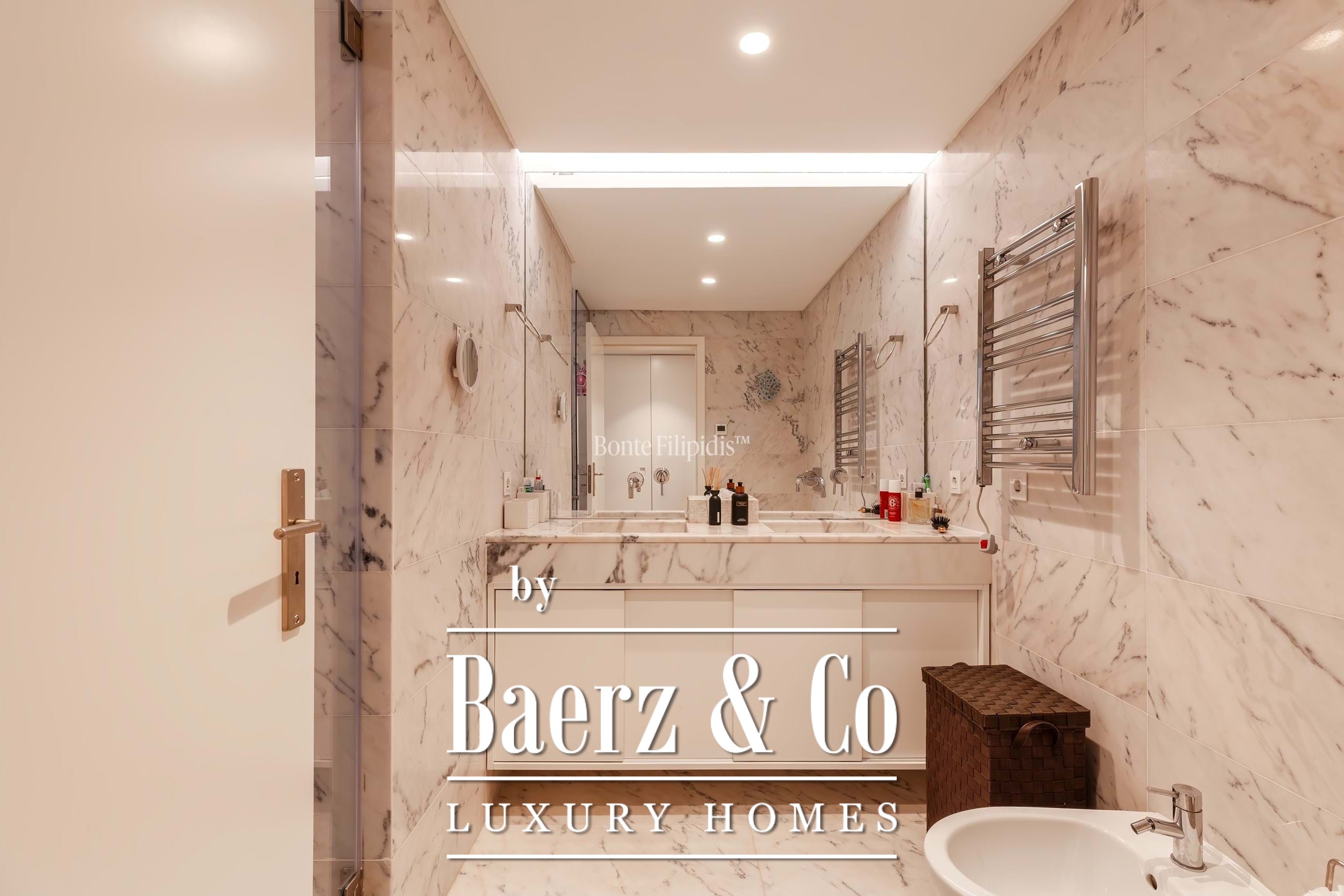 The apartment comprises three bedrooms, including a private suite, and three bathrooms, retaining an understated atmosphere of comfort and privacy. A fully equipped kitchen anchors the space for living and entertaining. Essential amenities include air conditioning, central heating, storage, and two indoor parking spaces, underscoring a seamless, modern lifestyle.