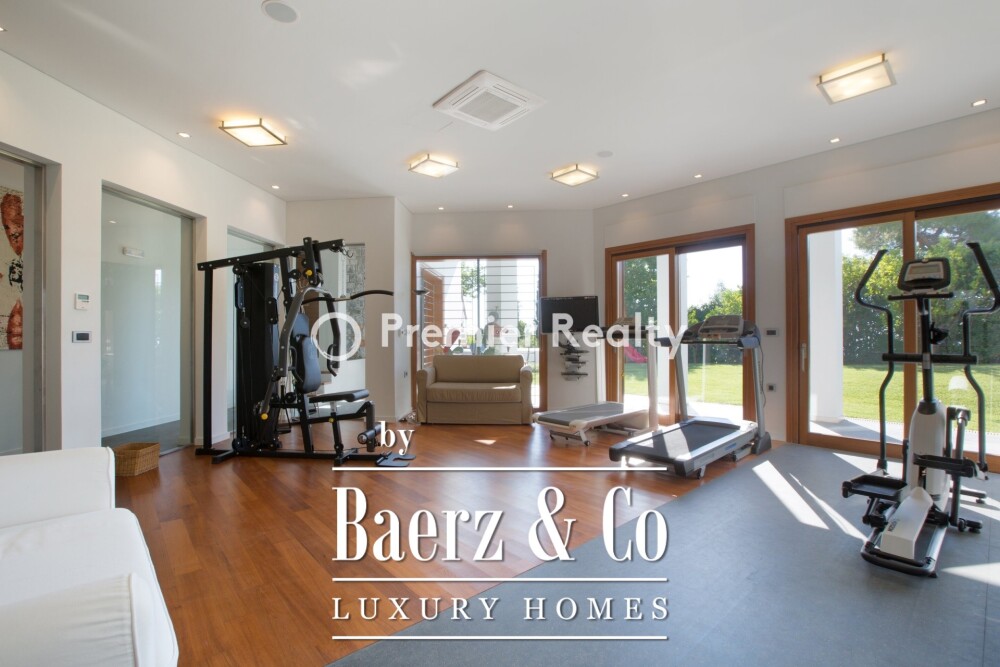 Indoors and out, the villa encourages an unhurried pace. An infinity heated pool, ecologically purified and measuring 11 by 7 metres, anchors landscaped Mediterranean gardens. A poolside bar, outdoor dining, and shaded lounges frame spaces for year-round alfresco living. The property’s spa and wellness offerings include a gym, a Turkish steam bath, a Scandinavian sauna, and massage areas with views of the gardens.